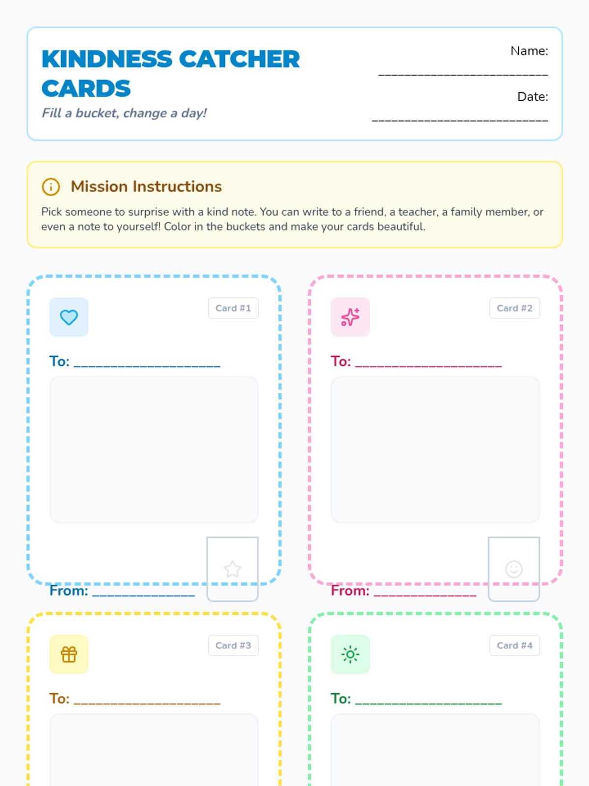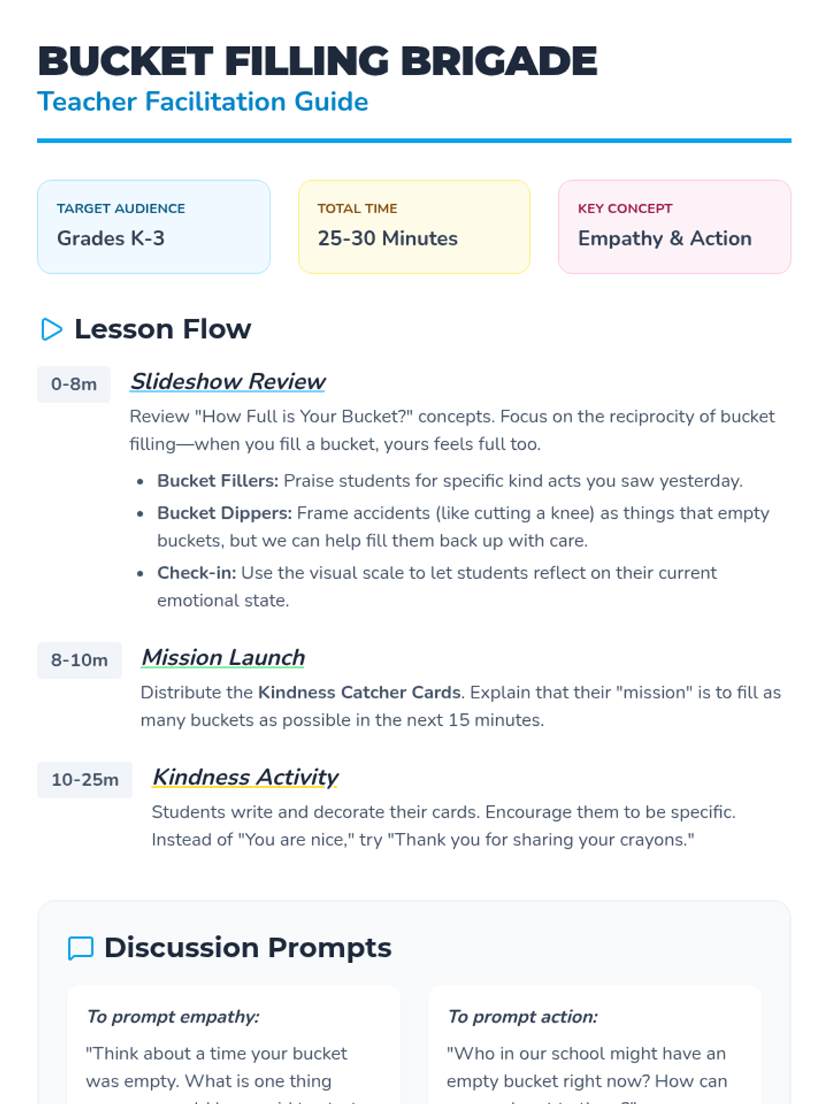 A social-emotional learning lesson focused on the 'bucket filling' concept, reviewing how actions affect others' emotions and engaging students in a 15-minute kindness activity.