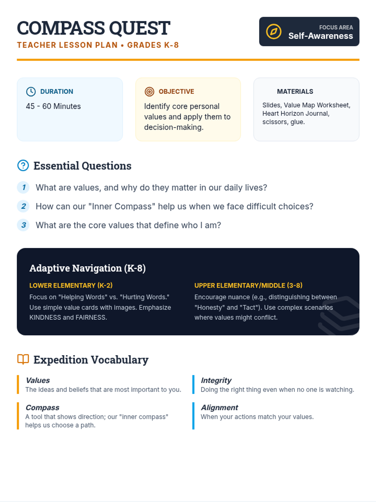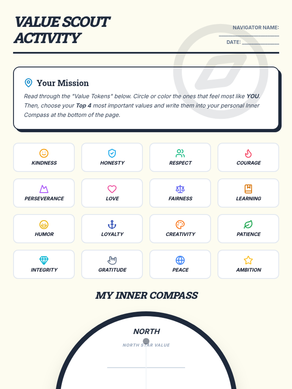 This lesson helps students identify their core values and understand how these beliefs guide their decisions and actions. Through a nautical-themed exploration, students will map out their personal 'inner compass' to navigate life's choices with integrity.