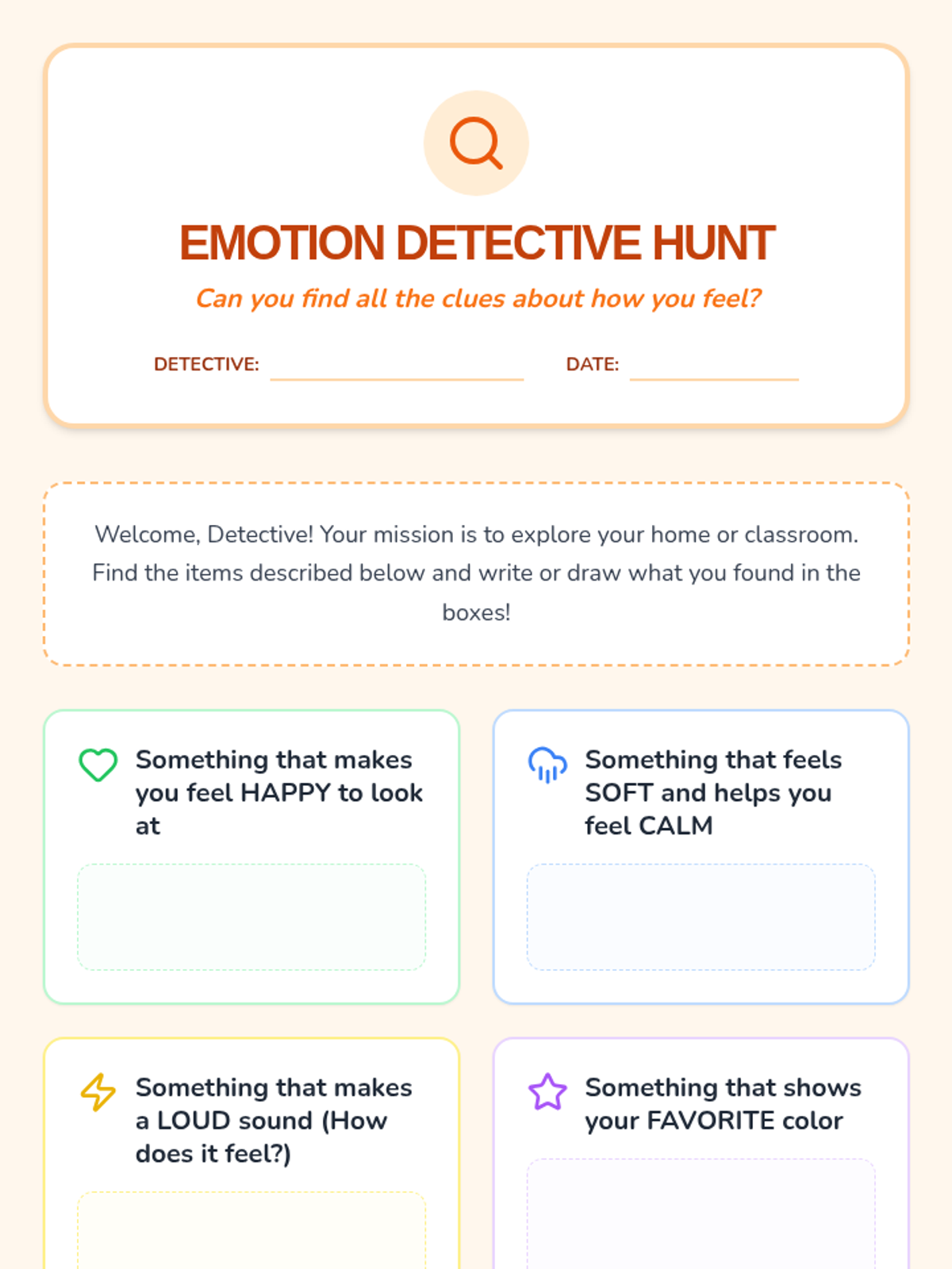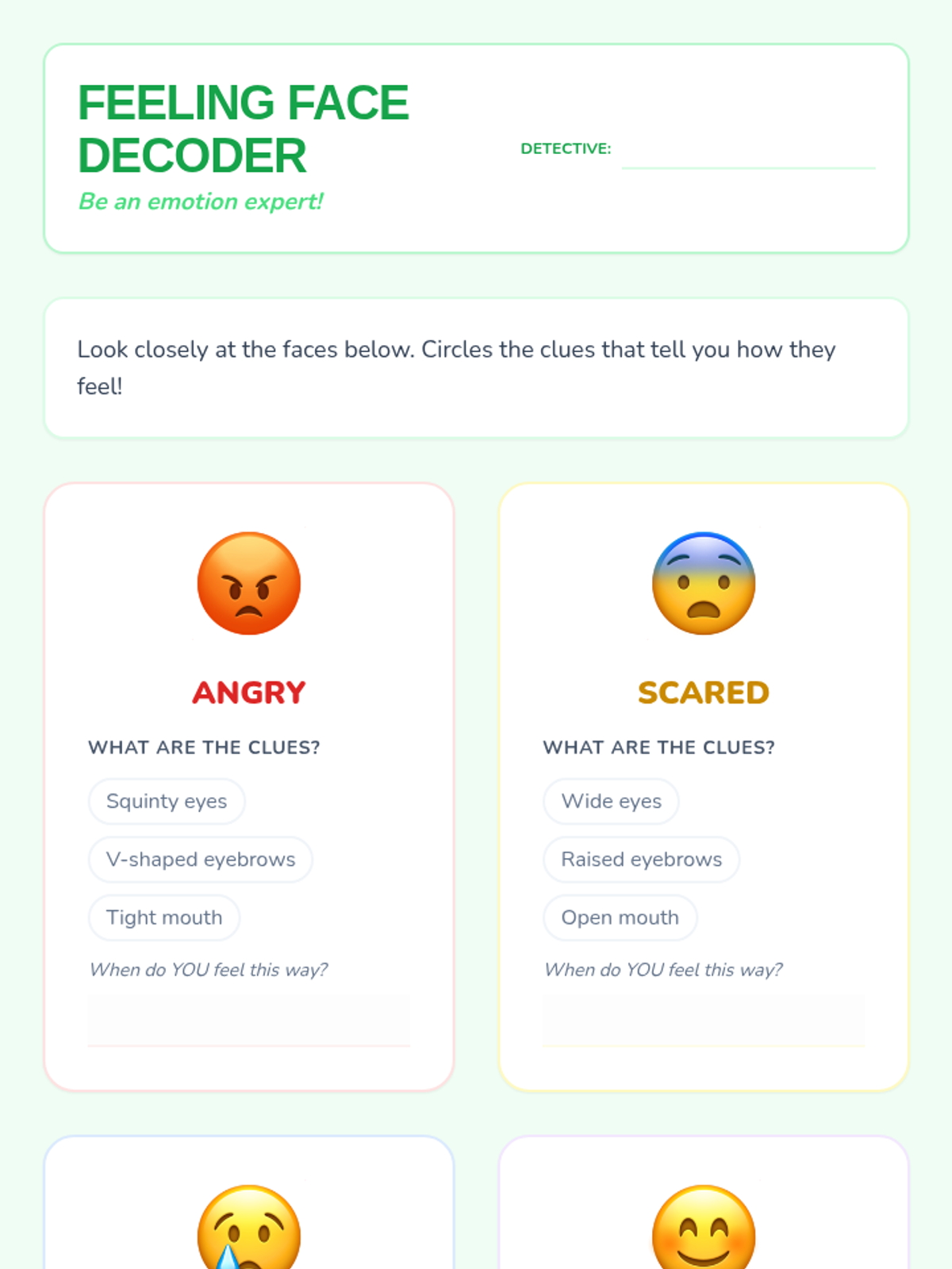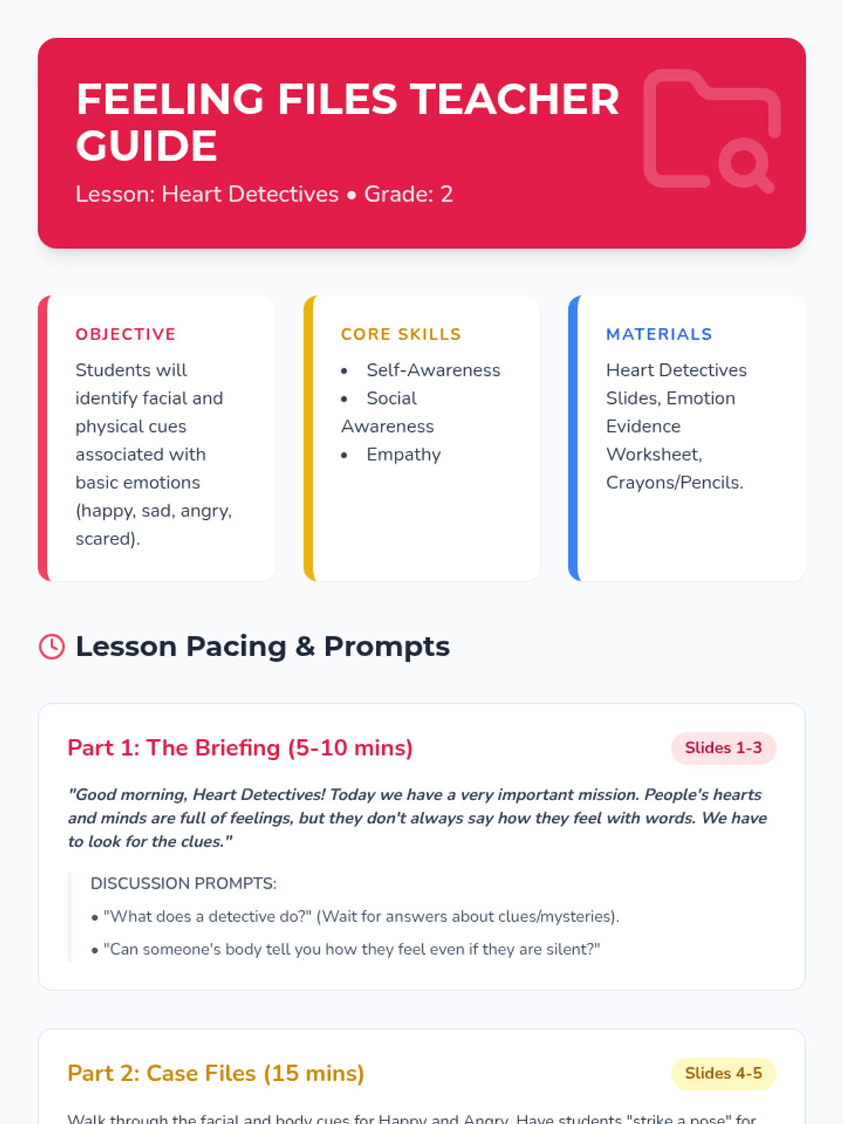 An introductory lesson where students act as 'Heart Detectives' to identify physical and facial cues associated with different feelings.
