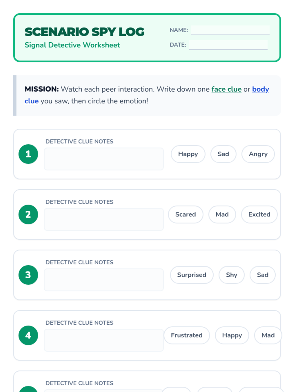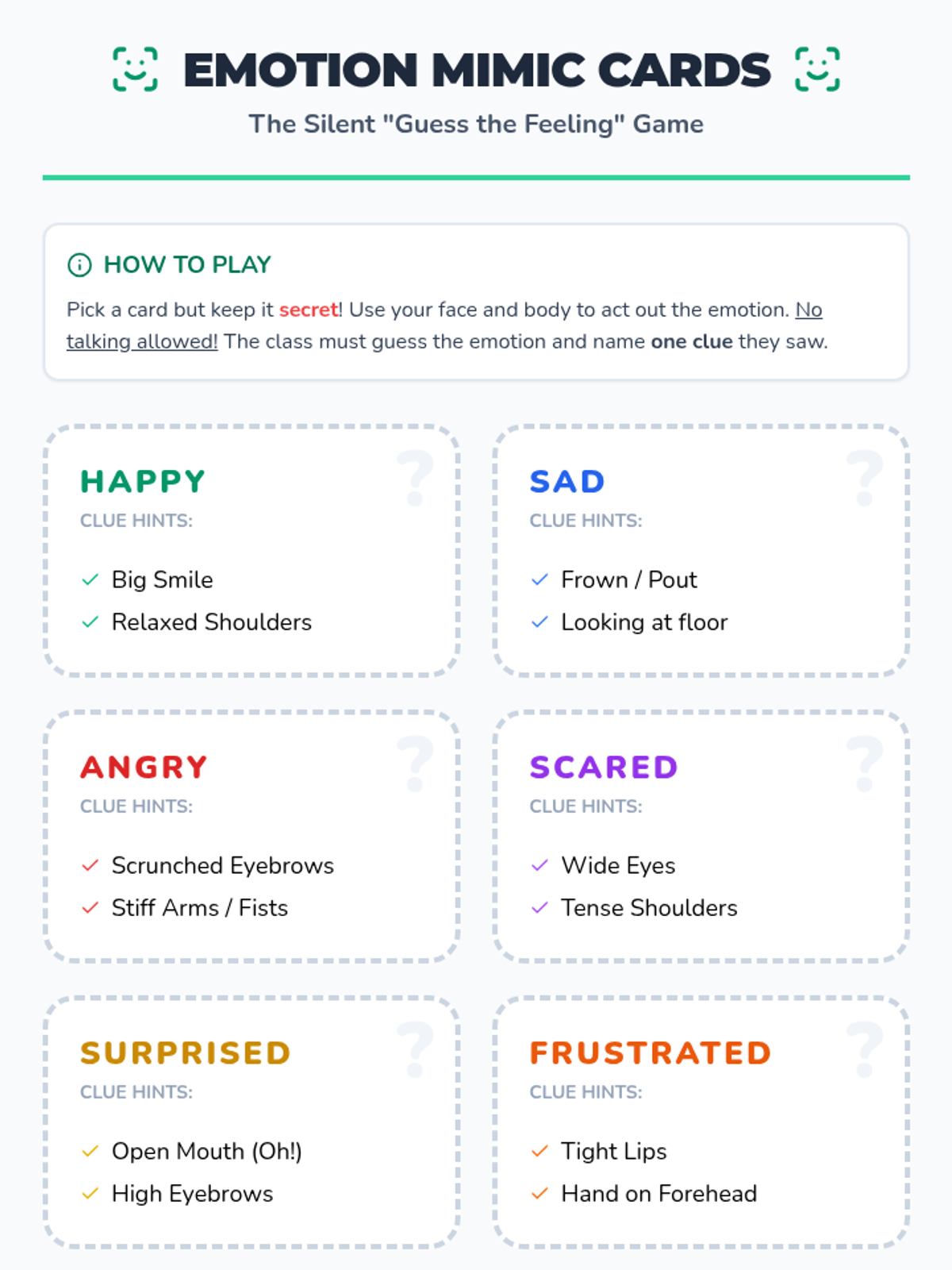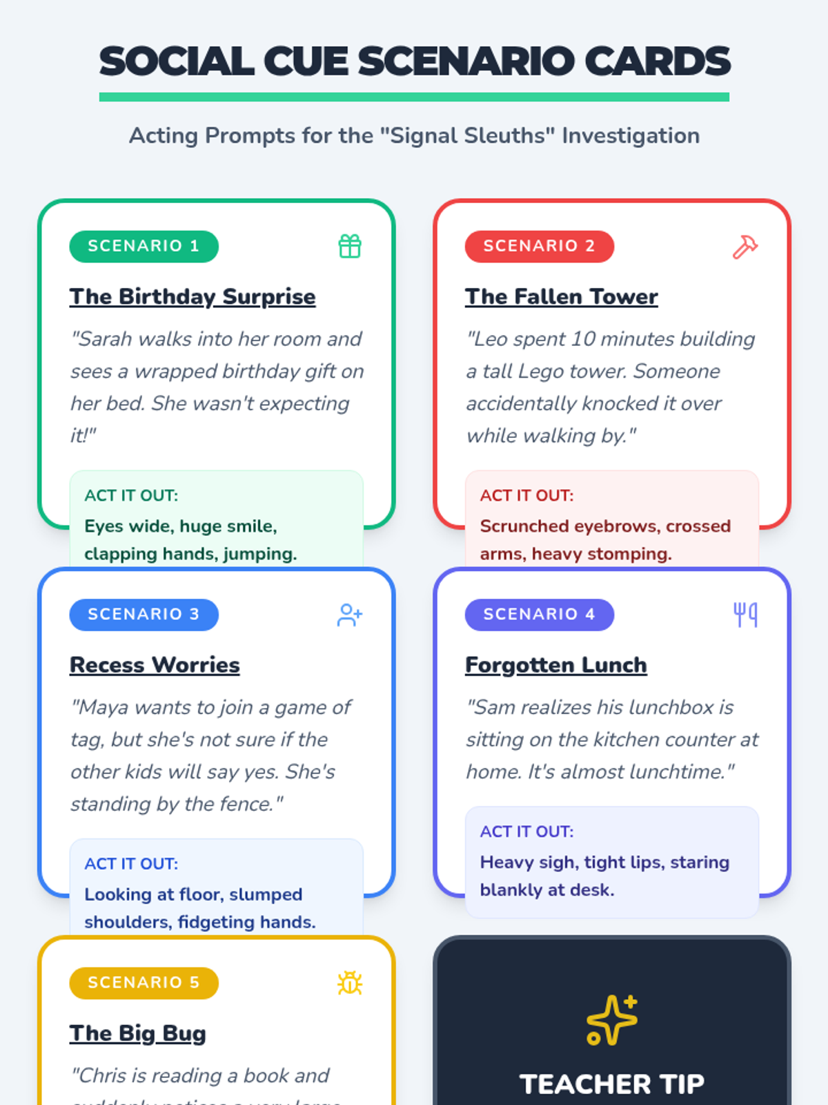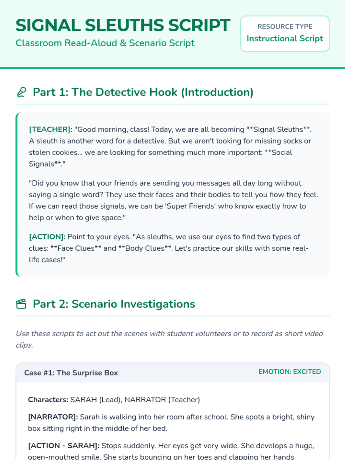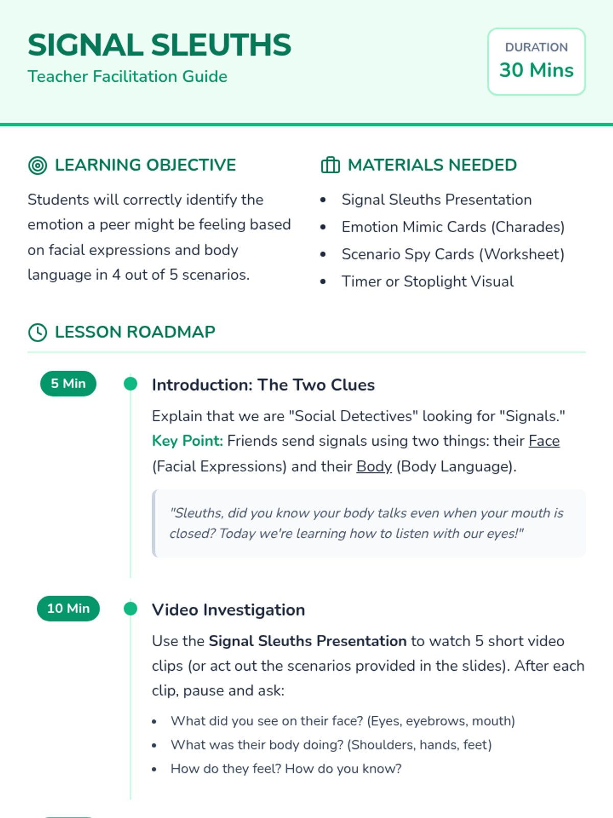 A 30-minute social-emotional learning lesson for 2nd graders to help them identify and interpret non-verbal social cues like facial expressions and body language to build empathy and improve peer interactions.