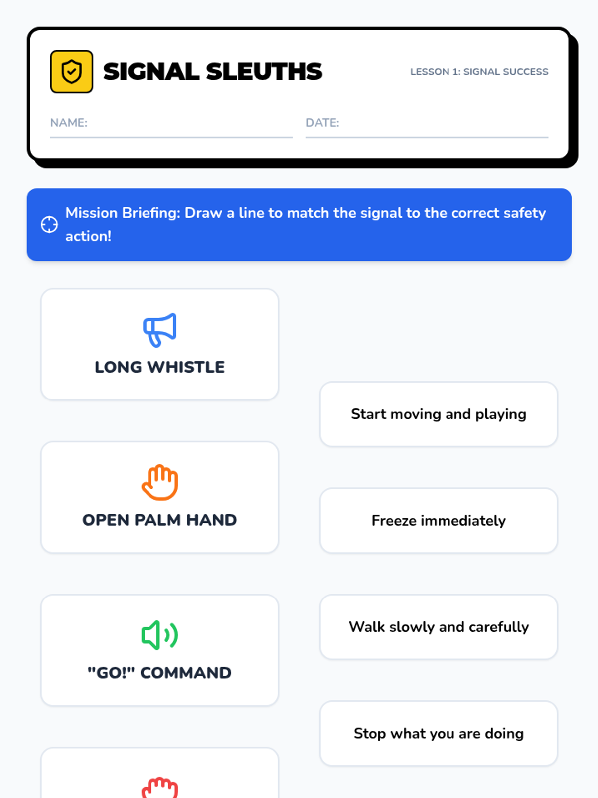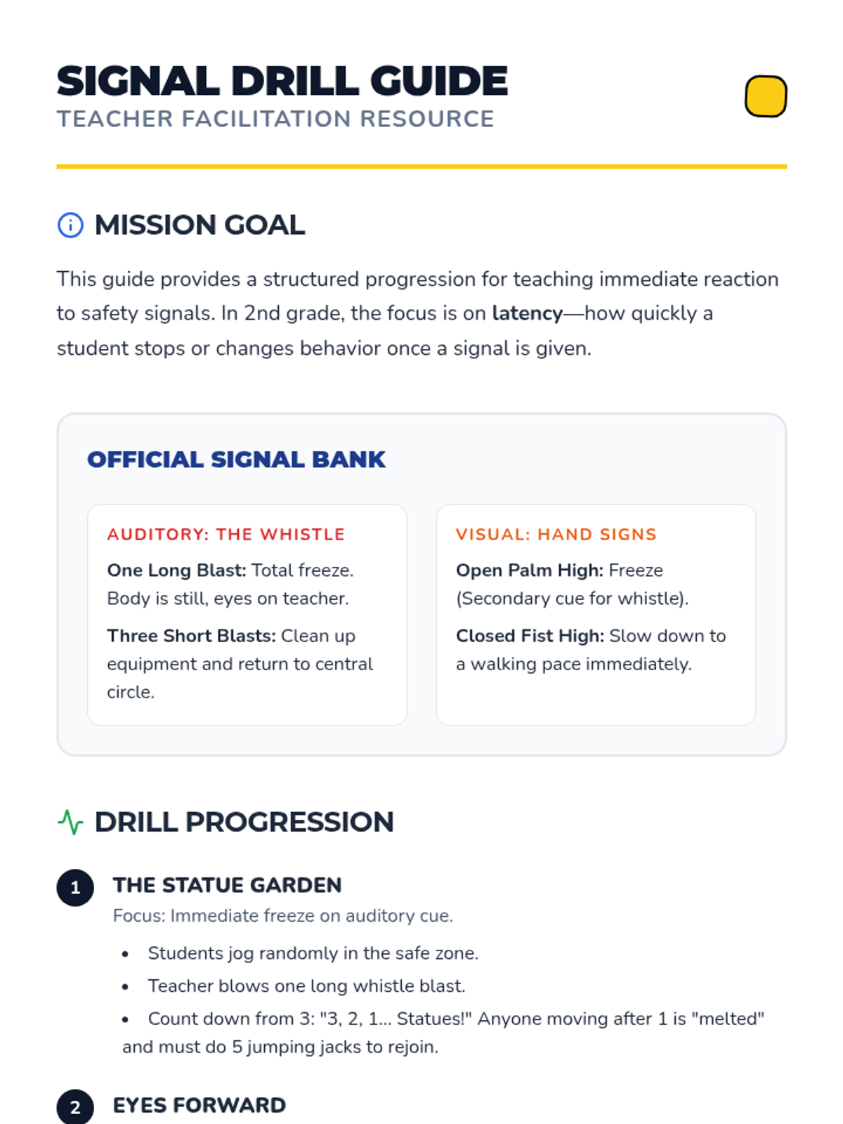 Students practice immediate reactions to auditory and visual signals (whistles, hand signs, voice) to ensure safety during physical activities.