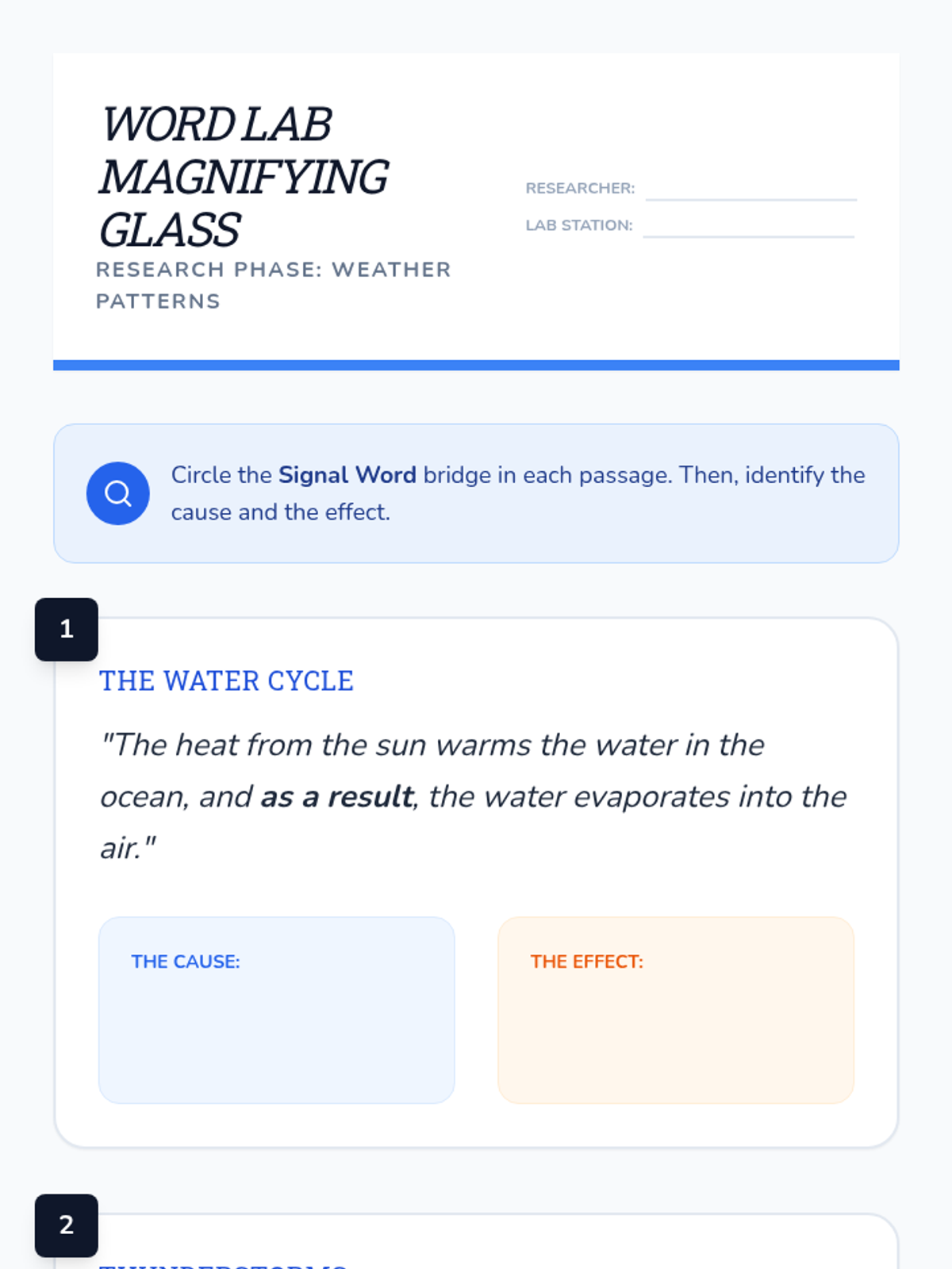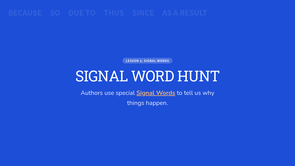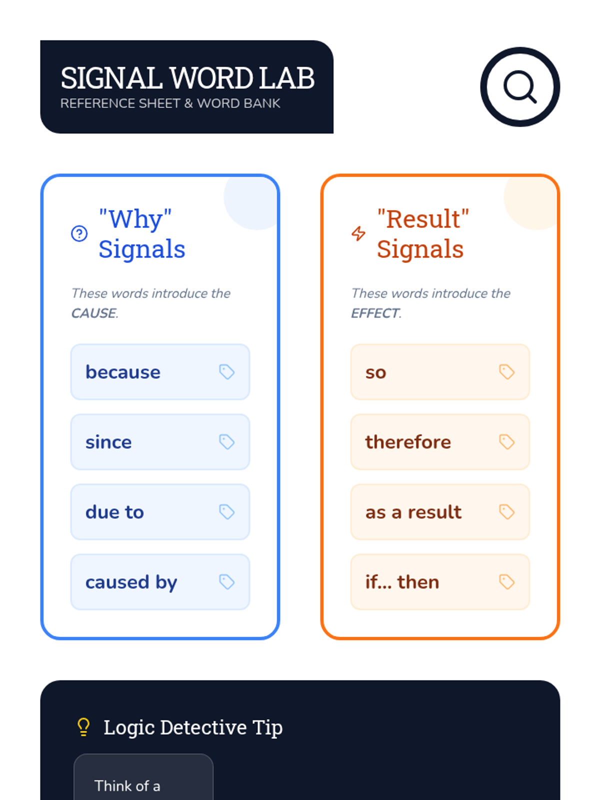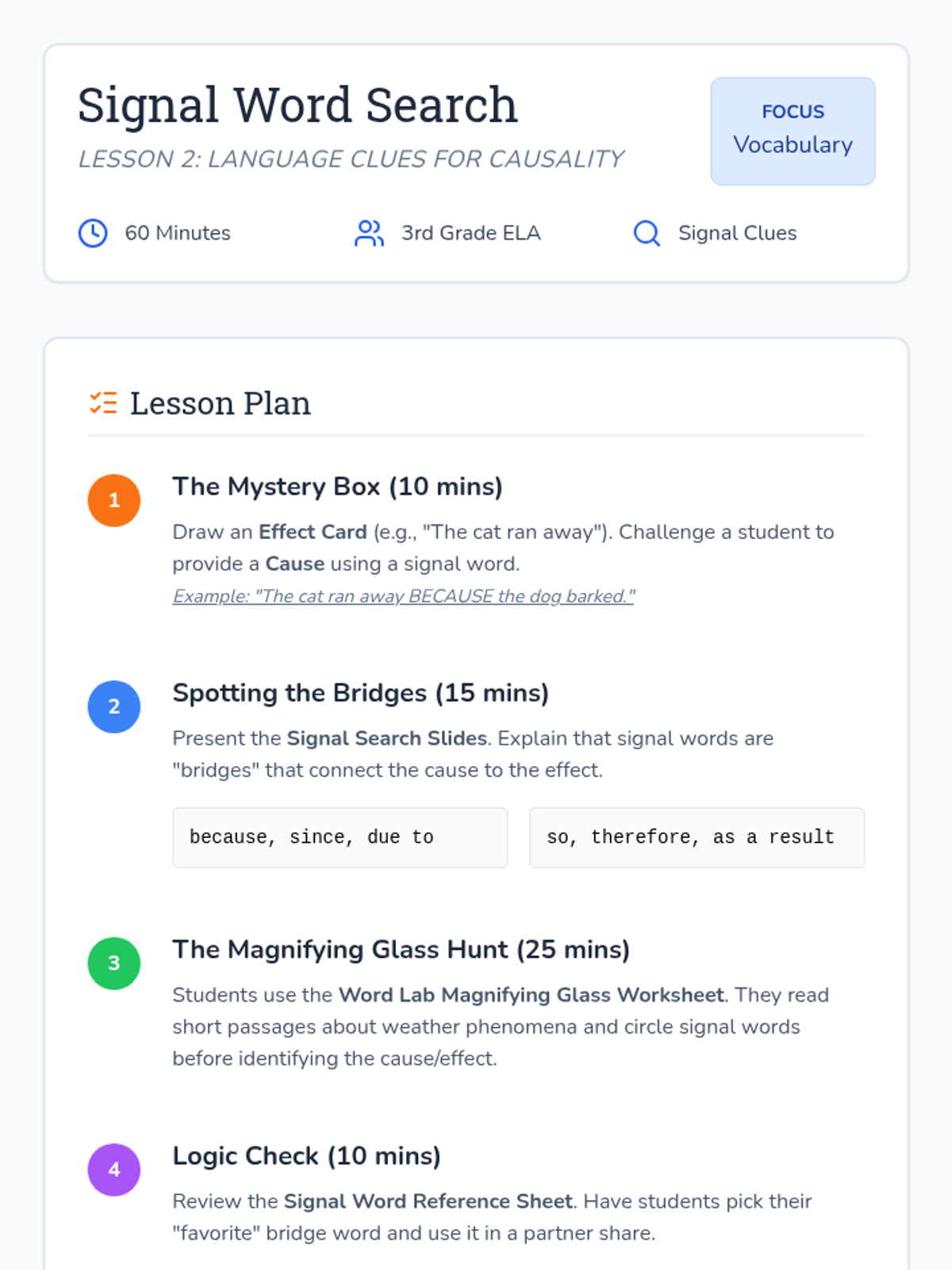 The class investigates specific vocabulary such as 'because,' 'due to,' 'so,' and 'as a result.' Students highlight these words in texts to locate cause-and-effect pairs.