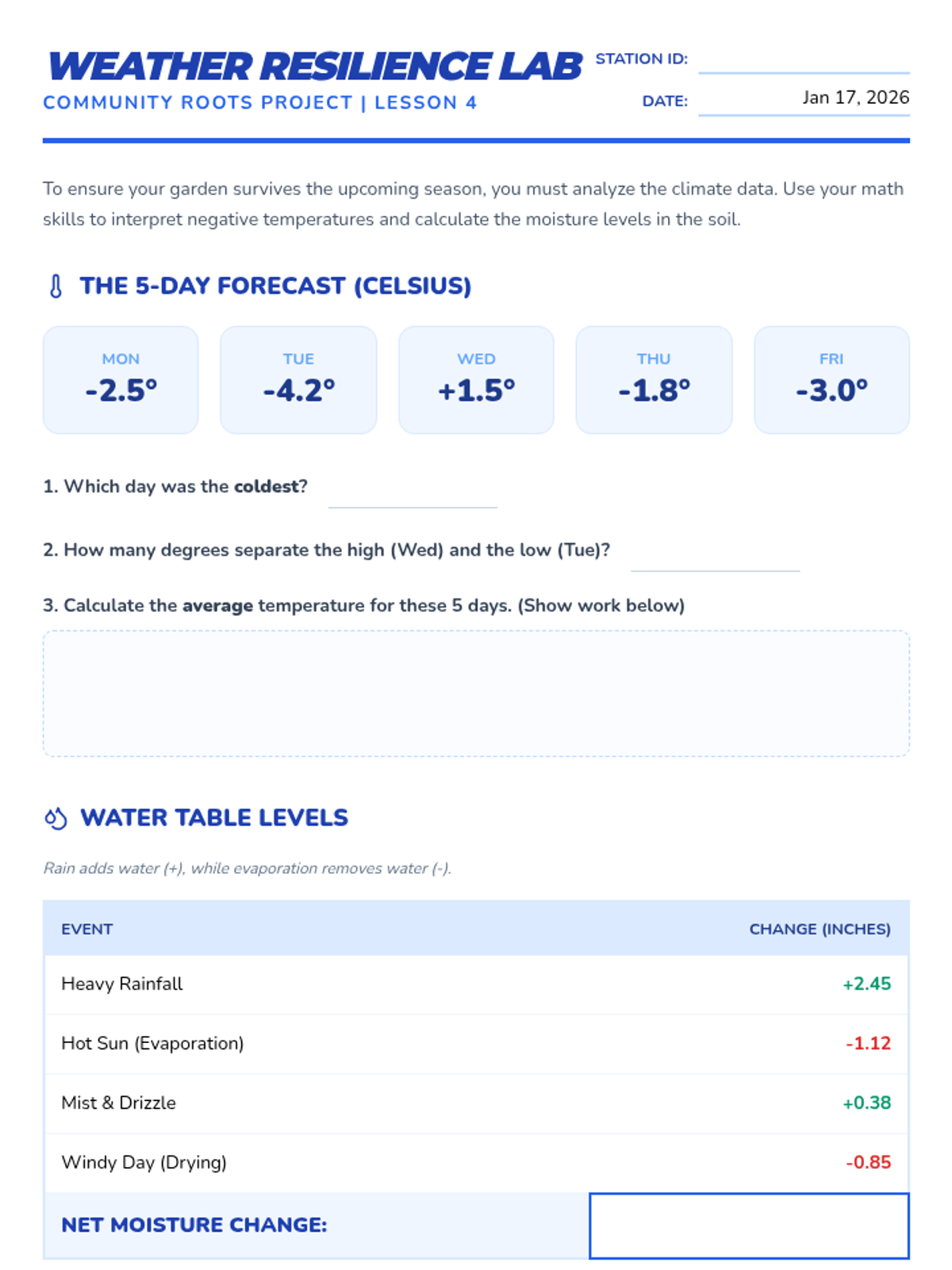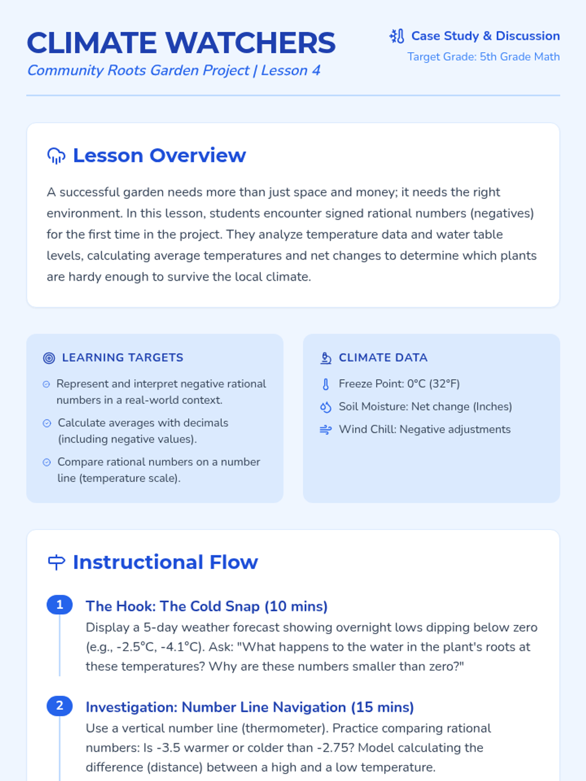 Students use signed numbers to analyze weather data and water levels to ensure plant survival.