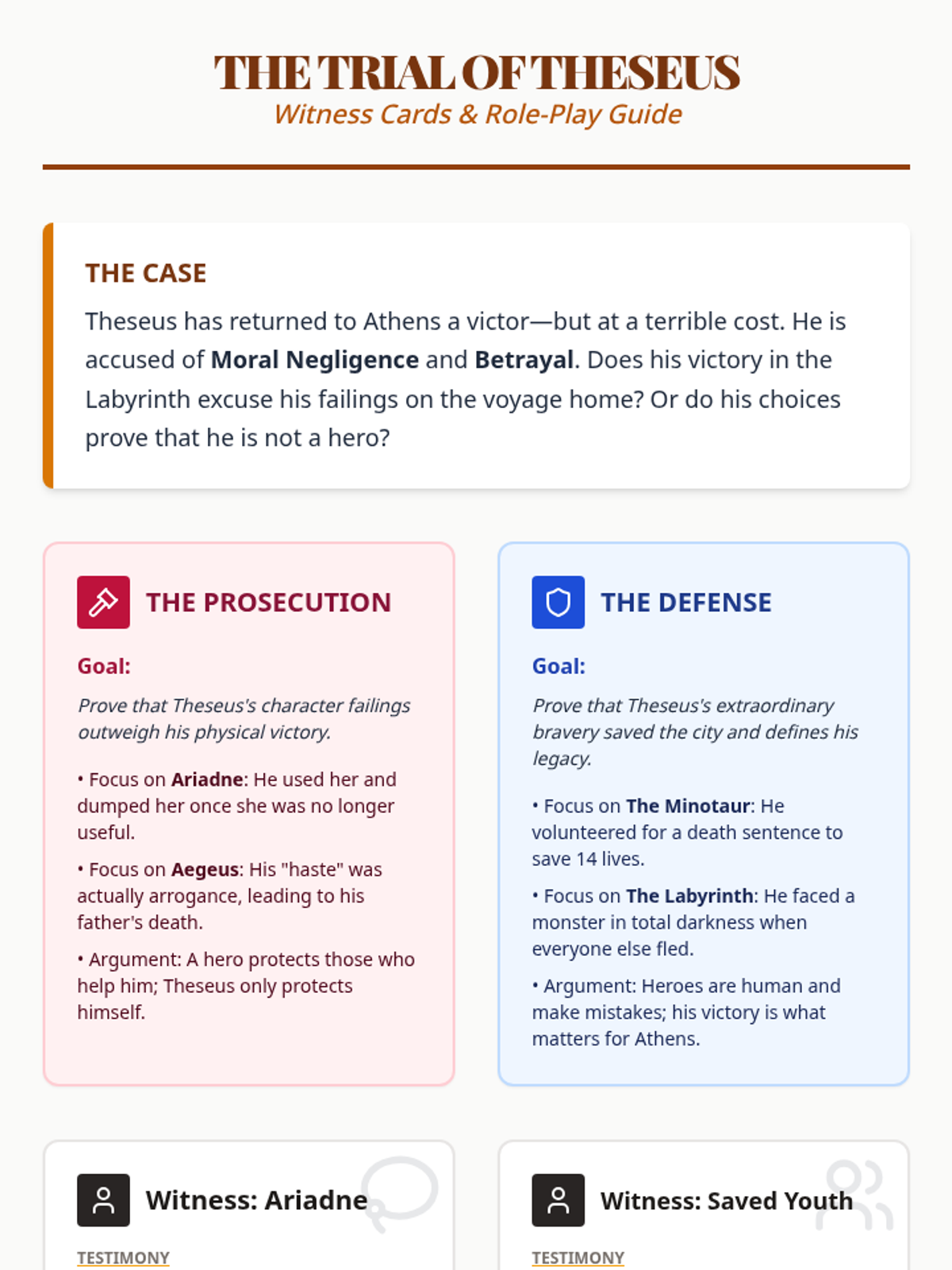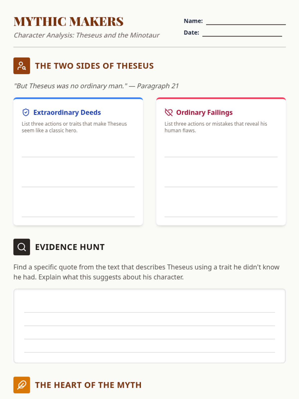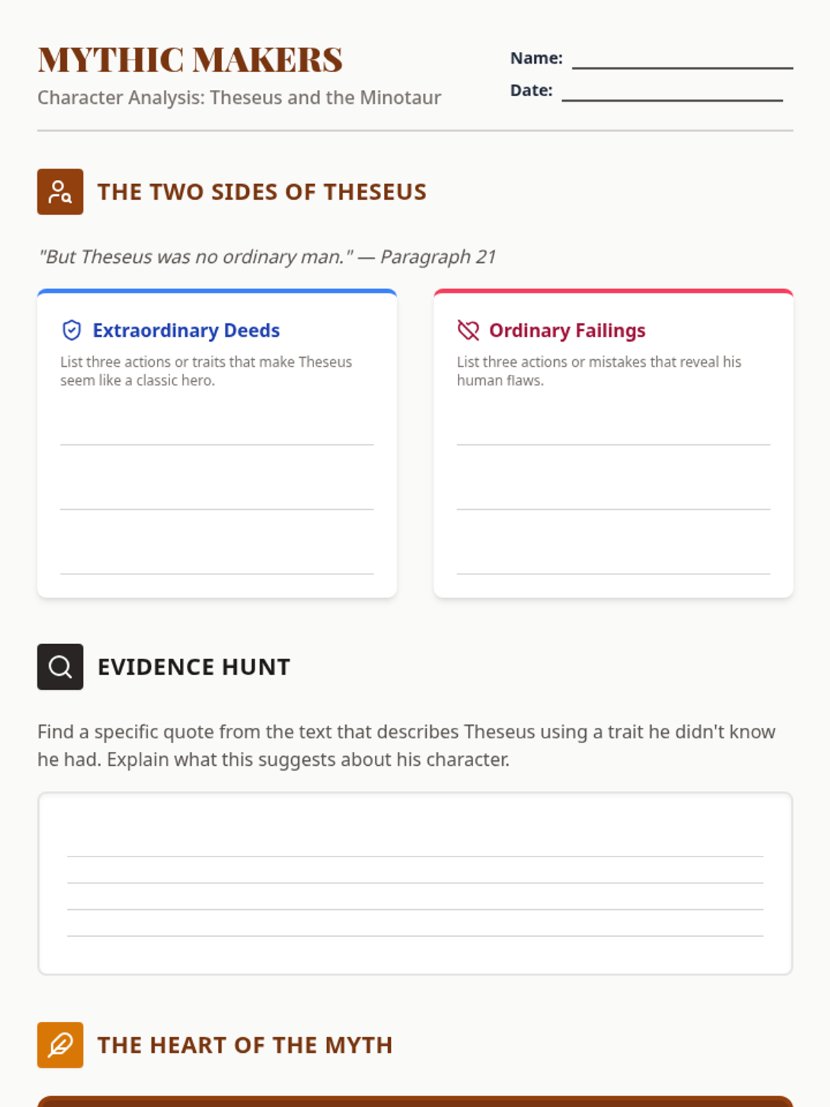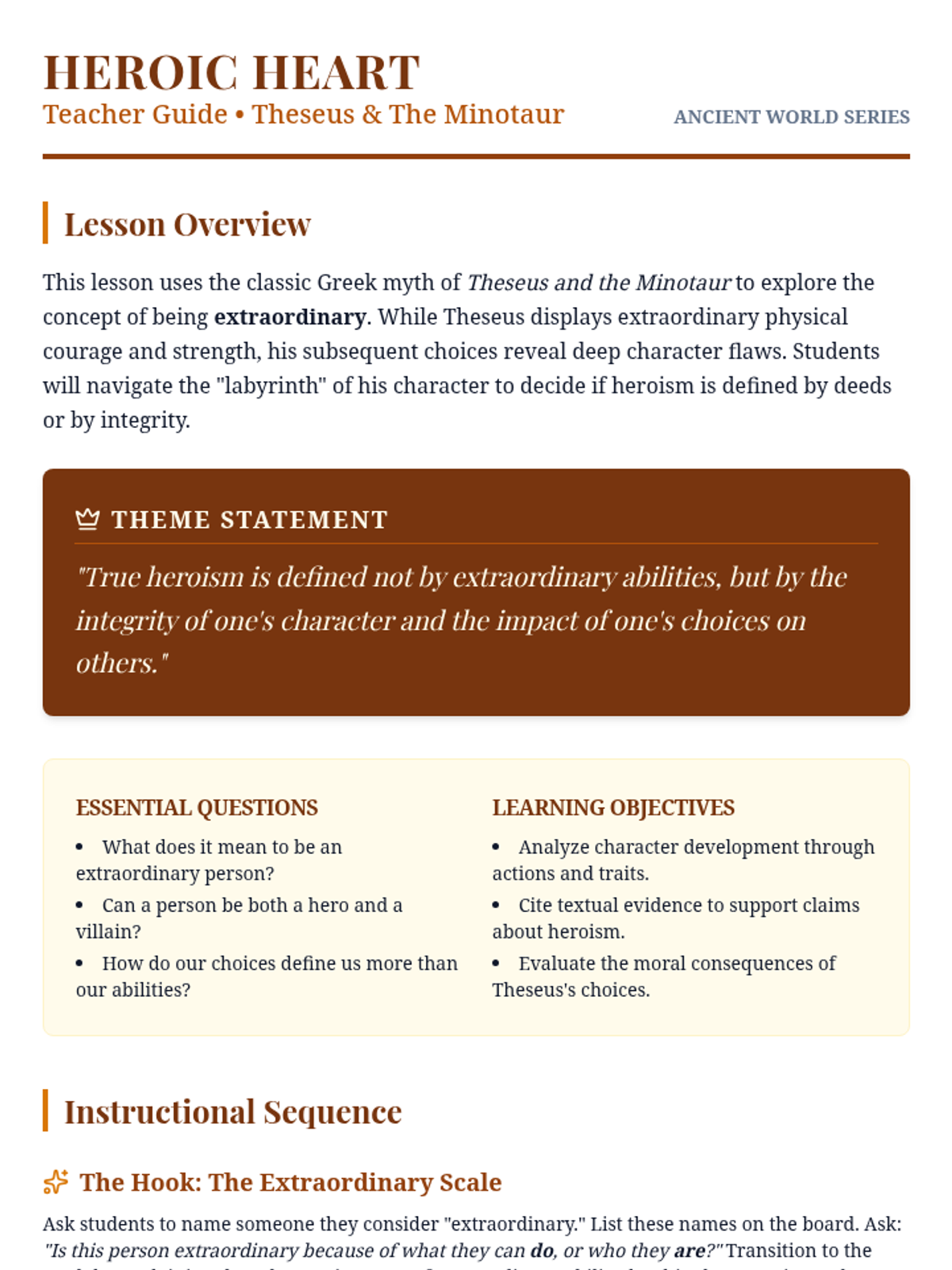 A deep dive into the myth of Theseus and the Minotaur, exploring the duality of heroism and what it truly means to be extraordinary. Students analyze Theseus's brave actions alongside his moral failings to develop a nuanced understanding of character.