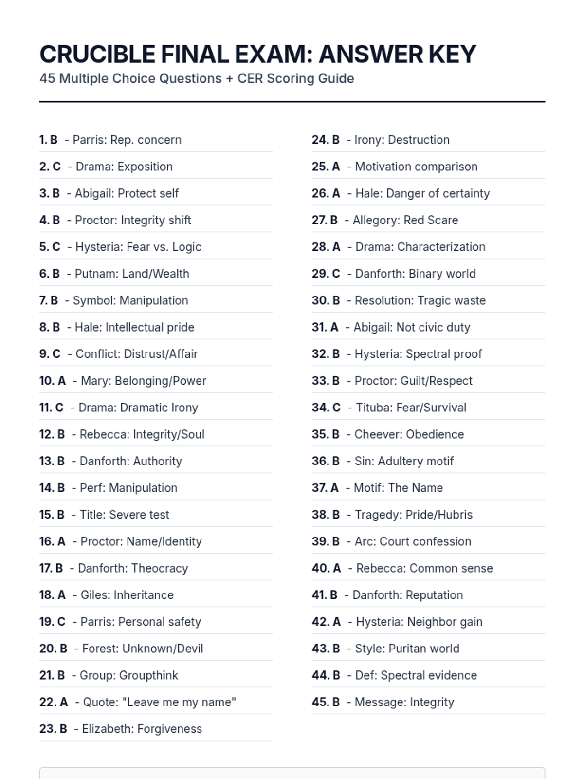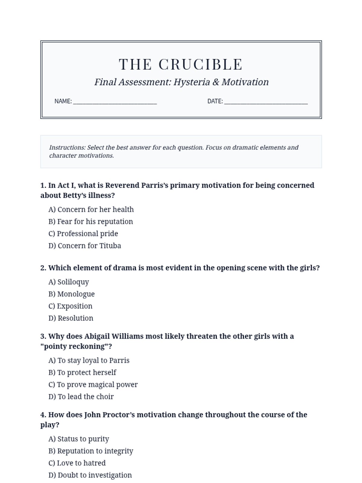 A comprehensive end-of-unit assessment for Arthur Miller's 'The Crucible', focusing on character motivation, the mechanics of hysteria, and elements of drama. This lesson includes a 45-question multiple-choice exam and a CER-based short answer response.