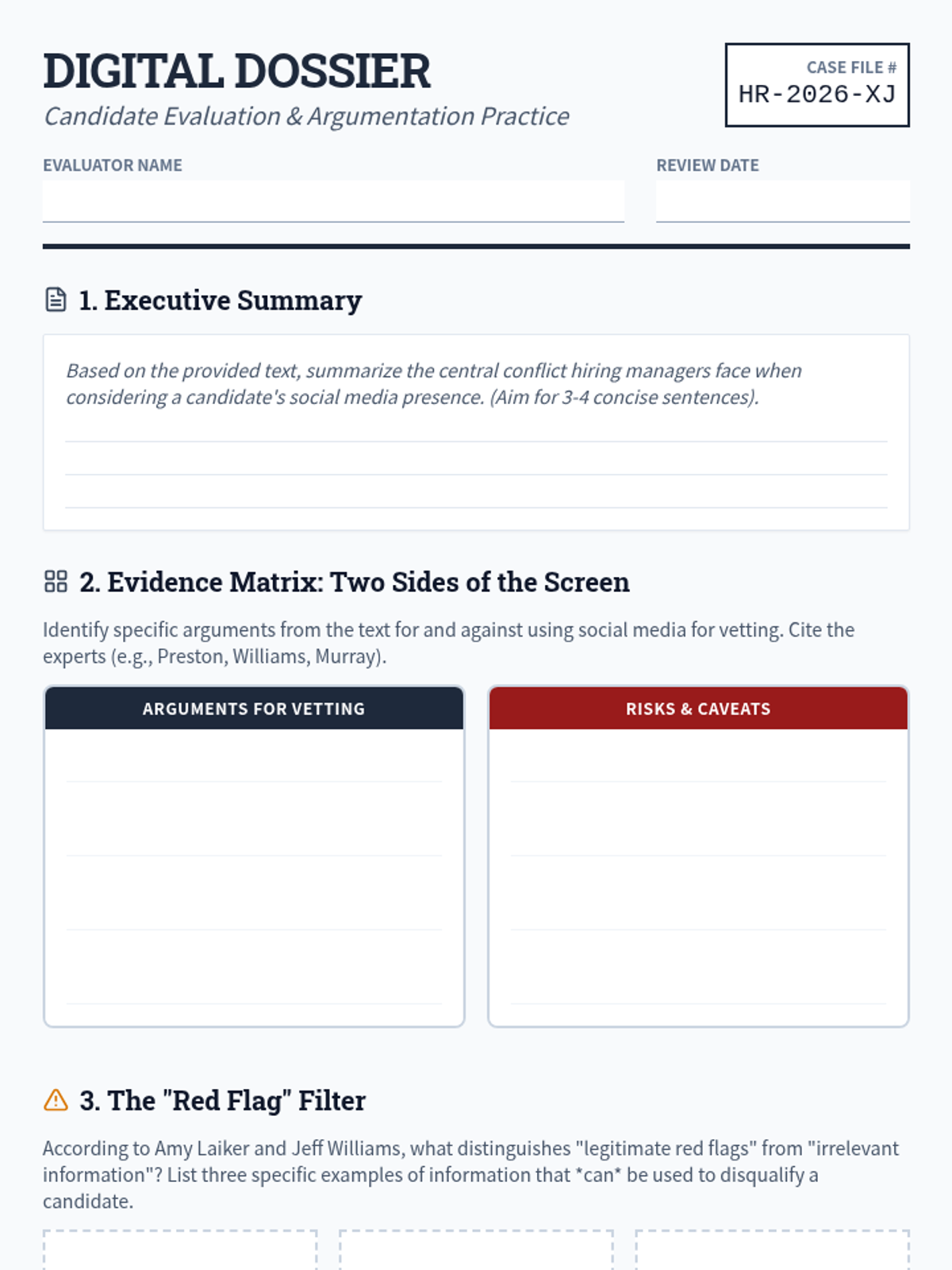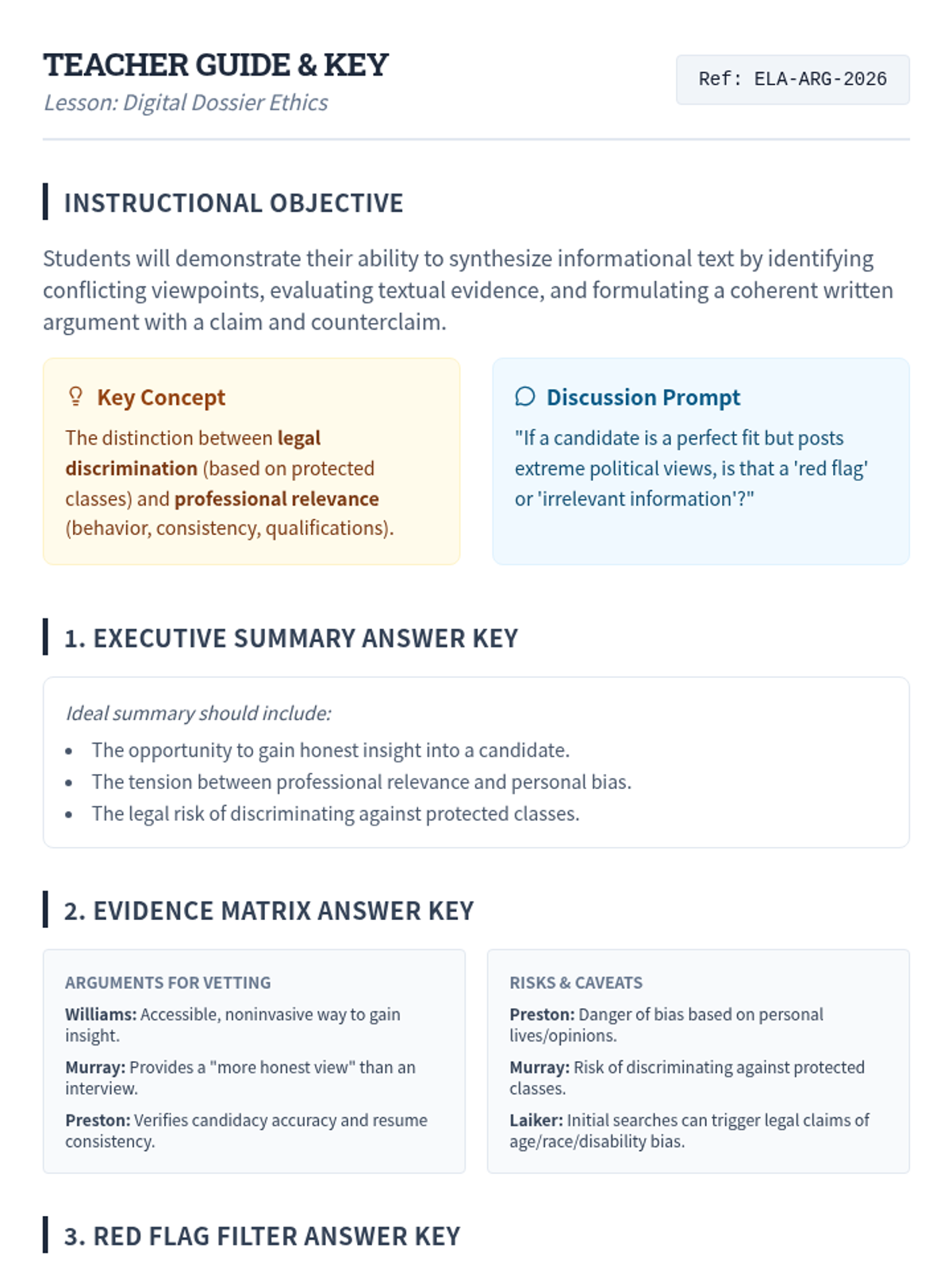 This lesson guides students through the complexities of using social media for job candidate vetting. Students will analyze expert testimony, identify legal risks, and construct a evidence-based argument on whether social media should influence hiring decisions.