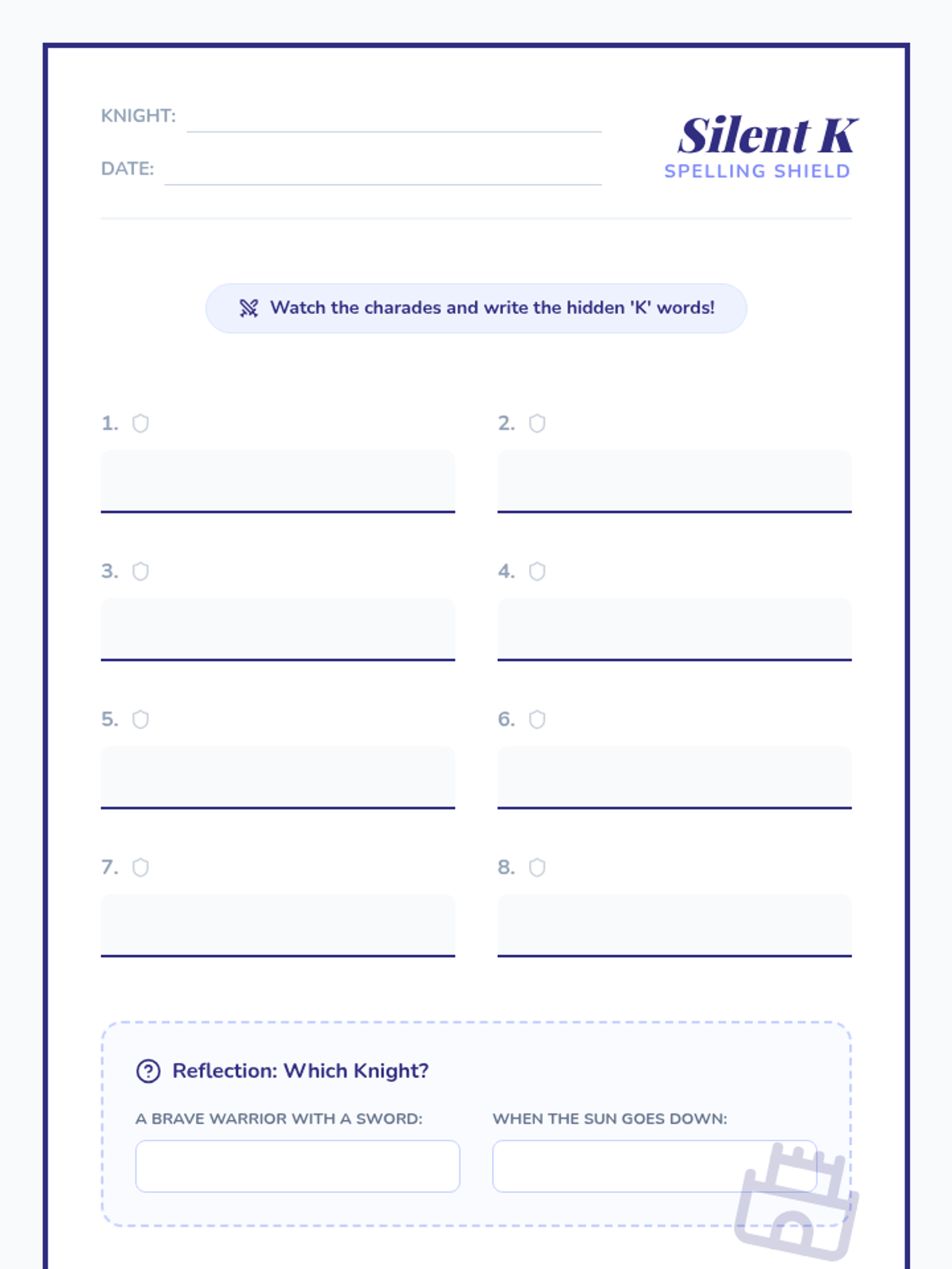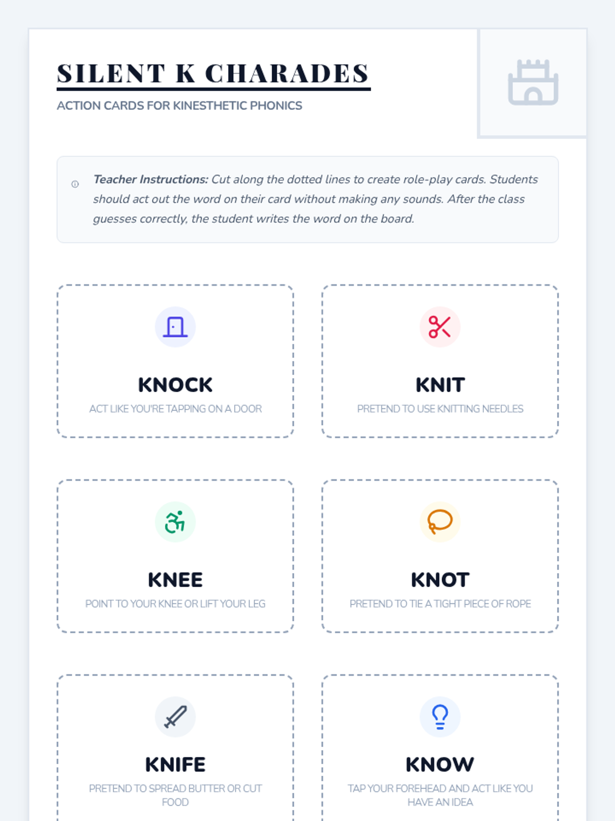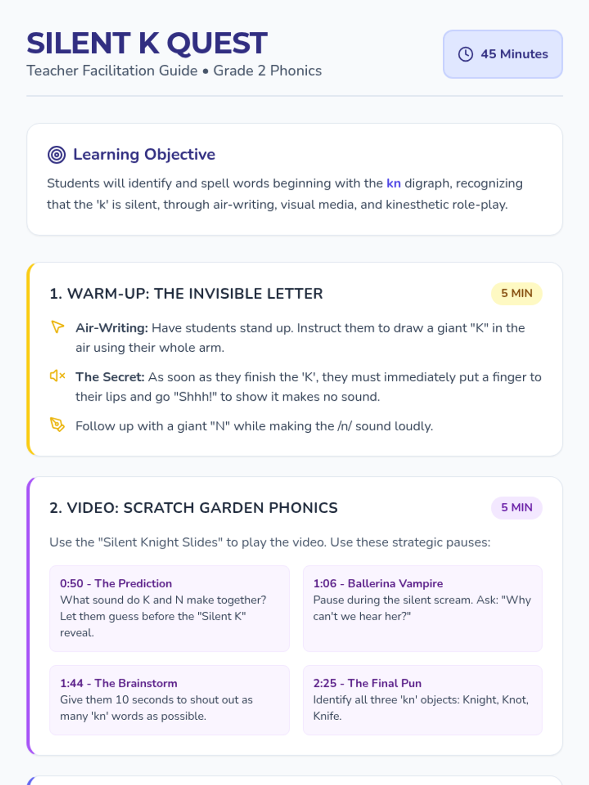 A kinesthetic phonics lesson for 2nd graders focusing on the silent 'k' in 'kn' words, featuring air-writing, charades, and a humorous video.