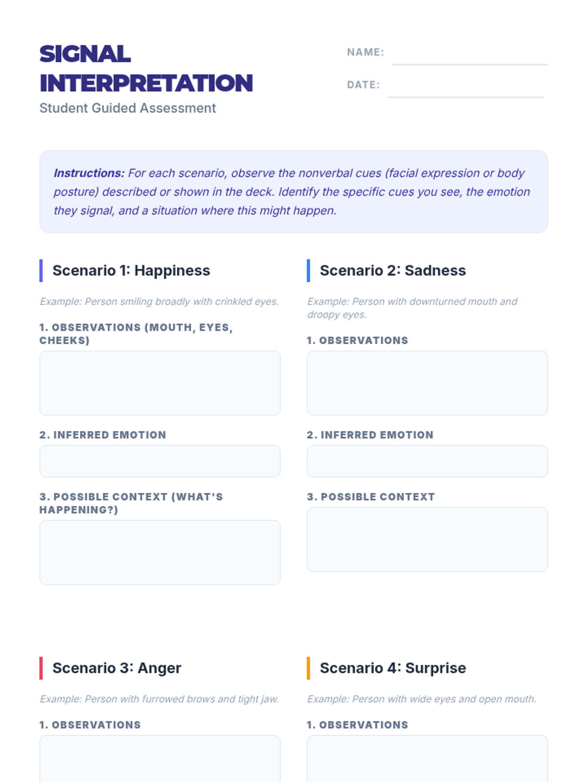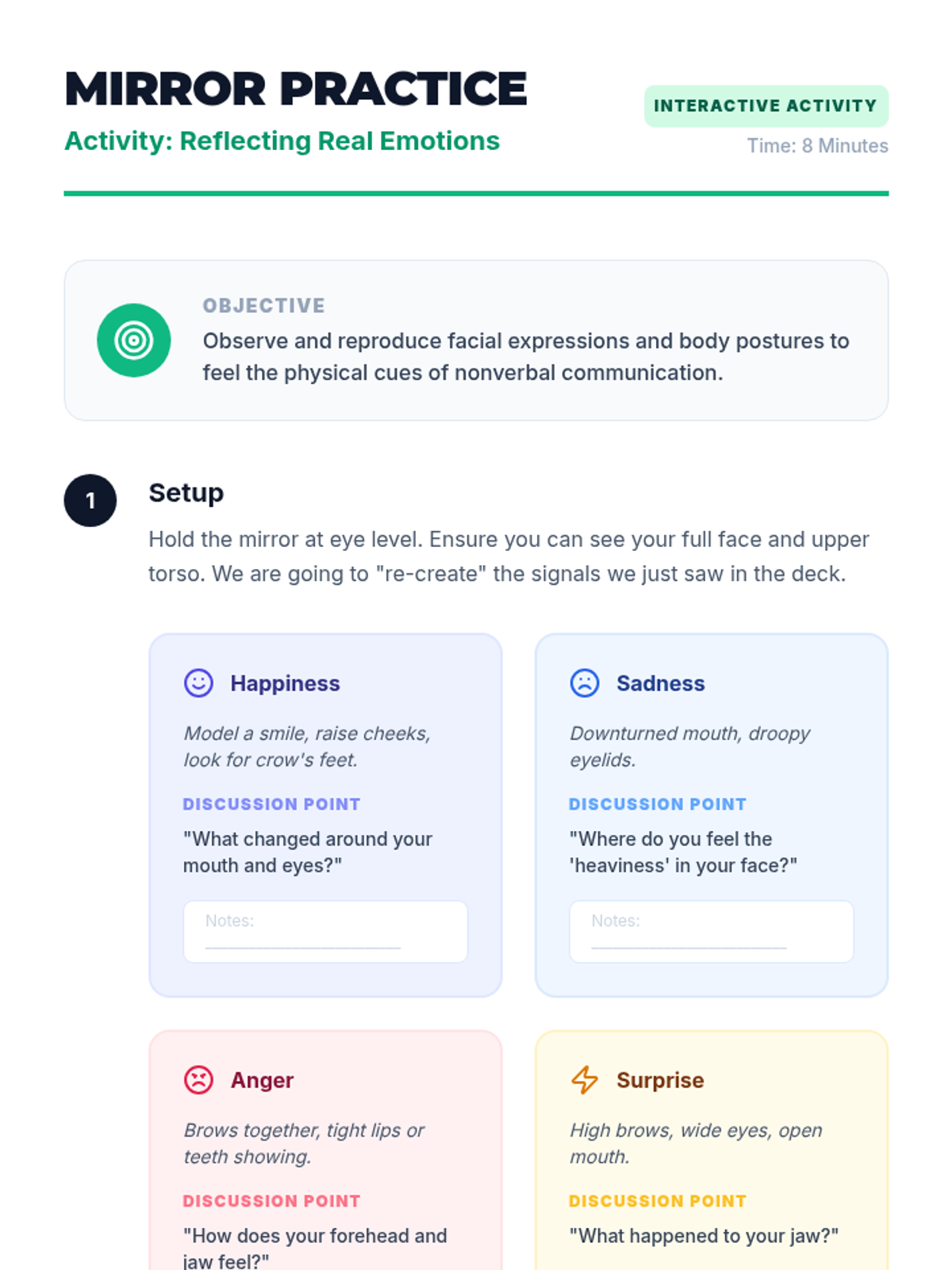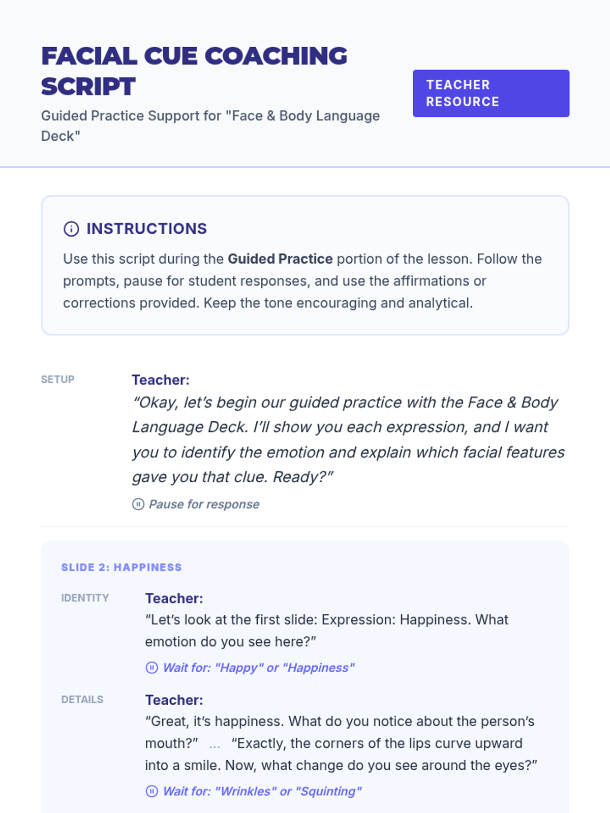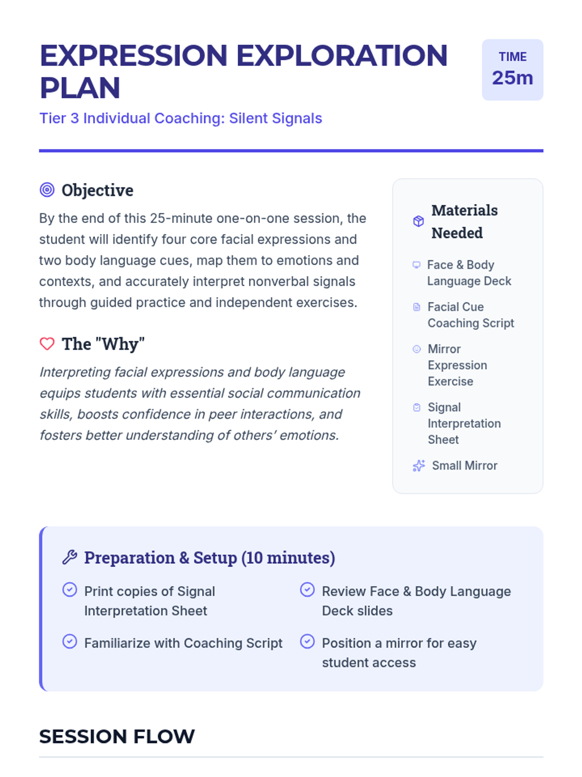 A one-on-one coaching lesson helping a 9th-grade student interpret facial expressions and body language to decode social contexts and respond appropriately.
