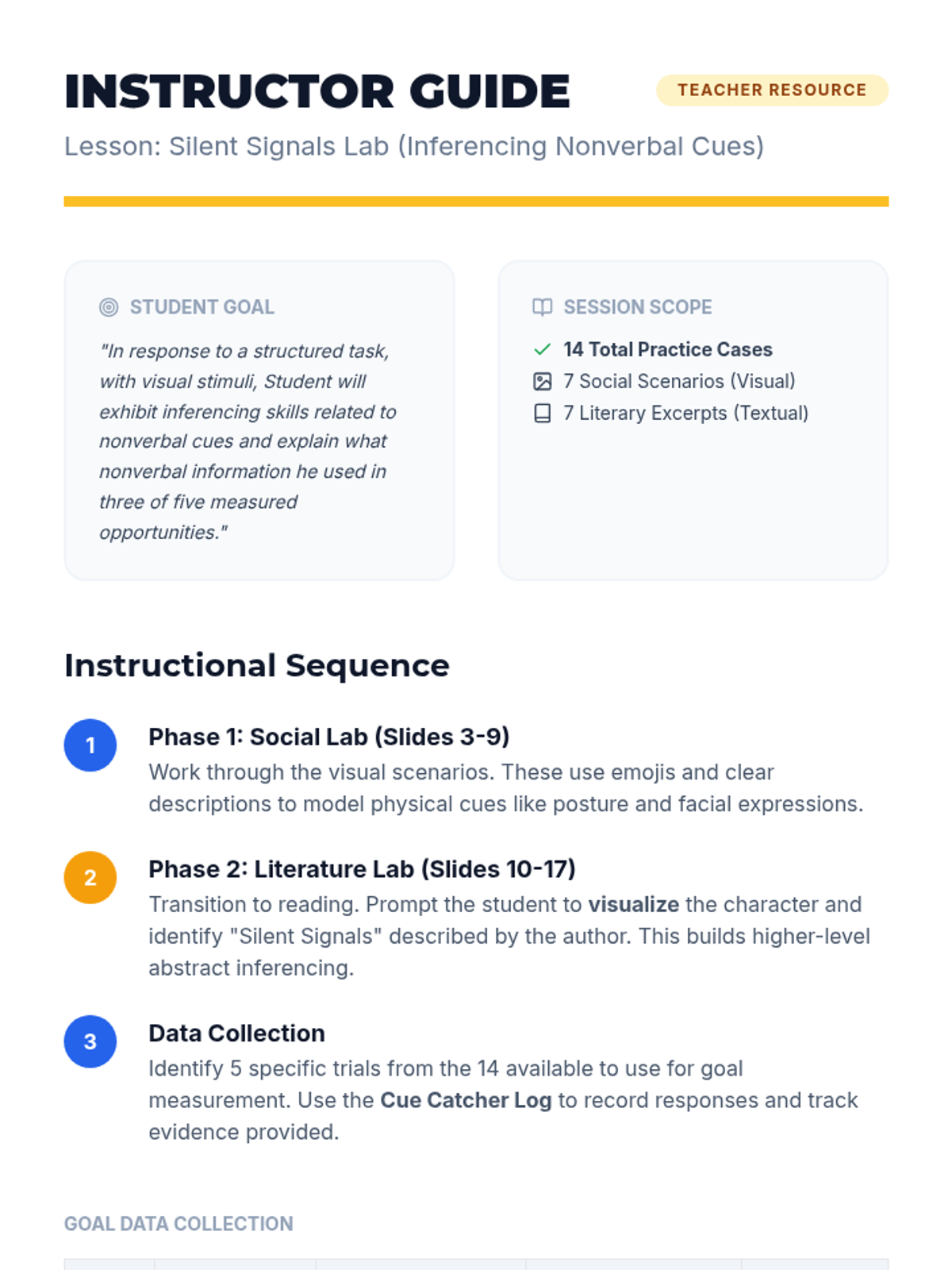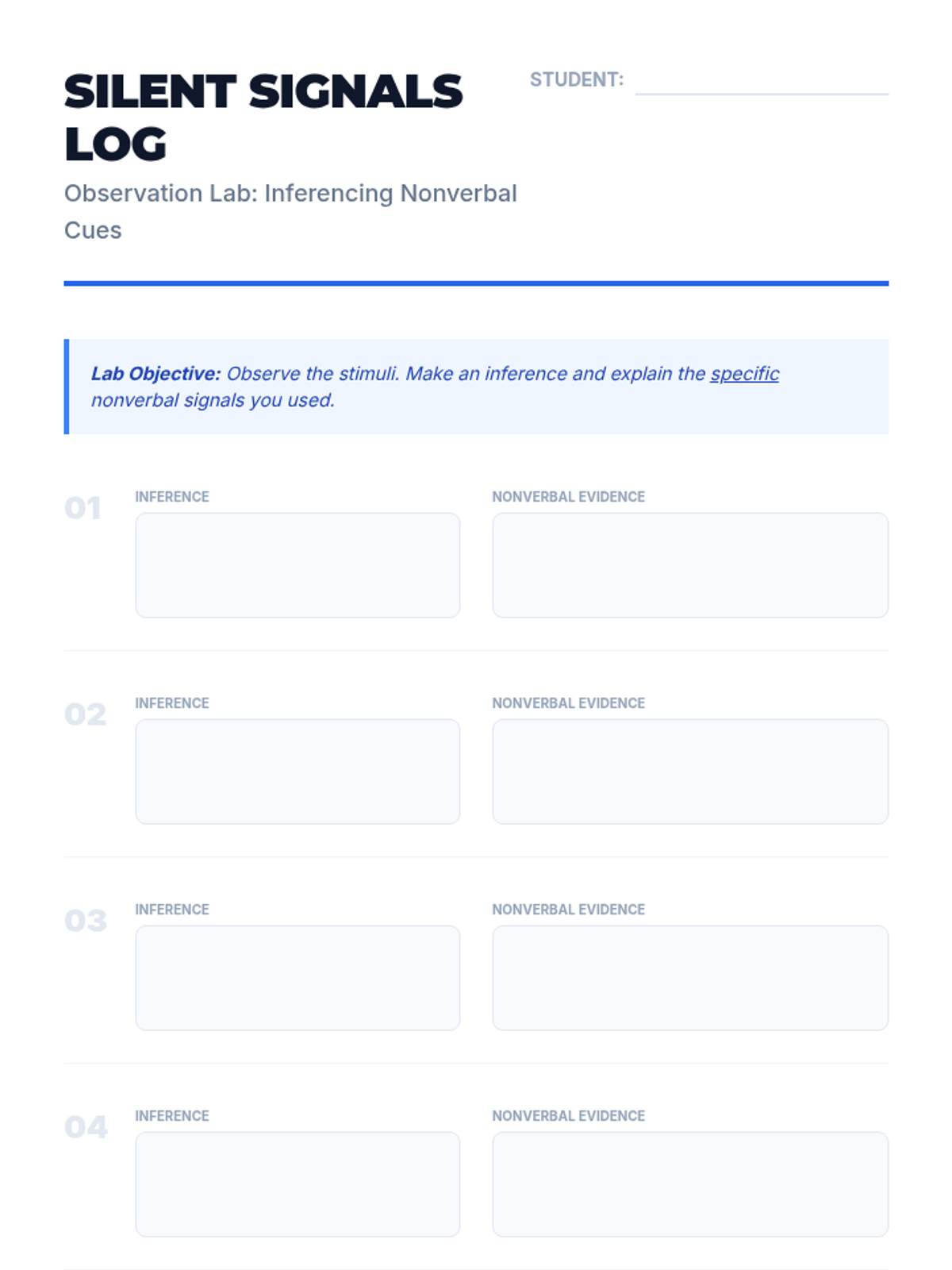 A specialized lesson for 10th-grade students to master inferencing through nonverbal cues like body language, facial expressions, and situational context. Includes interactive slides for practice and a tracking log for explanations.