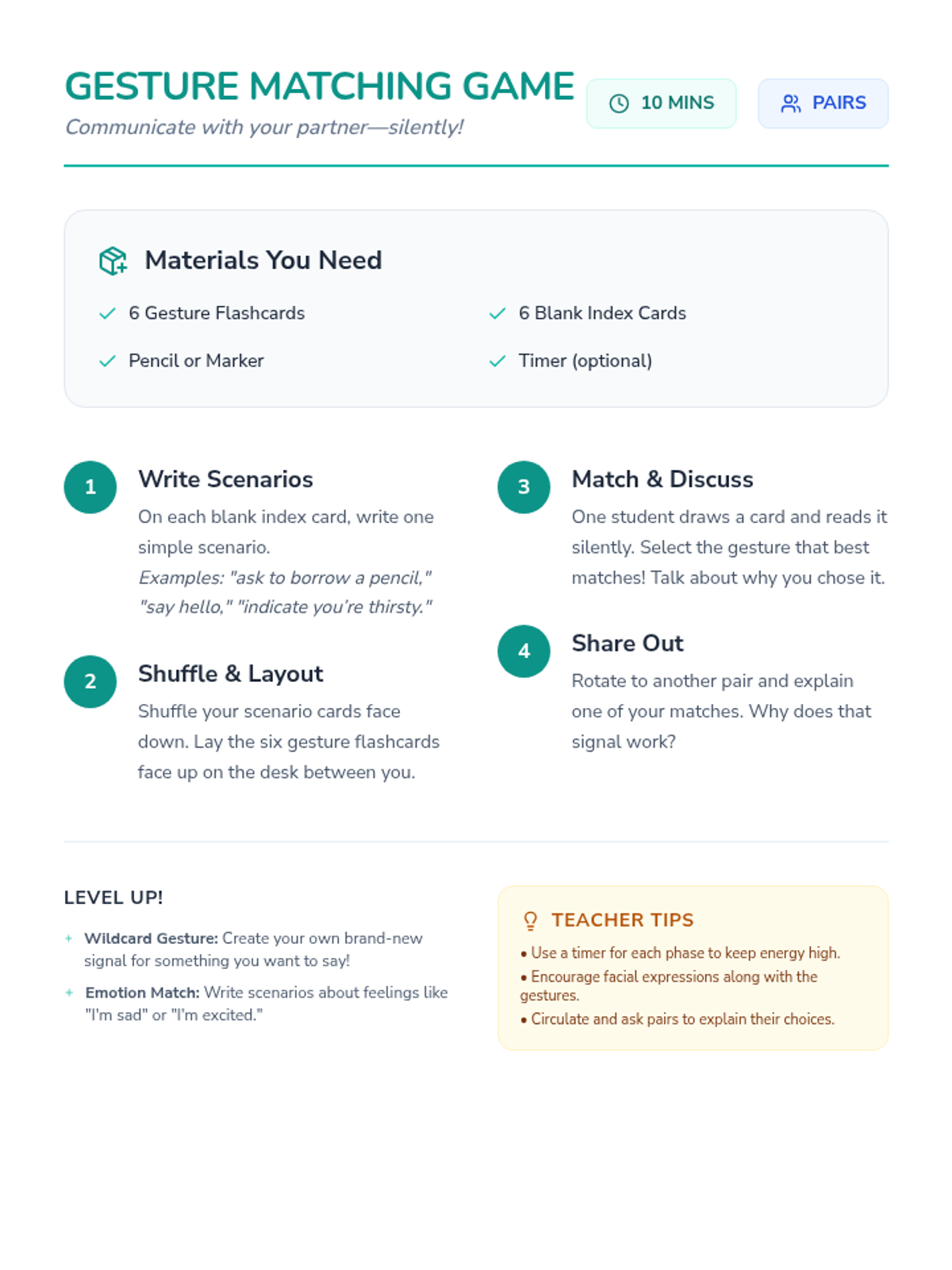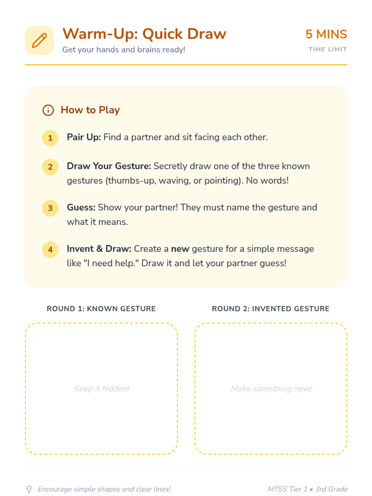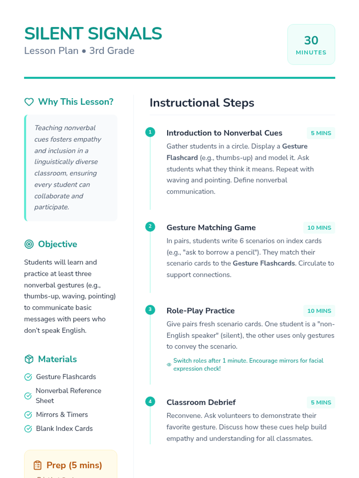 A 30-minute lesson for 3rd graders on using gestures, facial expressions, and body language to foster empathy and communicate with non-English speaking peers.