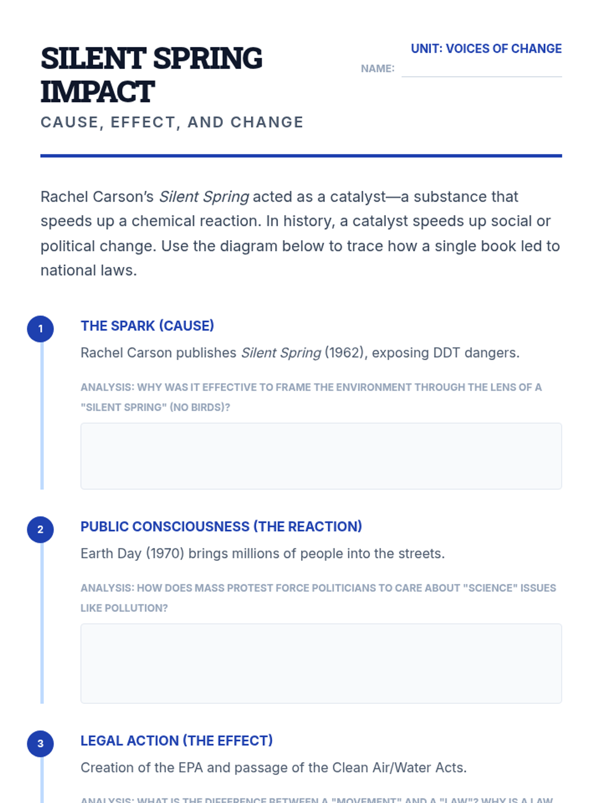 Trace the origins of modern environmentalism from Rachel Carson’s 'Silent Spring' to the first Earth Day and the creation of the EPA.