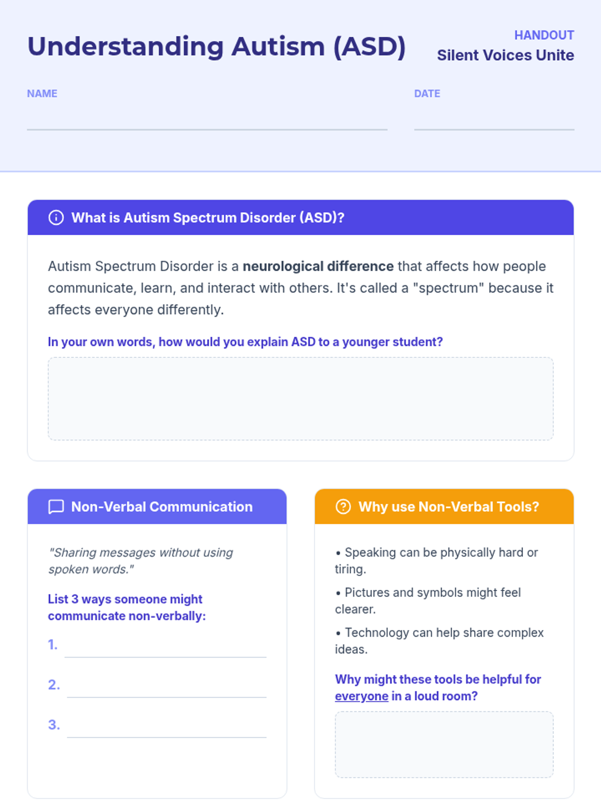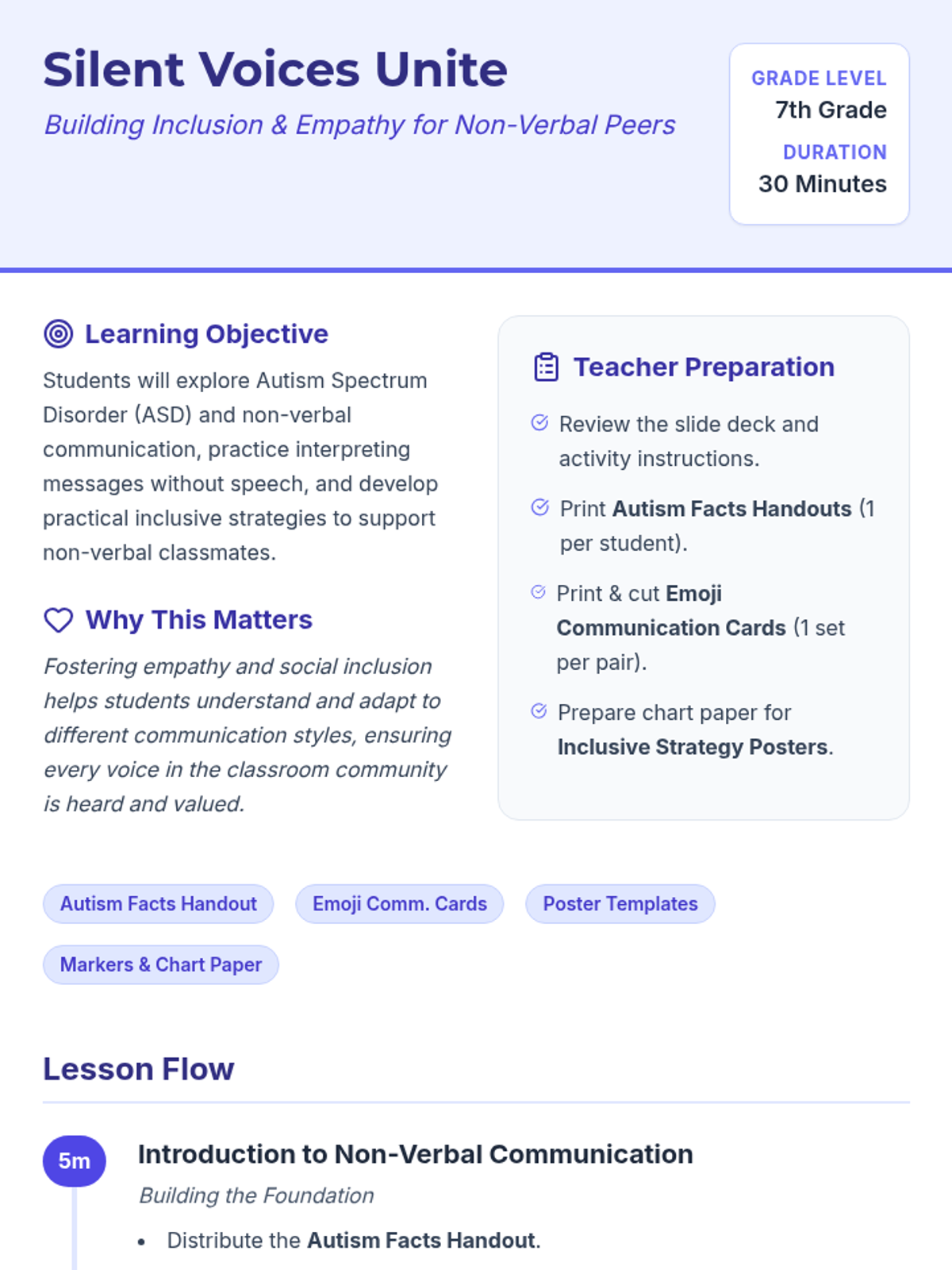 A 30-minute Grade 7 lesson focused on fostering empathy and inclusion for non-verbal peers on the autism spectrum through interactive communication activities.