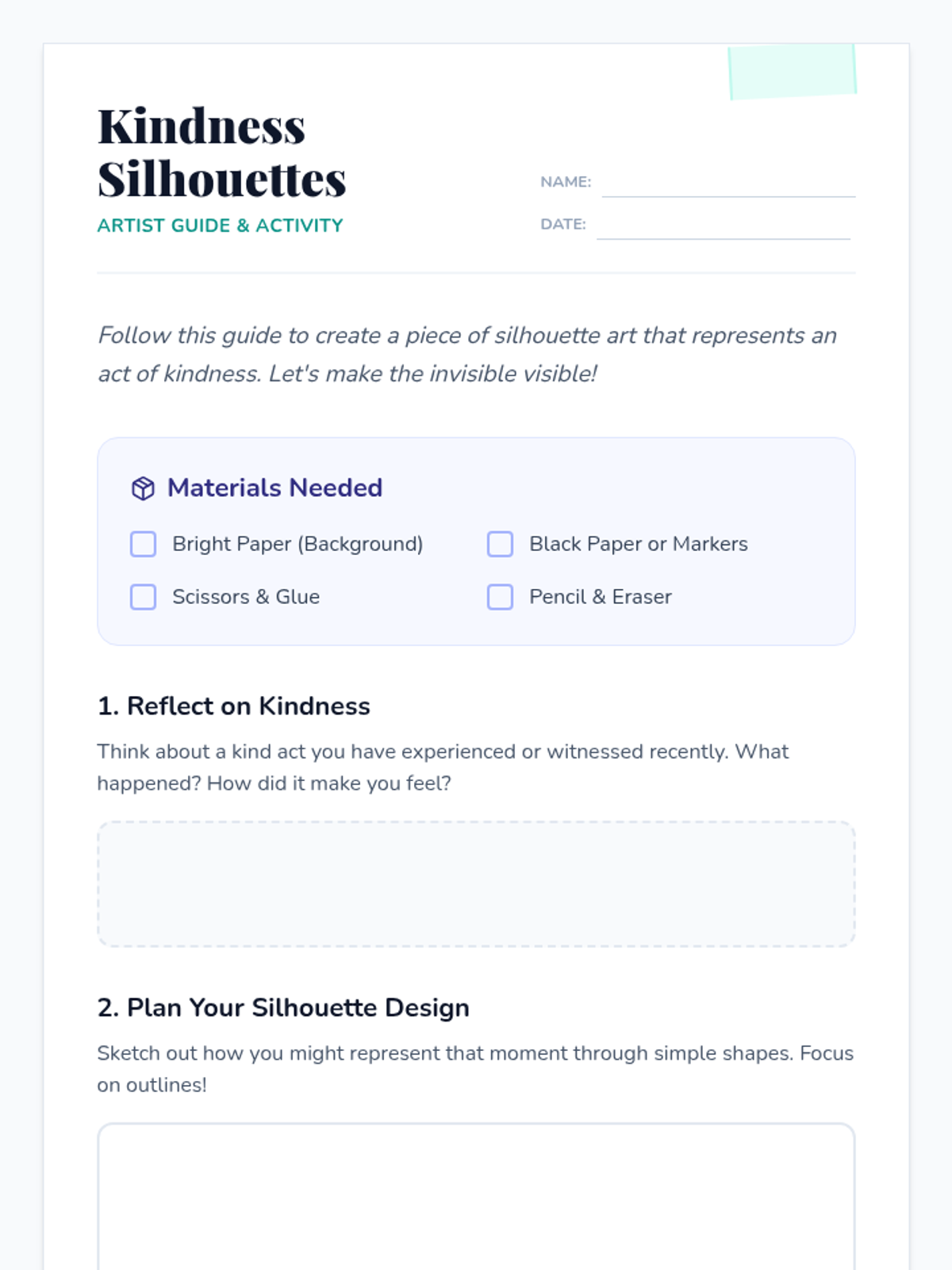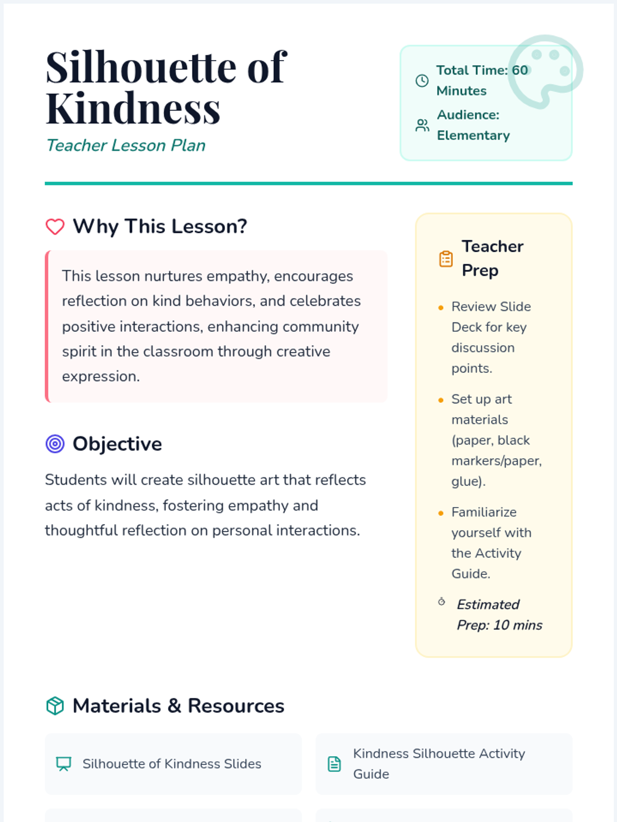 A visual arts lesson where students create silhouette art representing acts of kindness to foster empathy and community.