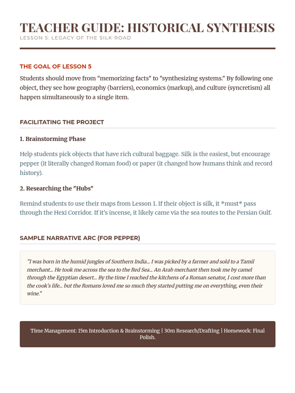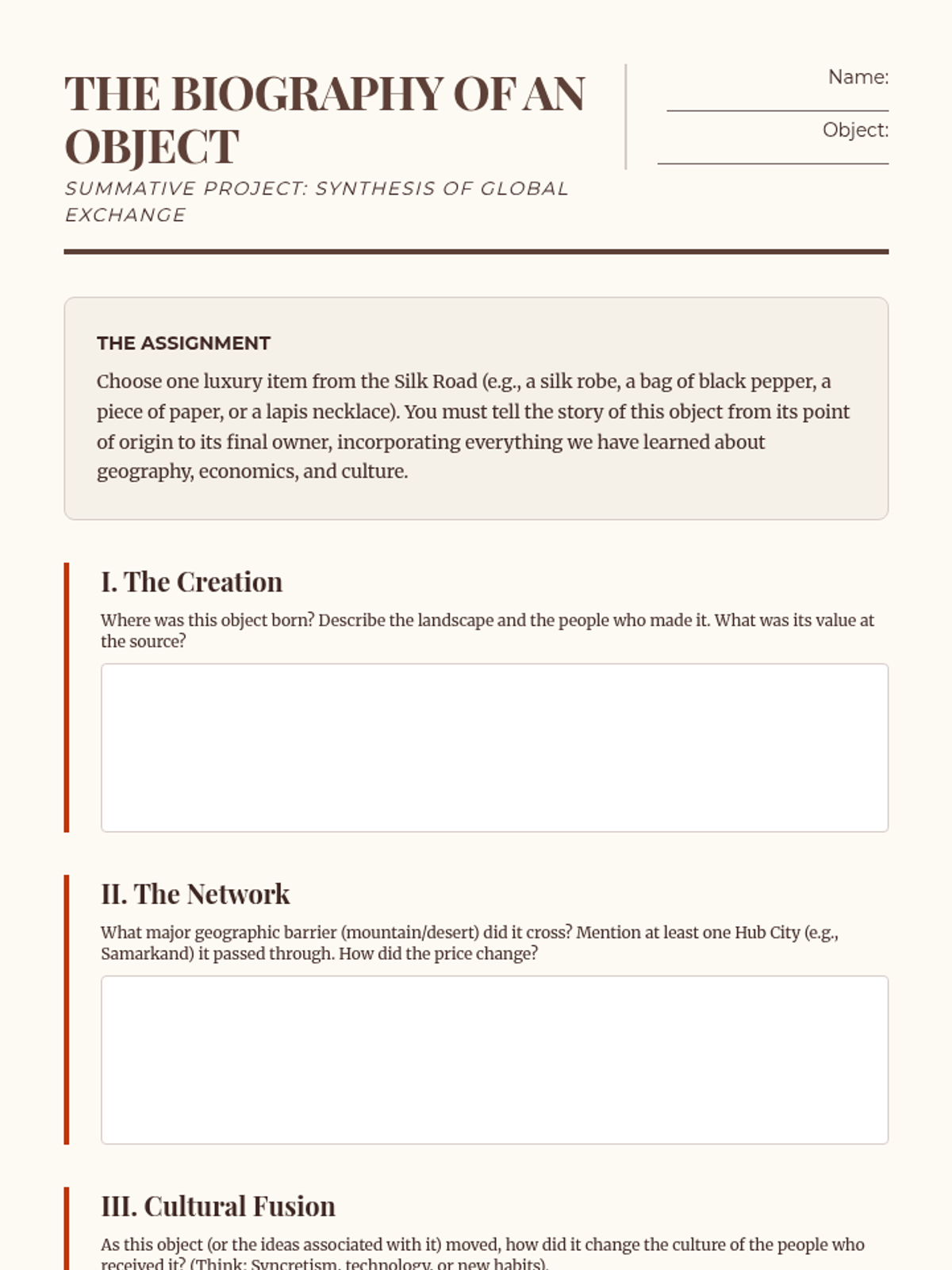 Students synthesize their learning by tracing the 'biography' of an object, demonstrating how ancient trade networks shaped modern culture.
