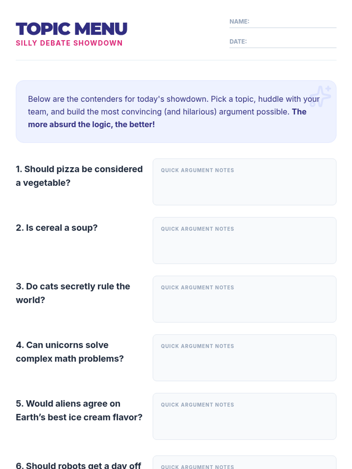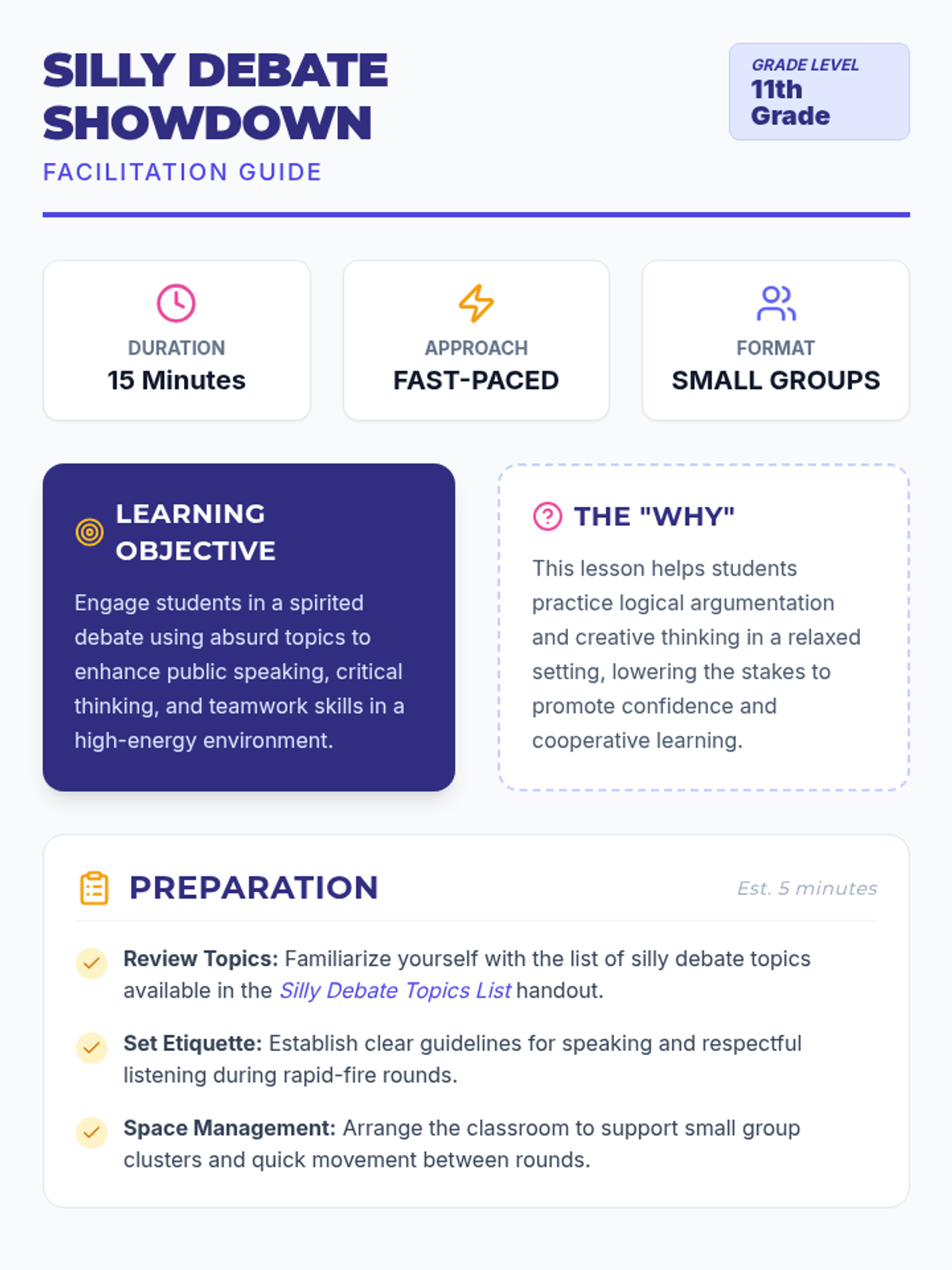 A fast-paced, high-energy lesson where 11th-grade students practice argumentation and public speaking through absurd and humorous debate topics. Students work in teams to construct quick-fire arguments, fostering critical thinking in a low-stakes, fun environment.