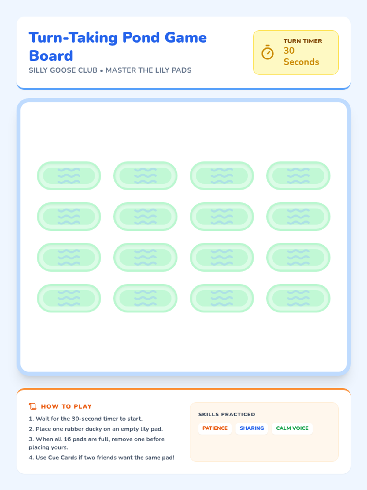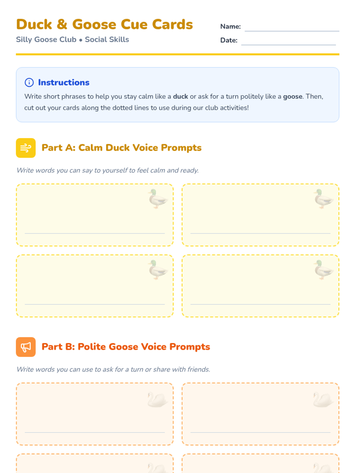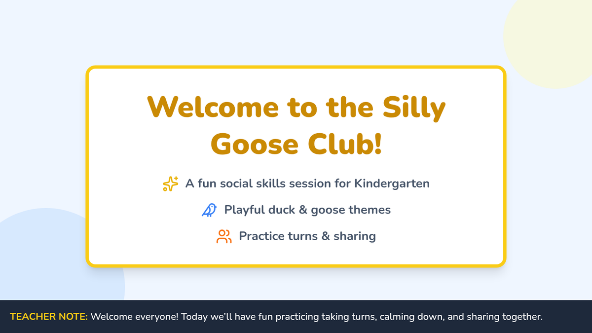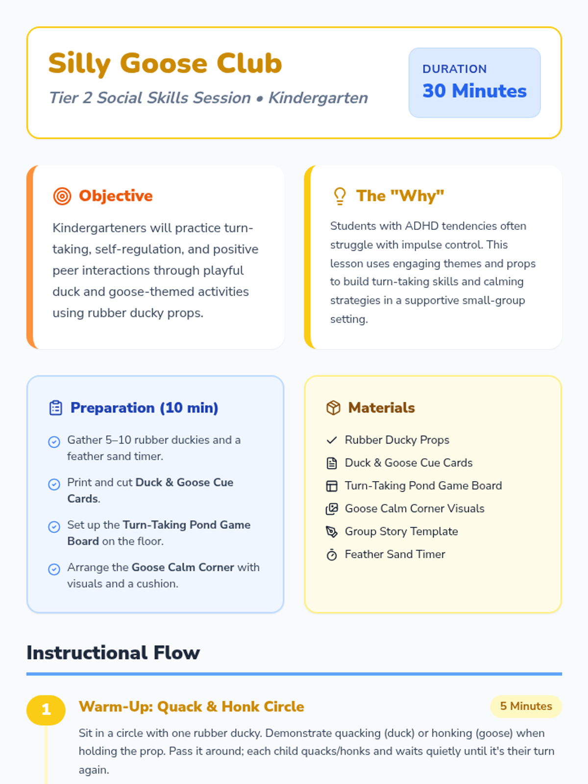 A 30-minute Tier 2 social skills session for kindergarteners focusing on turn-taking and self-regulation through a playful duck and goose theme.