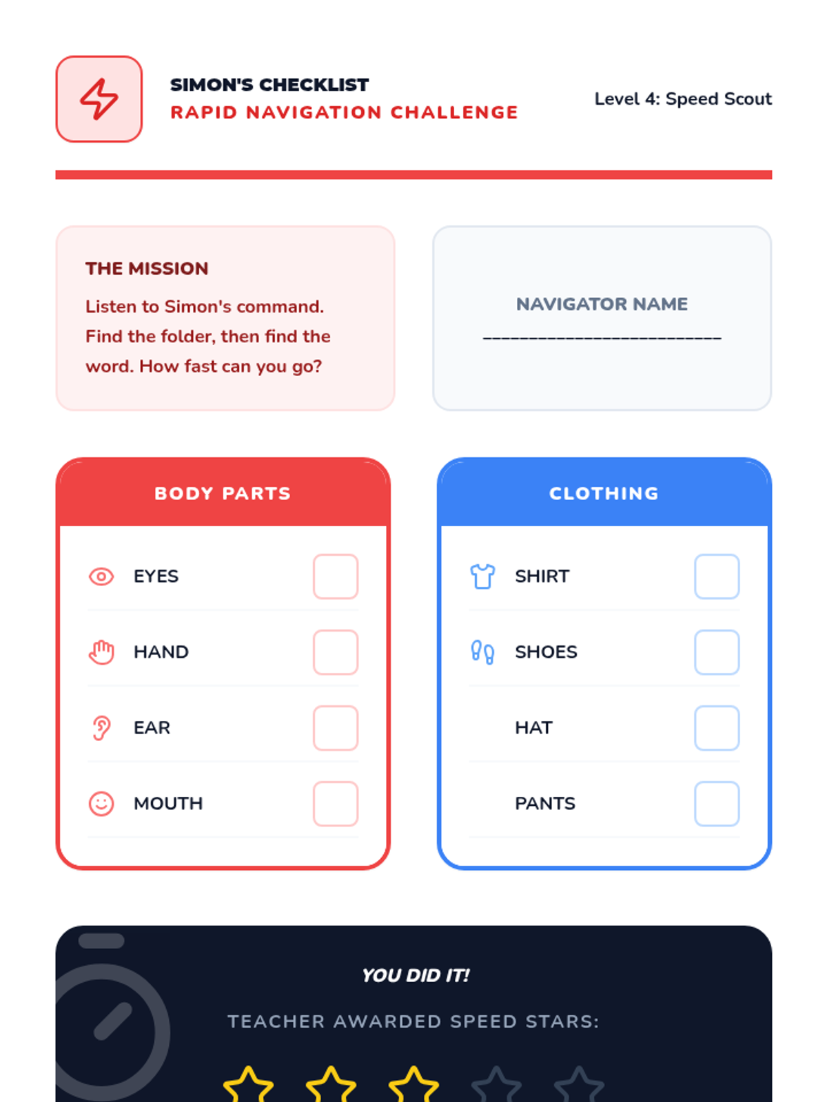 Develops rapid navigation skills through a game of Simon Says. Students locate personal care items in the Clothing and Body Parts folders to follow commands.