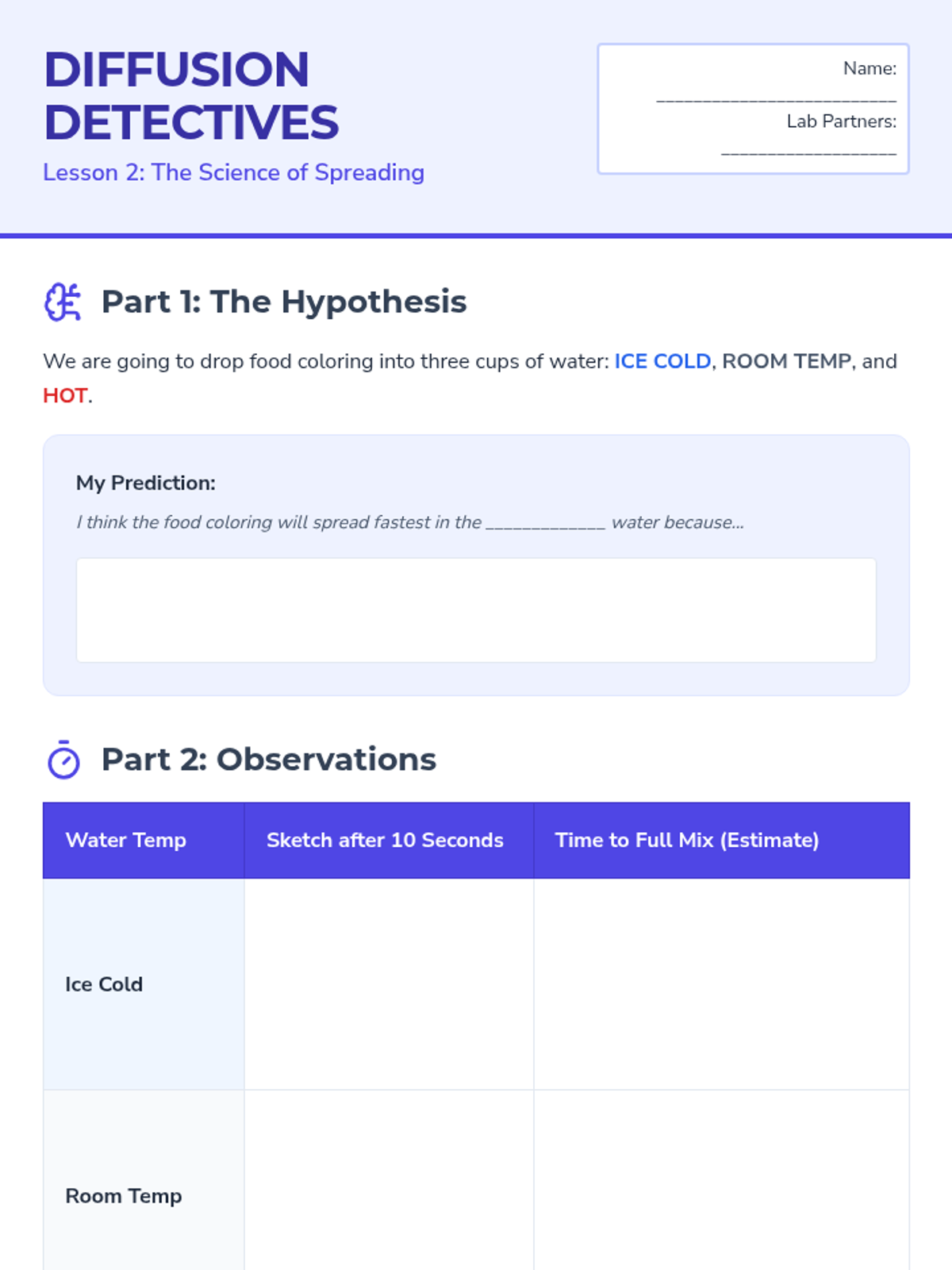 Students conduct a lab using food coloring in water at different temperatures to observe the rate of diffusion and define concentration gradients and equilibrium.