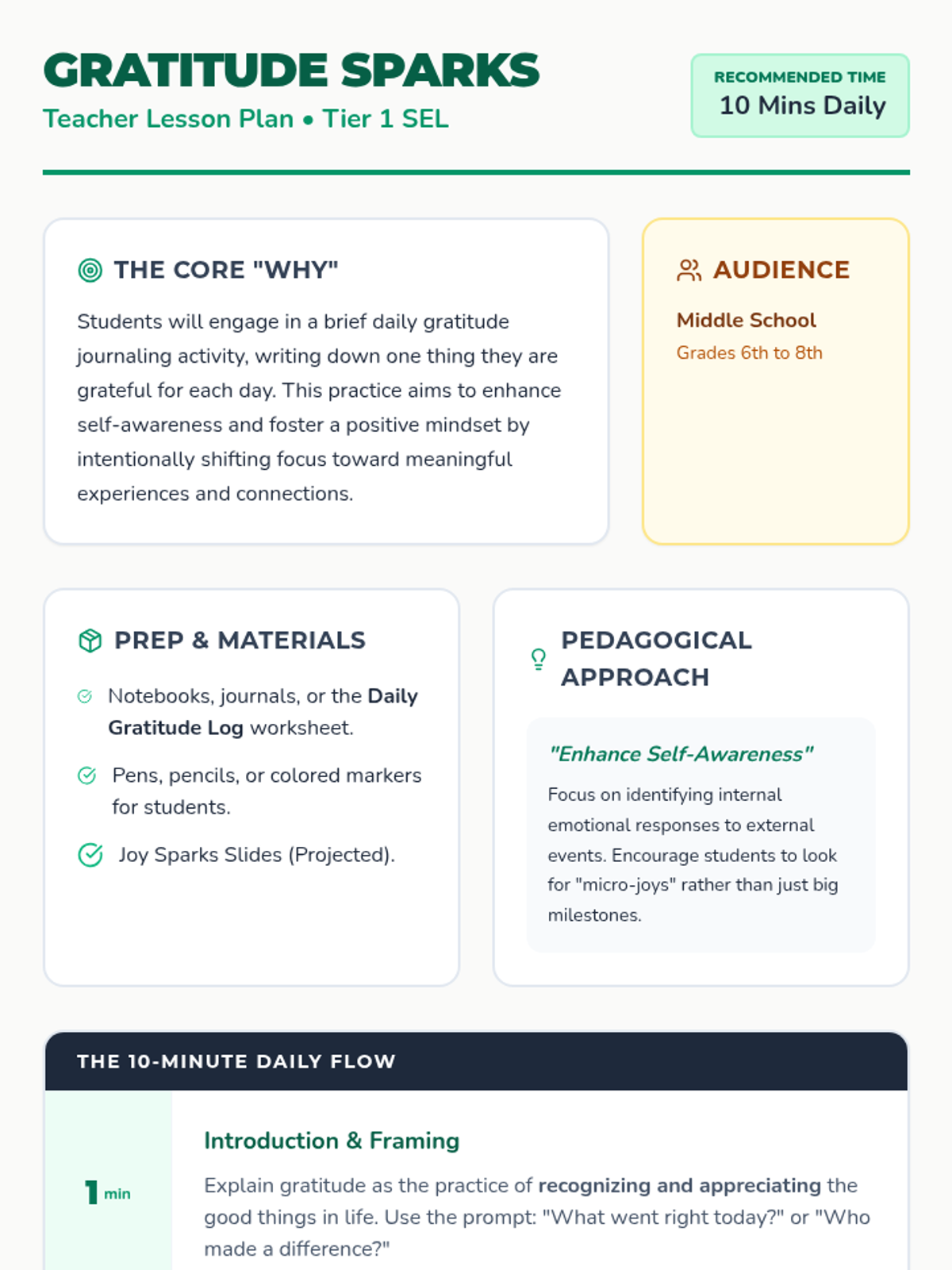 A short, daily practice designed for middle schoolers to improve self-awareness and positivity through consistent gratitude journaling.