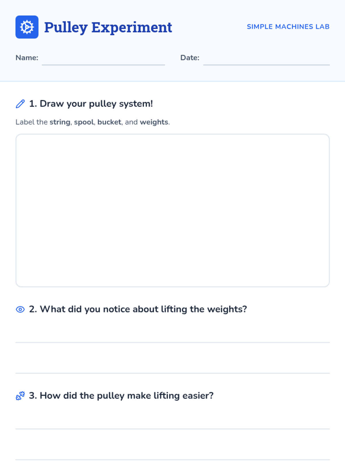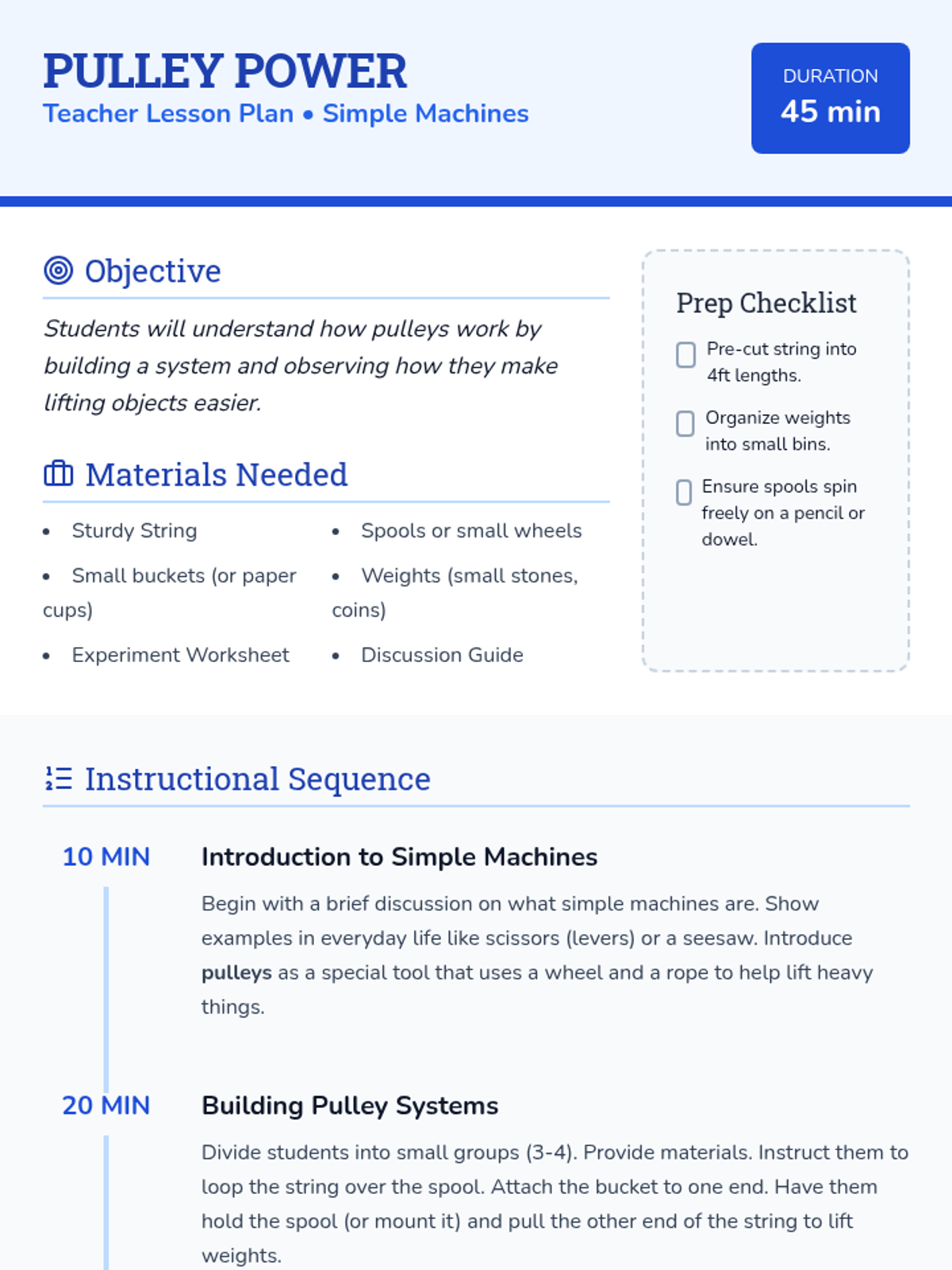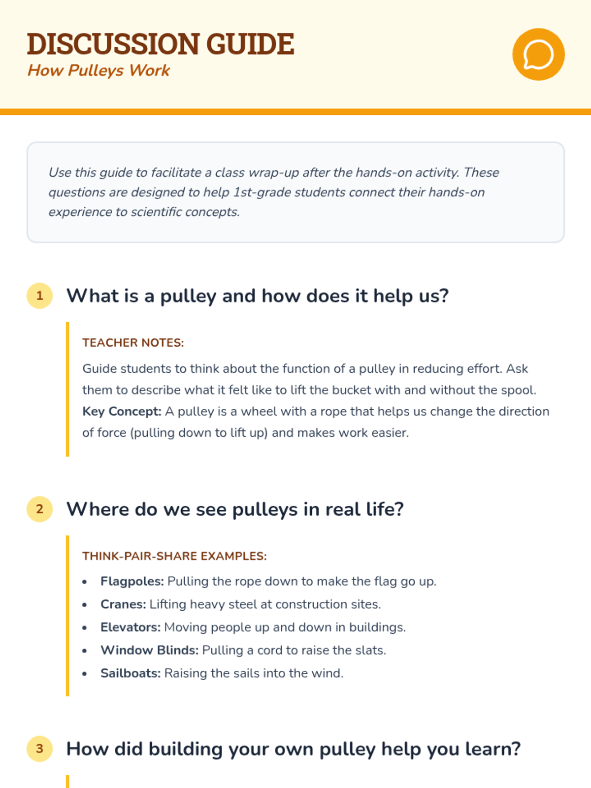 An introductory lesson for 1st-grade students exploring how pulleys work as simple machines through hands-on building and experimentation.