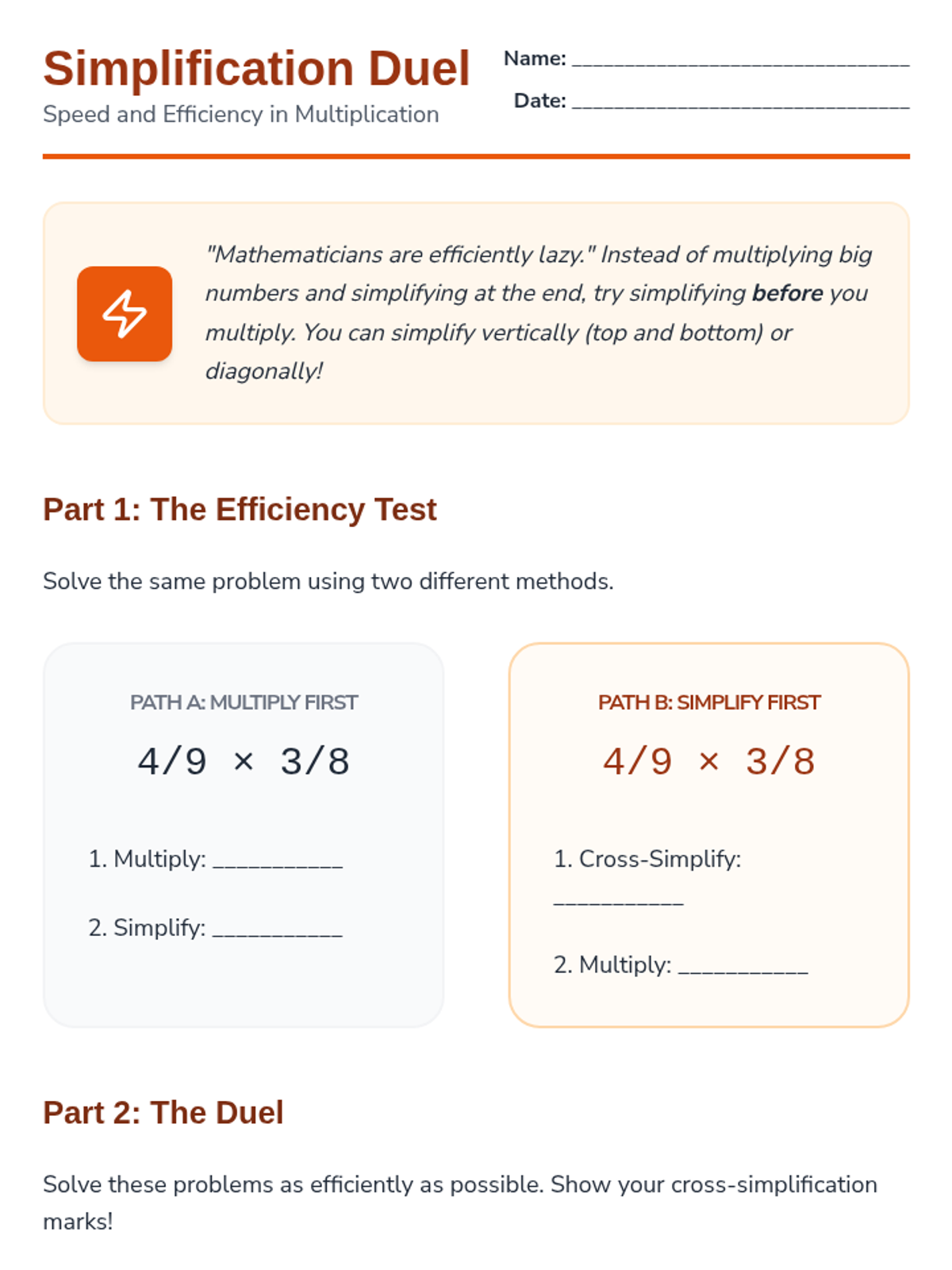 Students practice the standard algorithm and learn to simplify fractions. They explore whether it is more efficient to simplify the factors before multiplying or the product after multiplying.