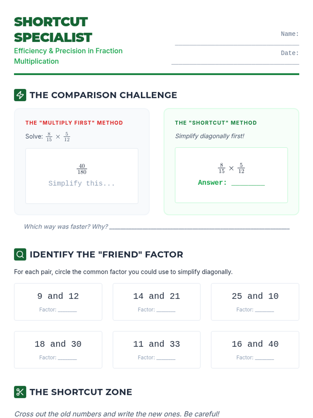 Students learn to identify common factors across numerators and denominators to simplify expressions before calculating the final product. This lesson focuses on efficiency and reducing the likelihood of calculation errors with large numbers.
