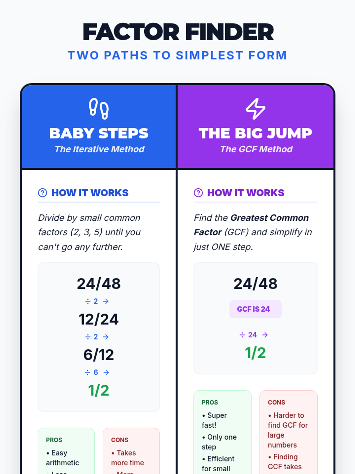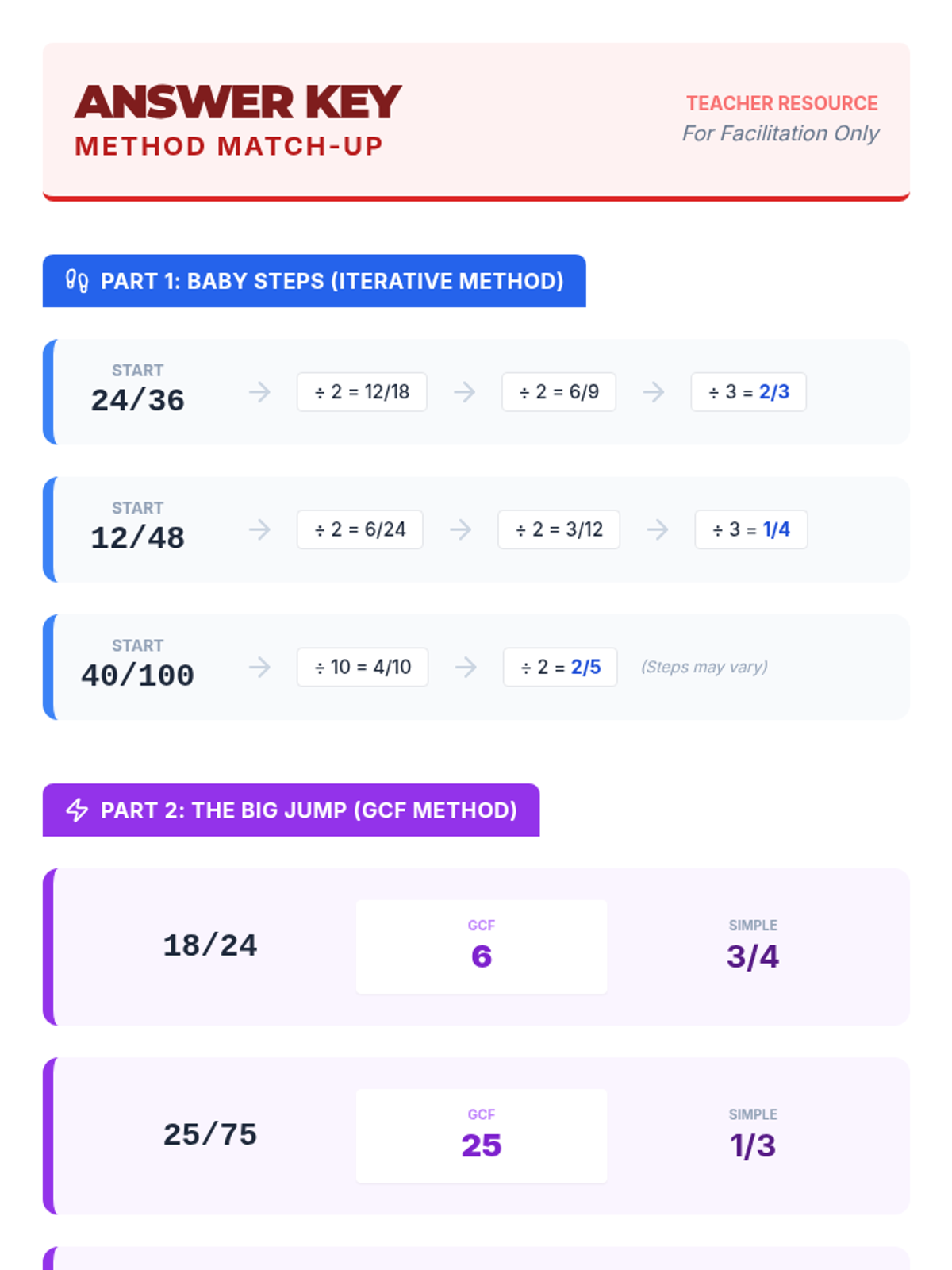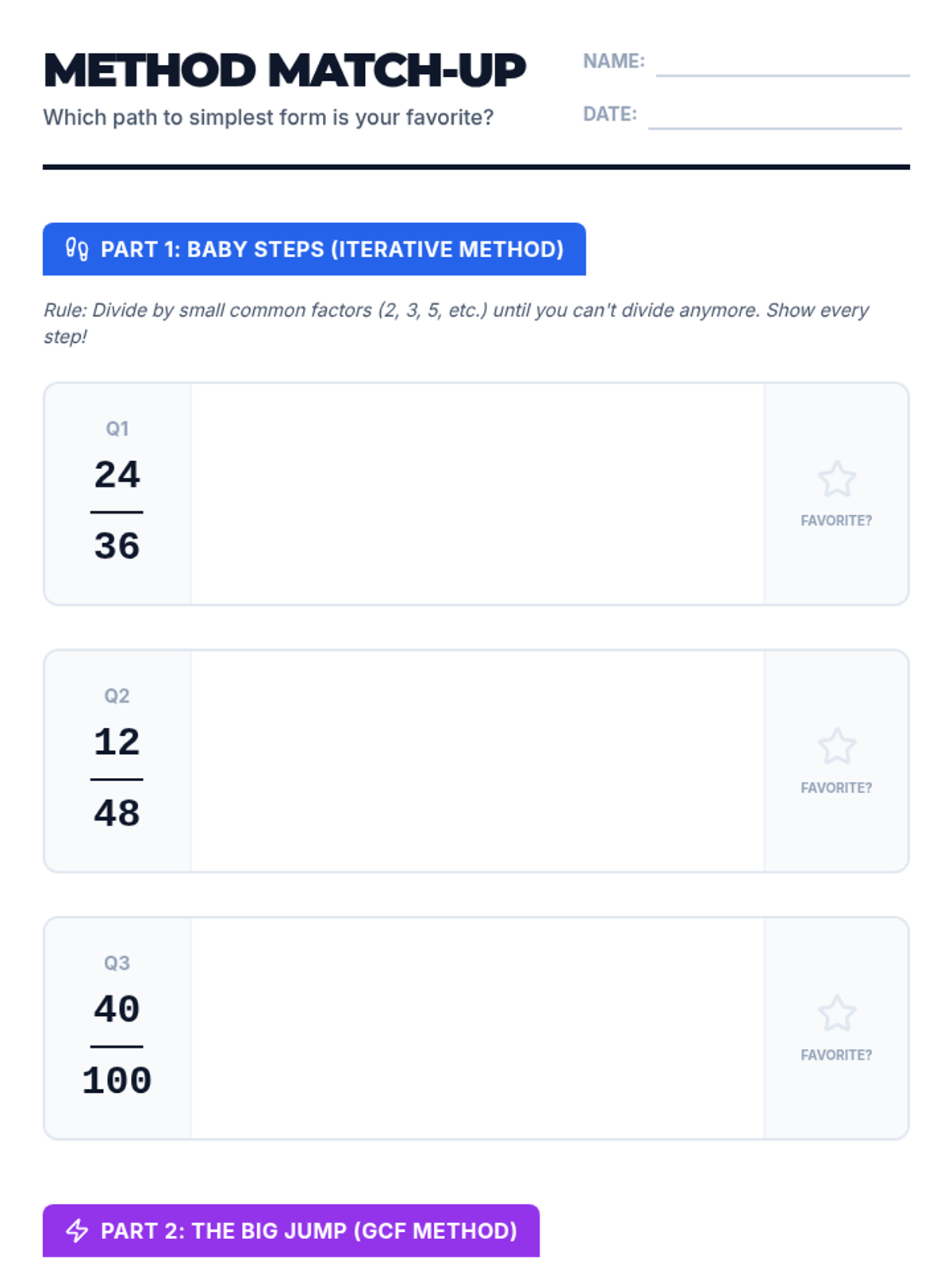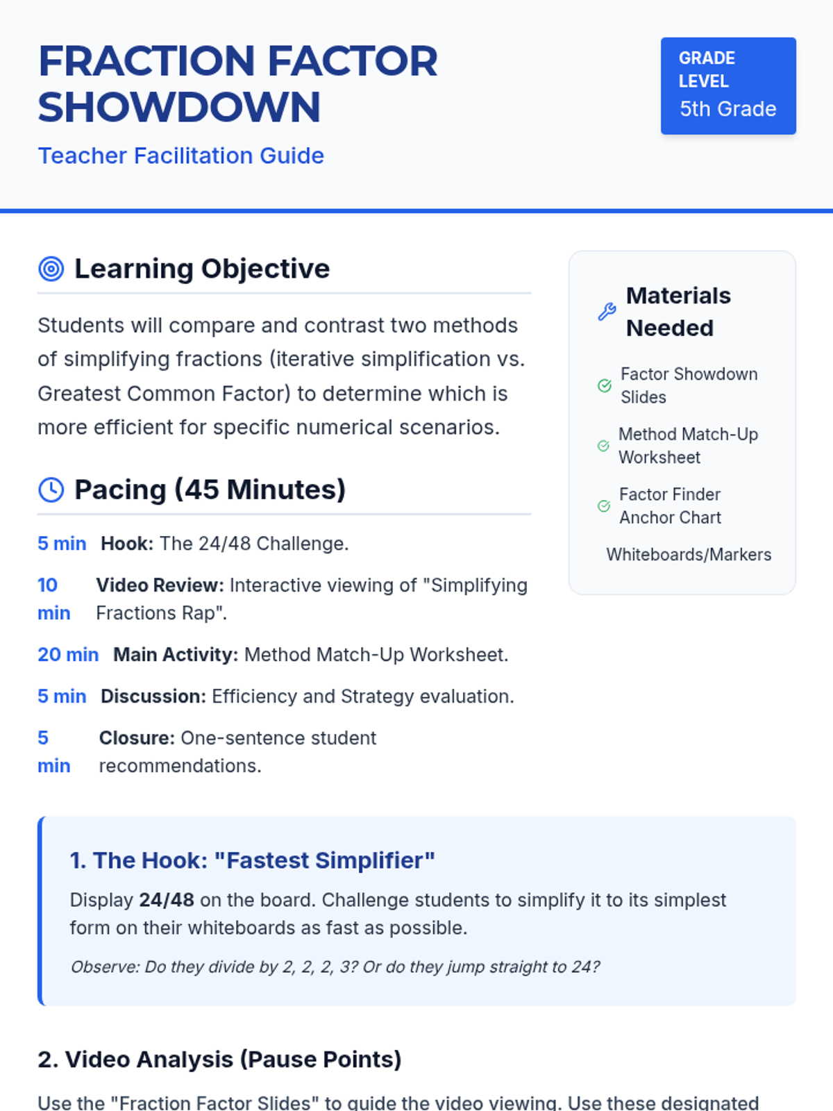 In this lesson, 5th-grade students compare and contrast two methods of simplifying fractions: the iterative 'Baby Steps' method and the 'Big Jump' GCF method. Students use a musical video as a guide to evaluate the efficiency of each approach through a structured 'Method Match-Up' activity.