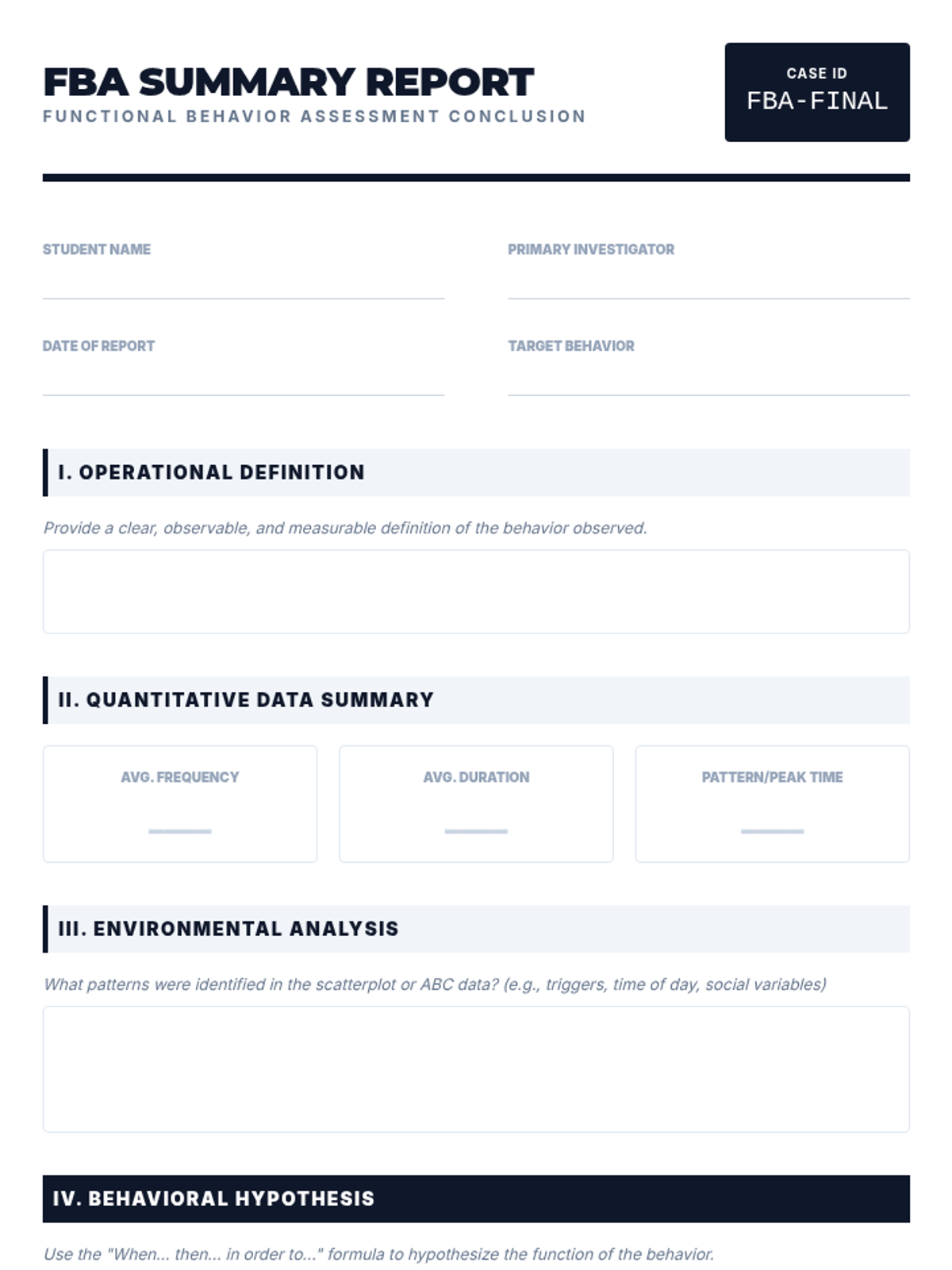 Students synthesize their data collection and analysis skills by producing a professional FBA Summary Report. They learn to present findings objectively and justify behavioral hypotheses using evidence.