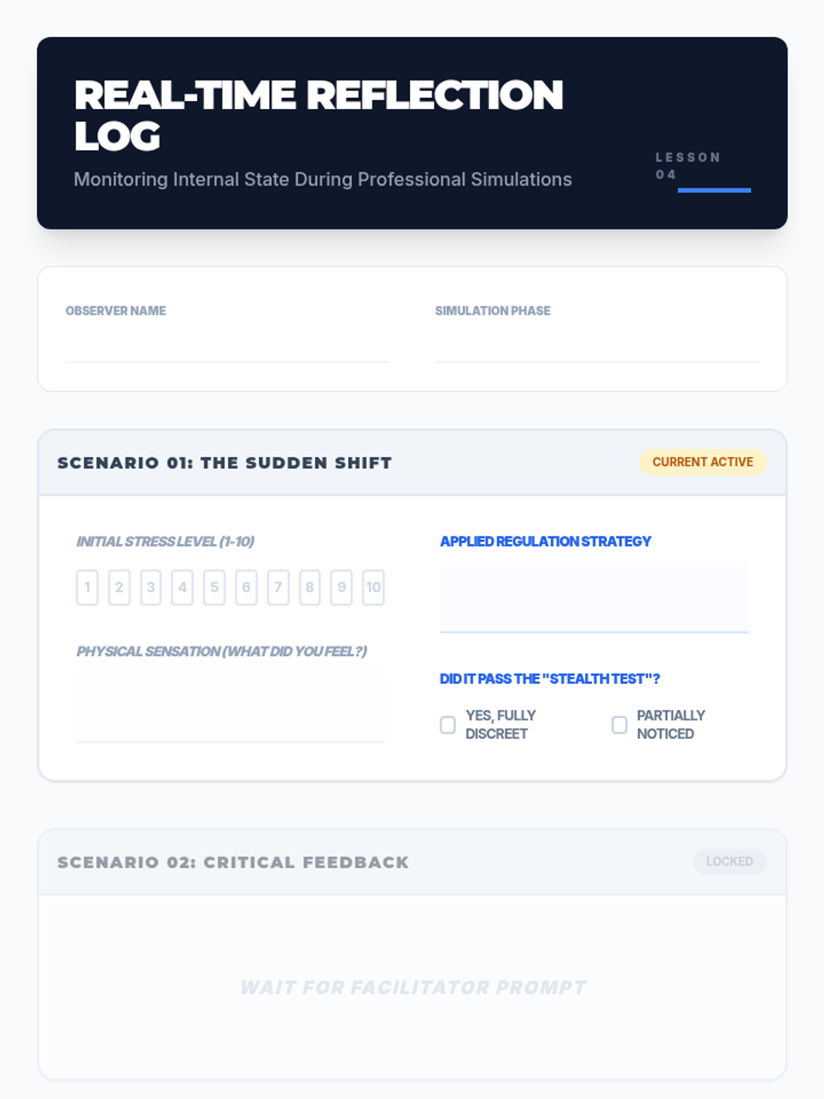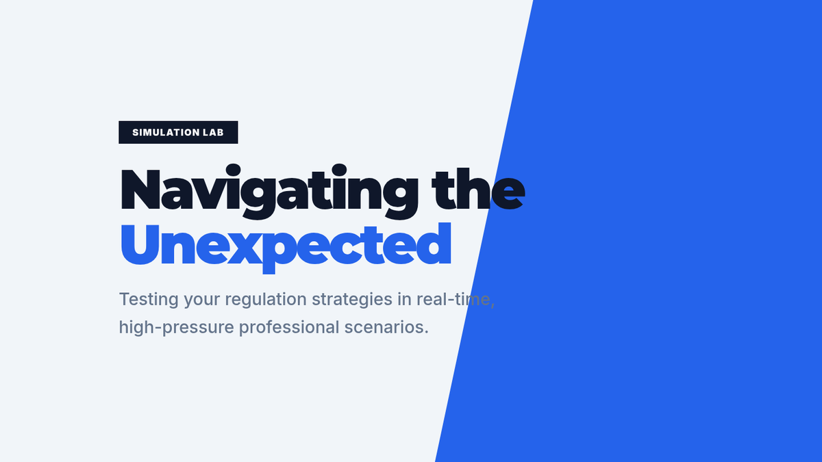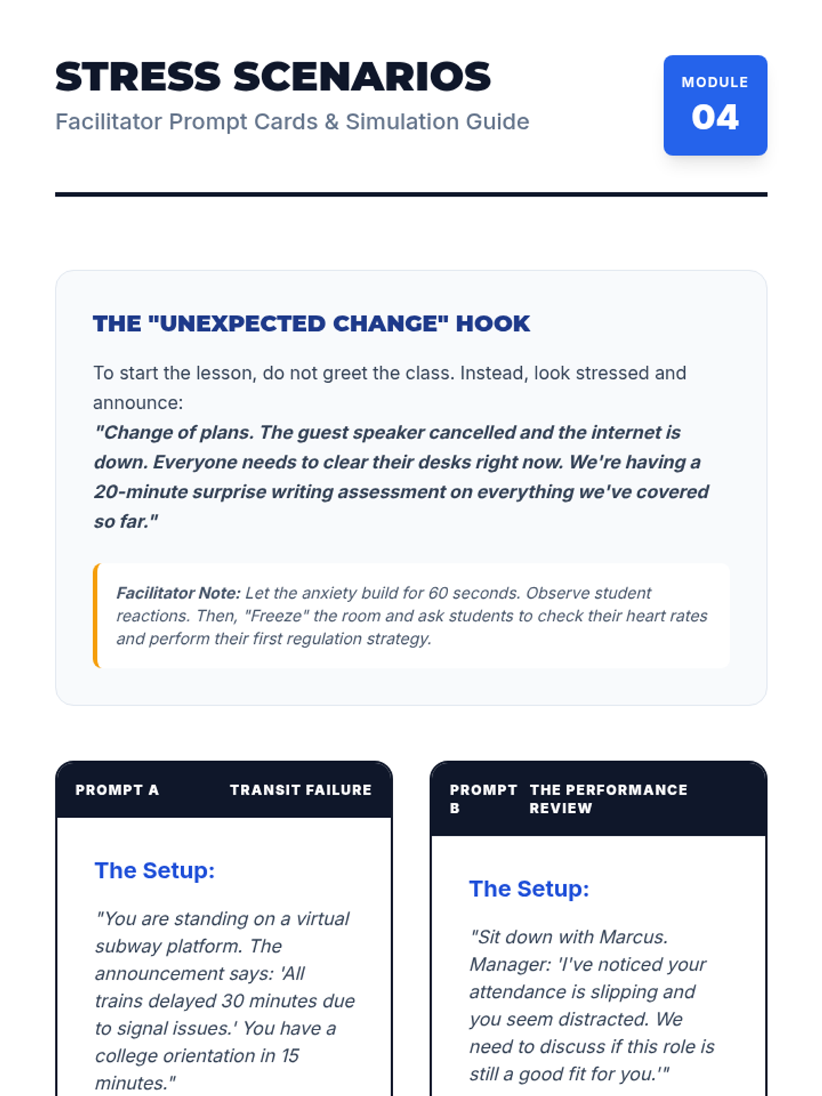 Students practice real-time regulation during high-stress simulations like performance reviews or transit disruptions.