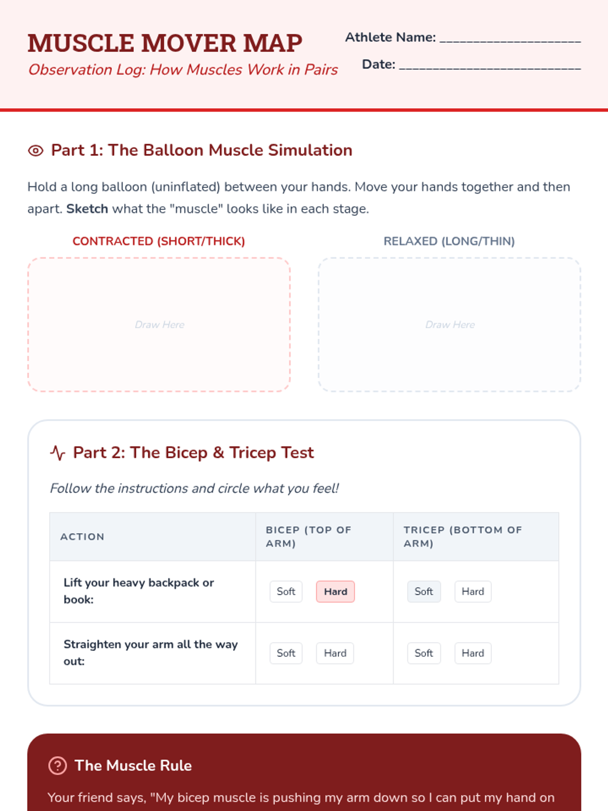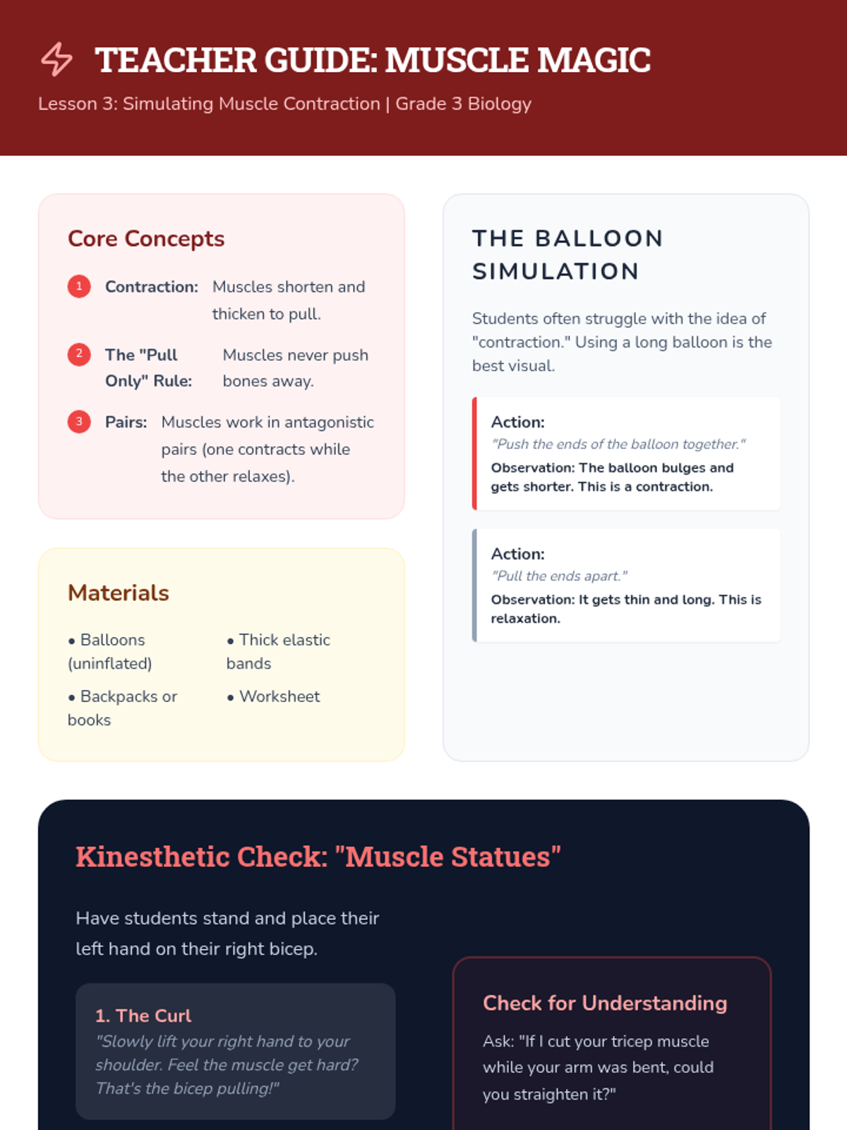 Students discover the mechanics of muscle contraction and relaxation, learning that muscles pull on bones to create movement through antagonistic pairs.