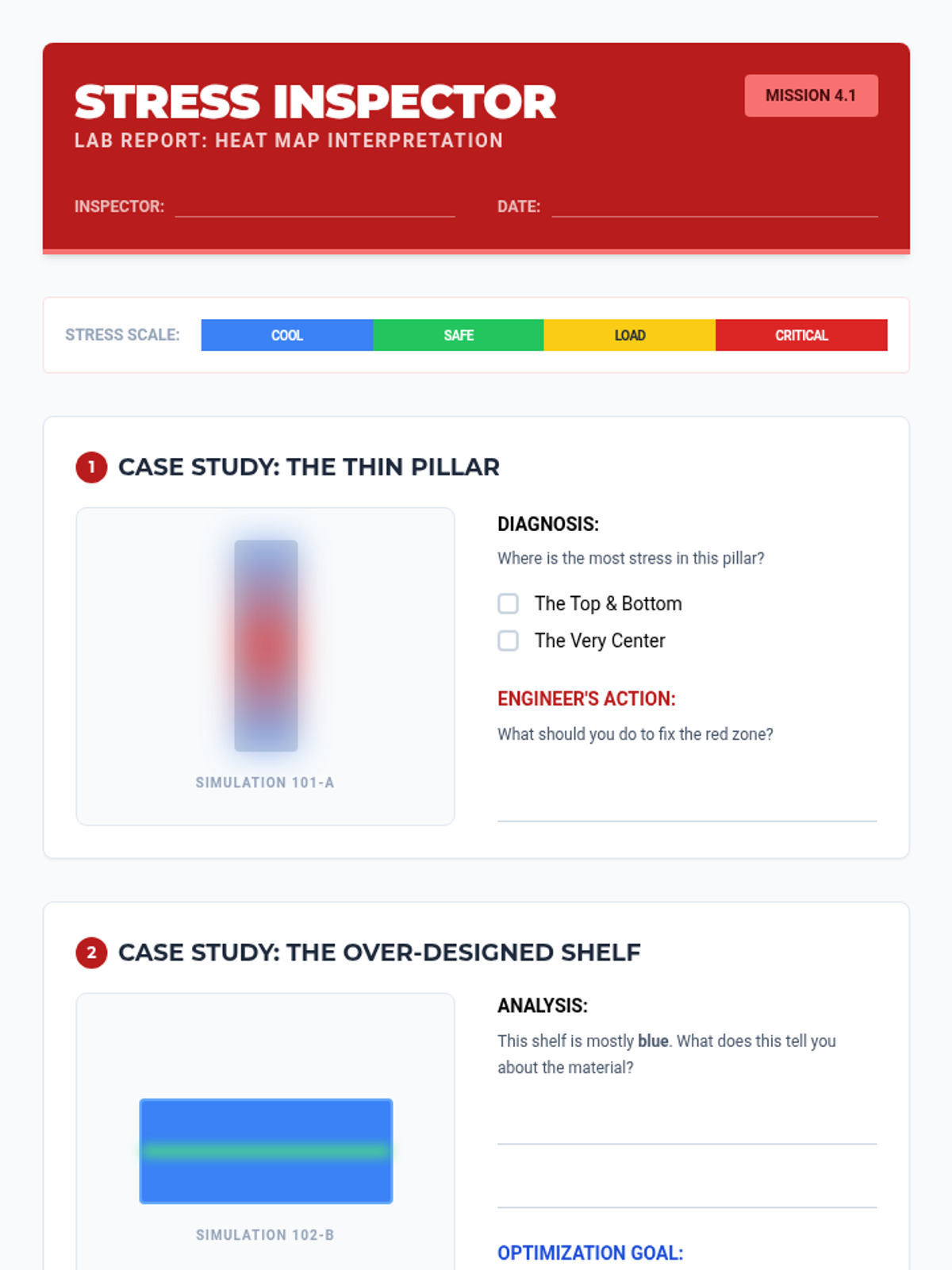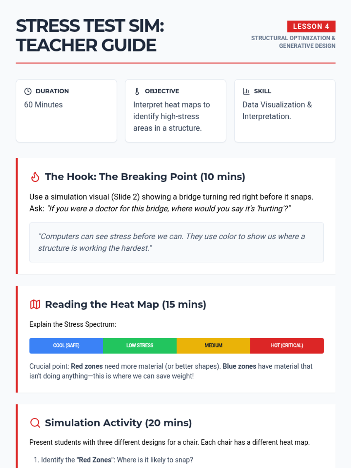 Using visual metaphors like heat maps, students visualize stress on designs to identify areas needing optimization.