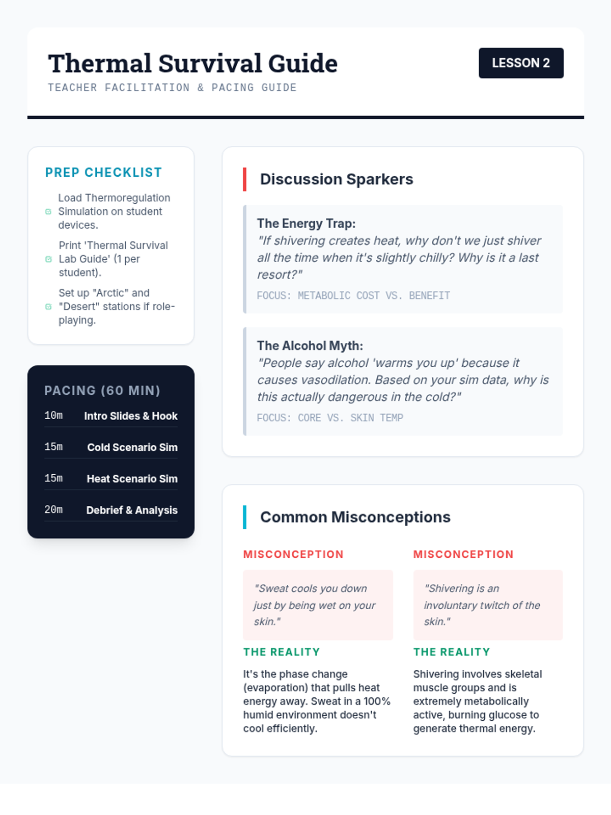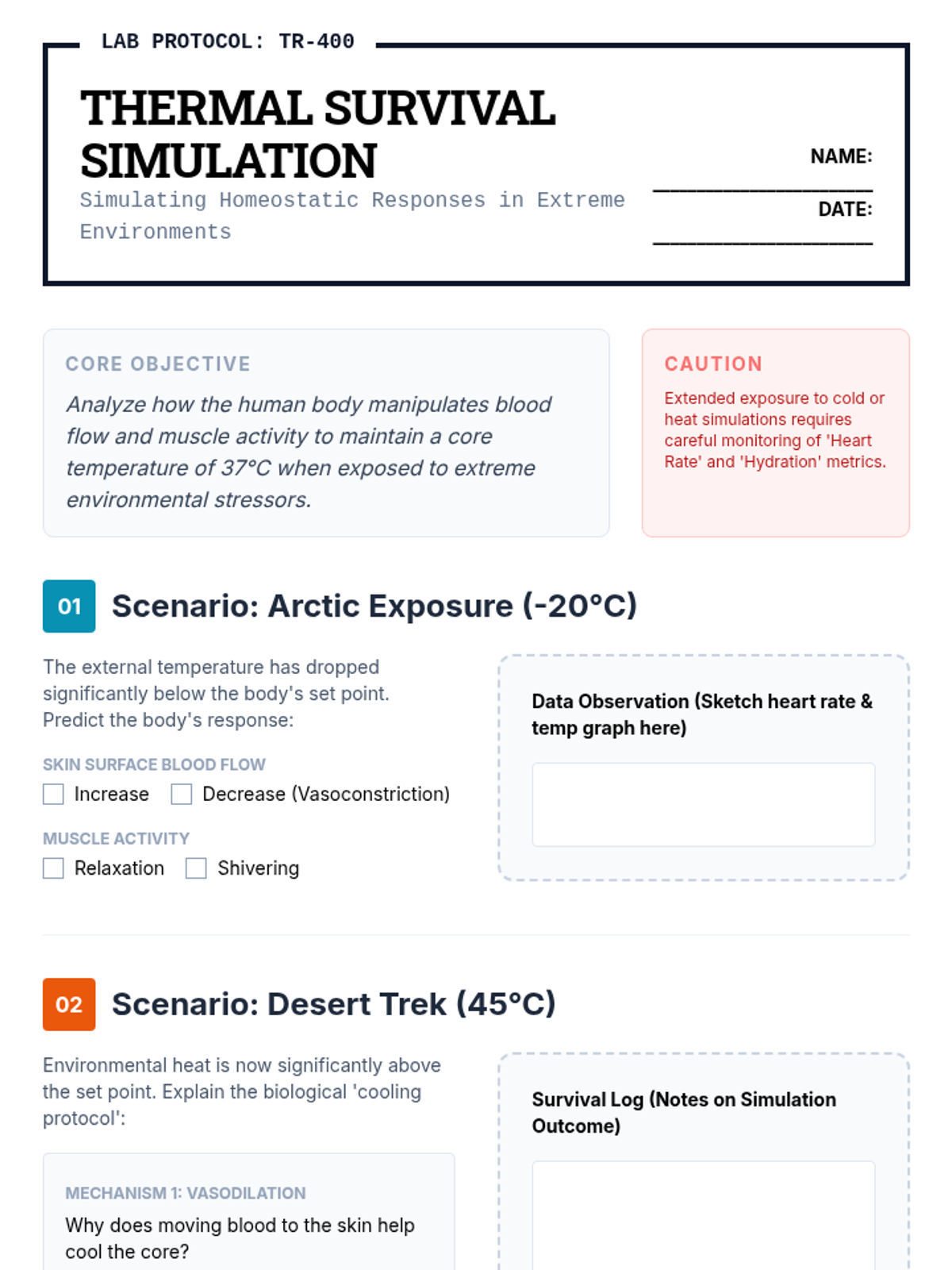 A simulation-based lesson where students analyze physiological responses like vasodilation, sweating, and shivering to maintain core temperature in extreme environments.