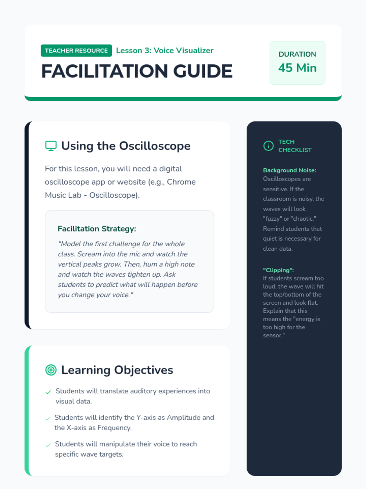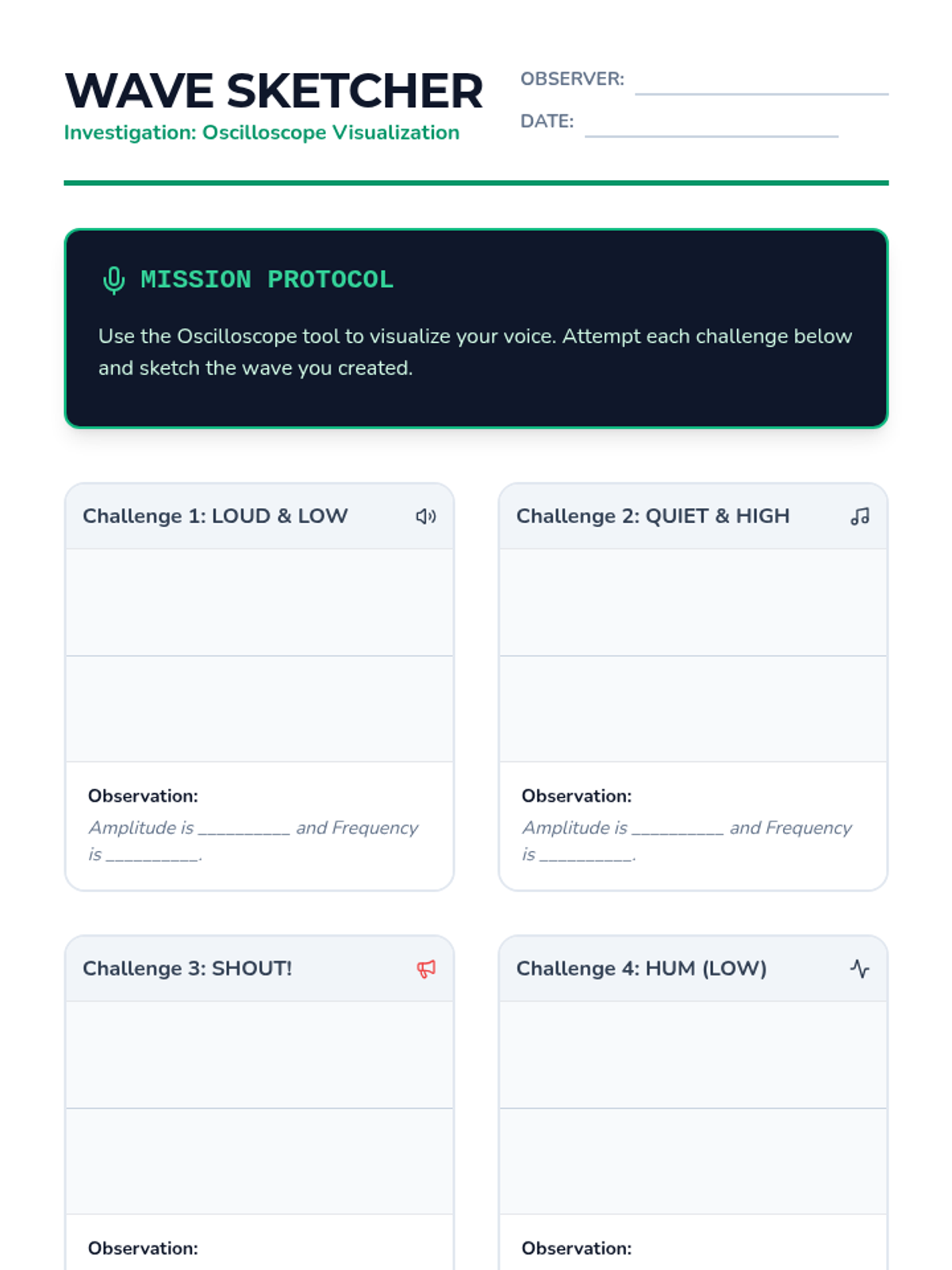 Students use a digital oscilloscope visualization tool to see their own voices. They attempt to produce specific wave shapes by altering their volume and pitch.