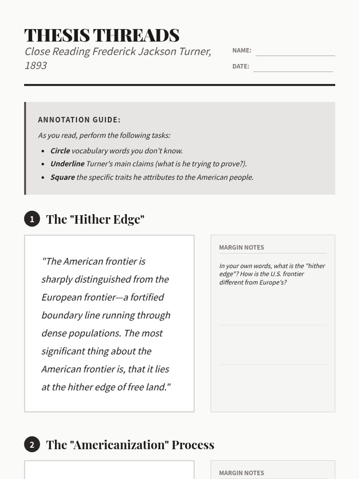 A deep-dive literacy lesson focusing on Turner's 1893 essay. Students practice close reading and annotation to identify his core arguments regarding the safety valve theory and the 'Americanization' process.