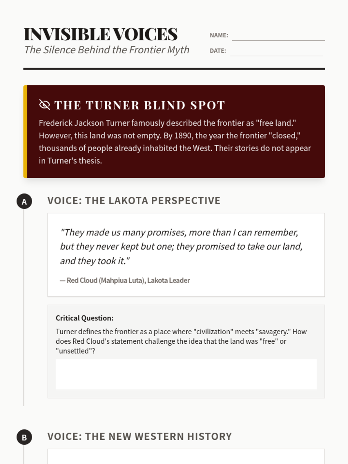 A critical evaluation of the Frontier Thesis through the lens of 'The New Western History.' Students analyze whose voices were left out and how Turner's narrative justified westward expansion at the expense of others.