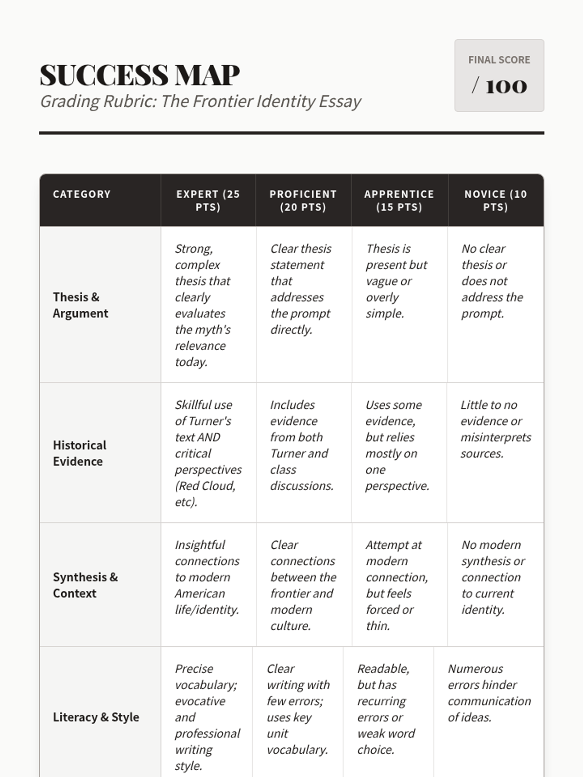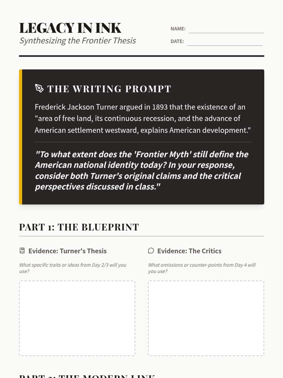 The final synthesis of the unit where students craft an evidence-based argument regarding the continued influence of the frontier myth on modern American identity.