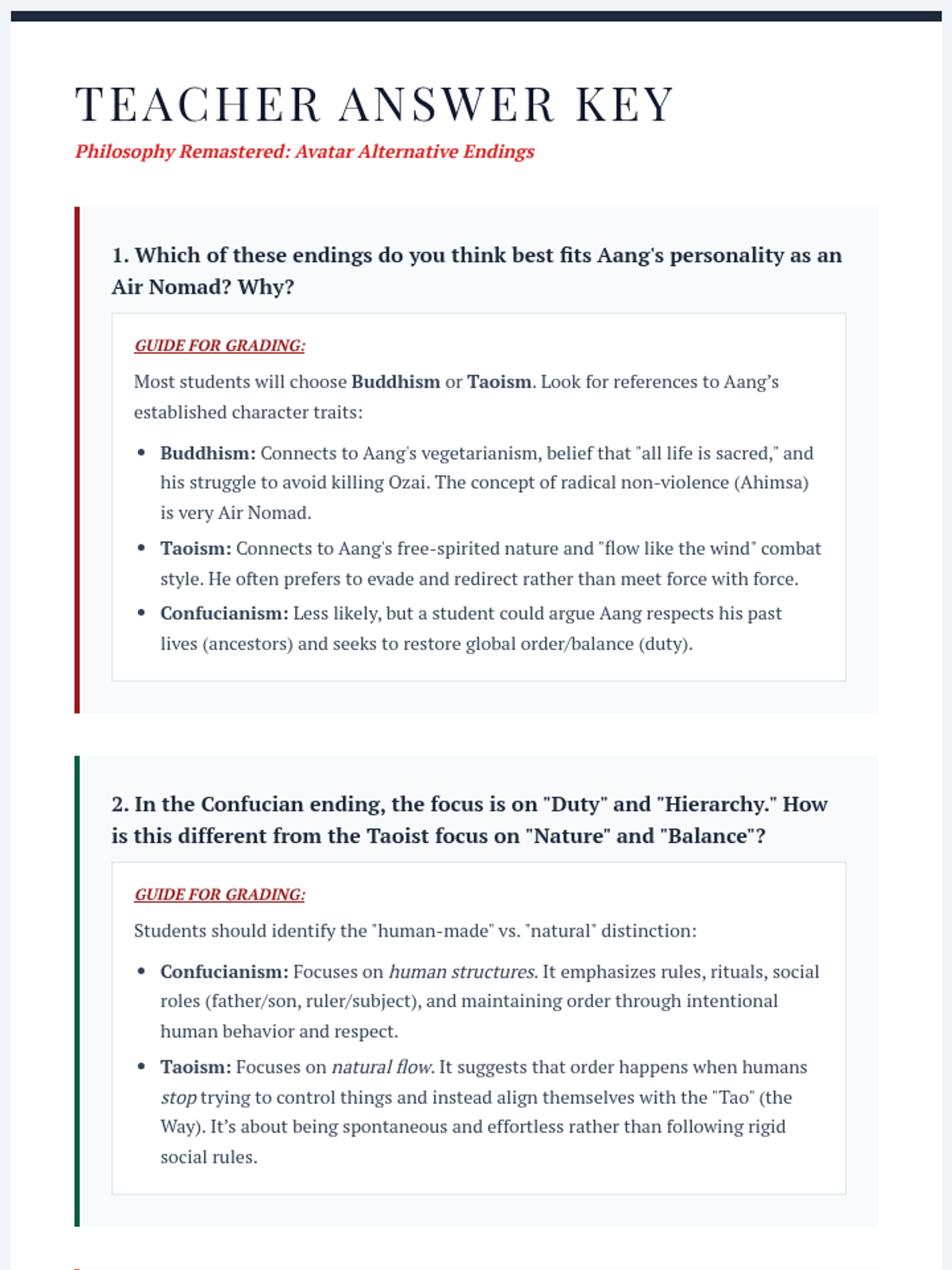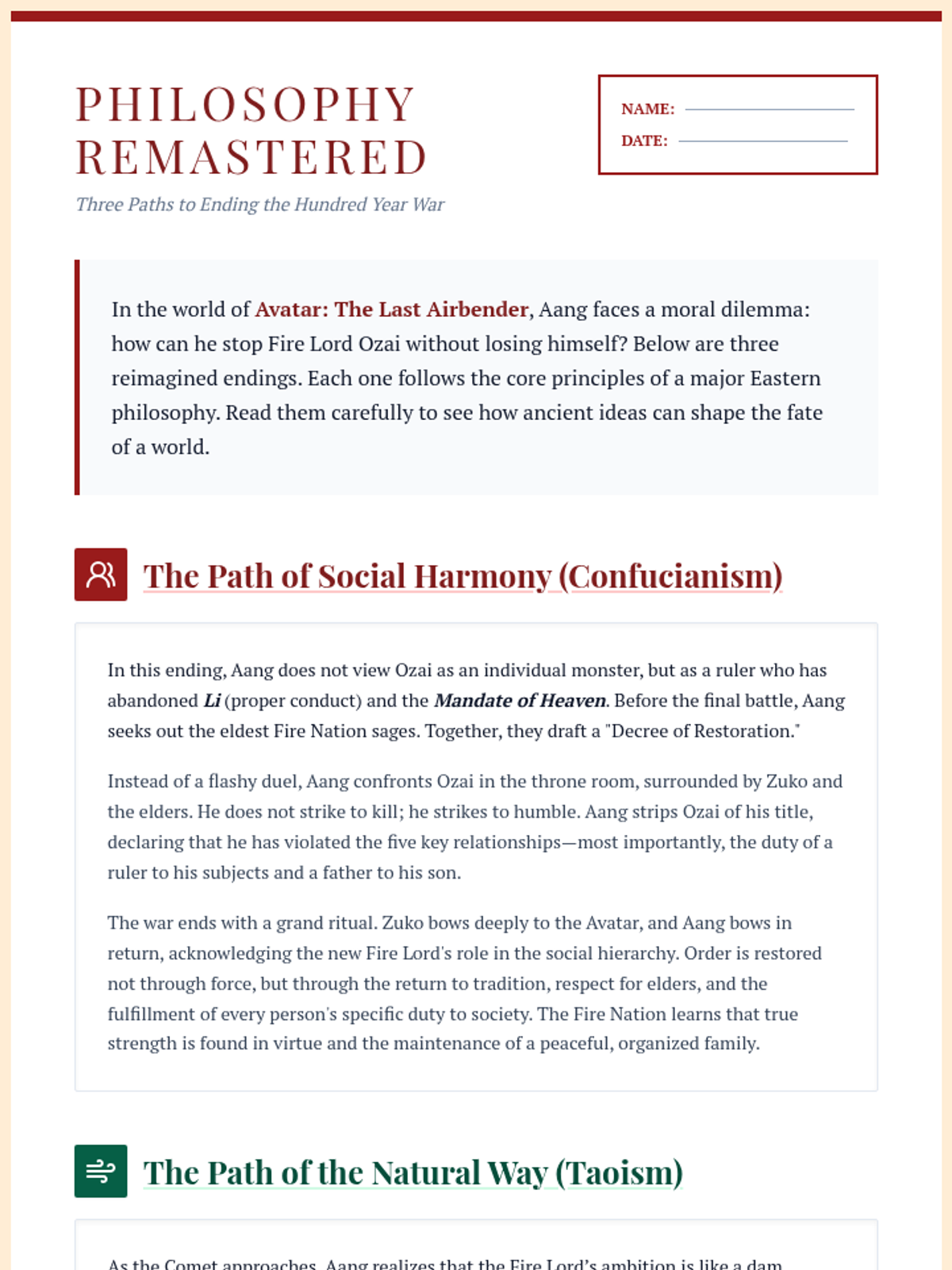 Students explore the core tenets of Confucianism, Taoism, and Buddhism by analyzing three alternative endings to the Avatar: The Last Airbender series, each reflecting a different Eastern philosophy.
