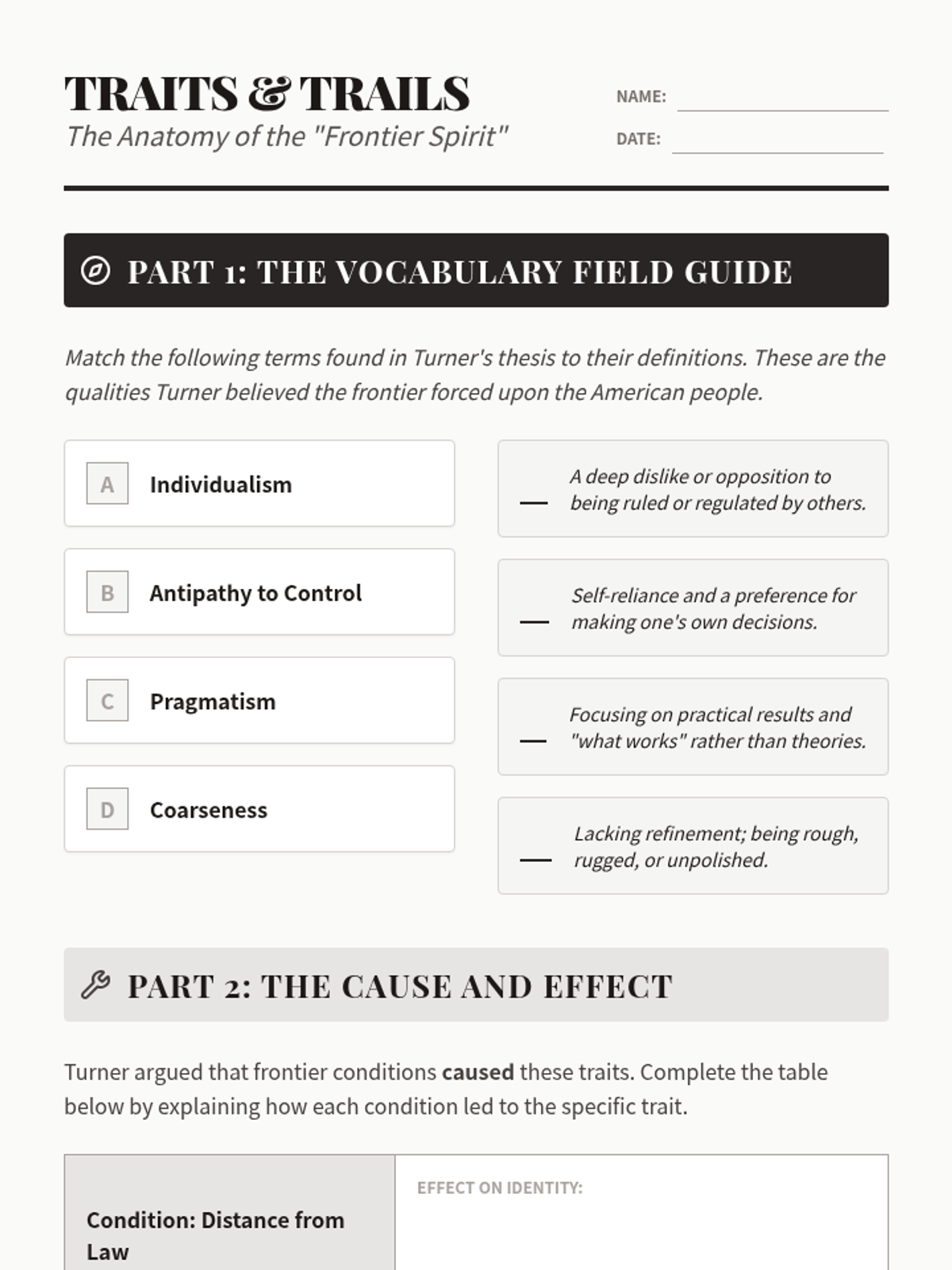 Examination of the specific personality traits Turner attributed to frontier life: individualism, practicality, and democratic spirit. Students analyze how these traits became embedded in the American identity.