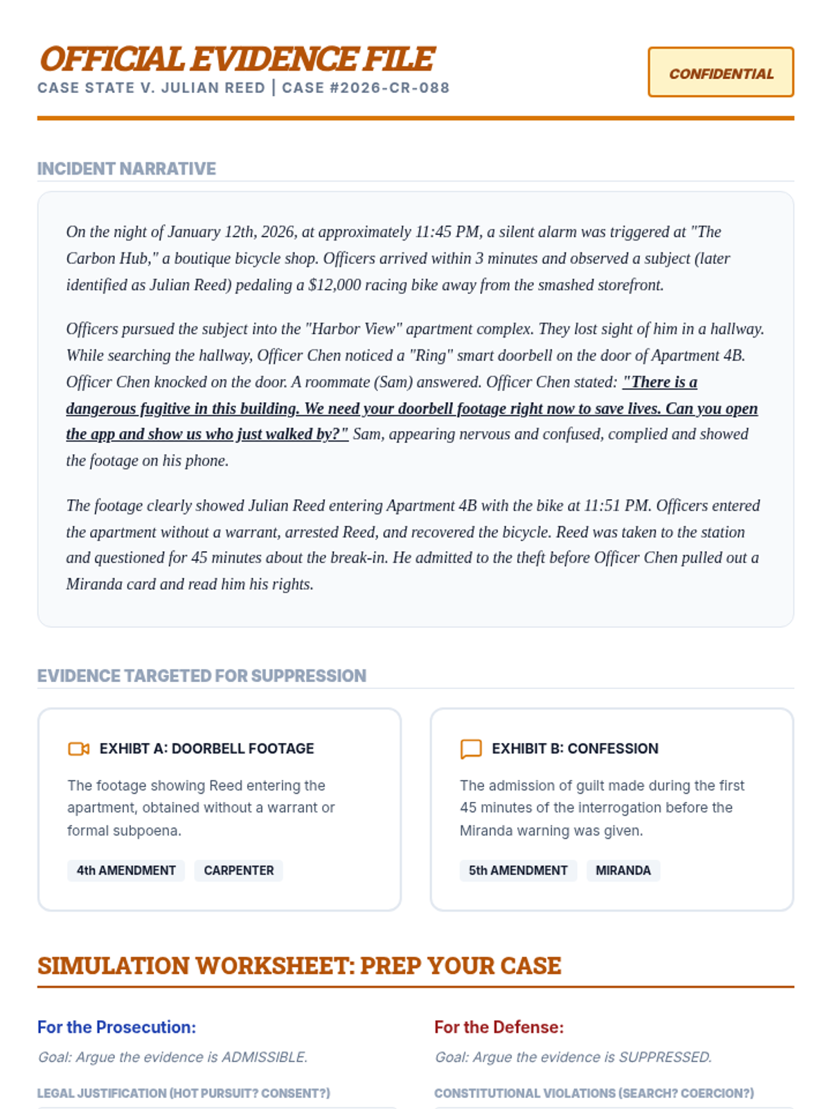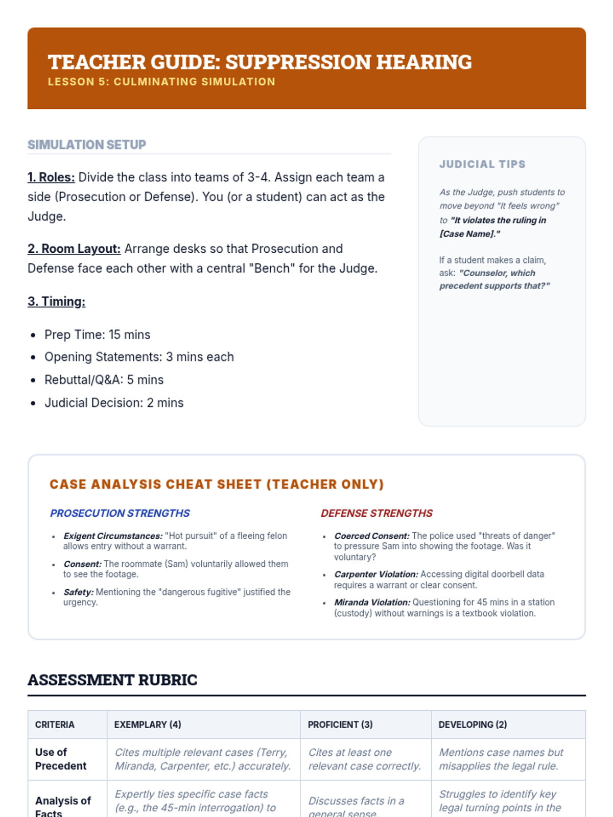 A culminating mock suppression hearing where students apply their knowledge of constitutional law to argue for or against the admissibility of evidence.