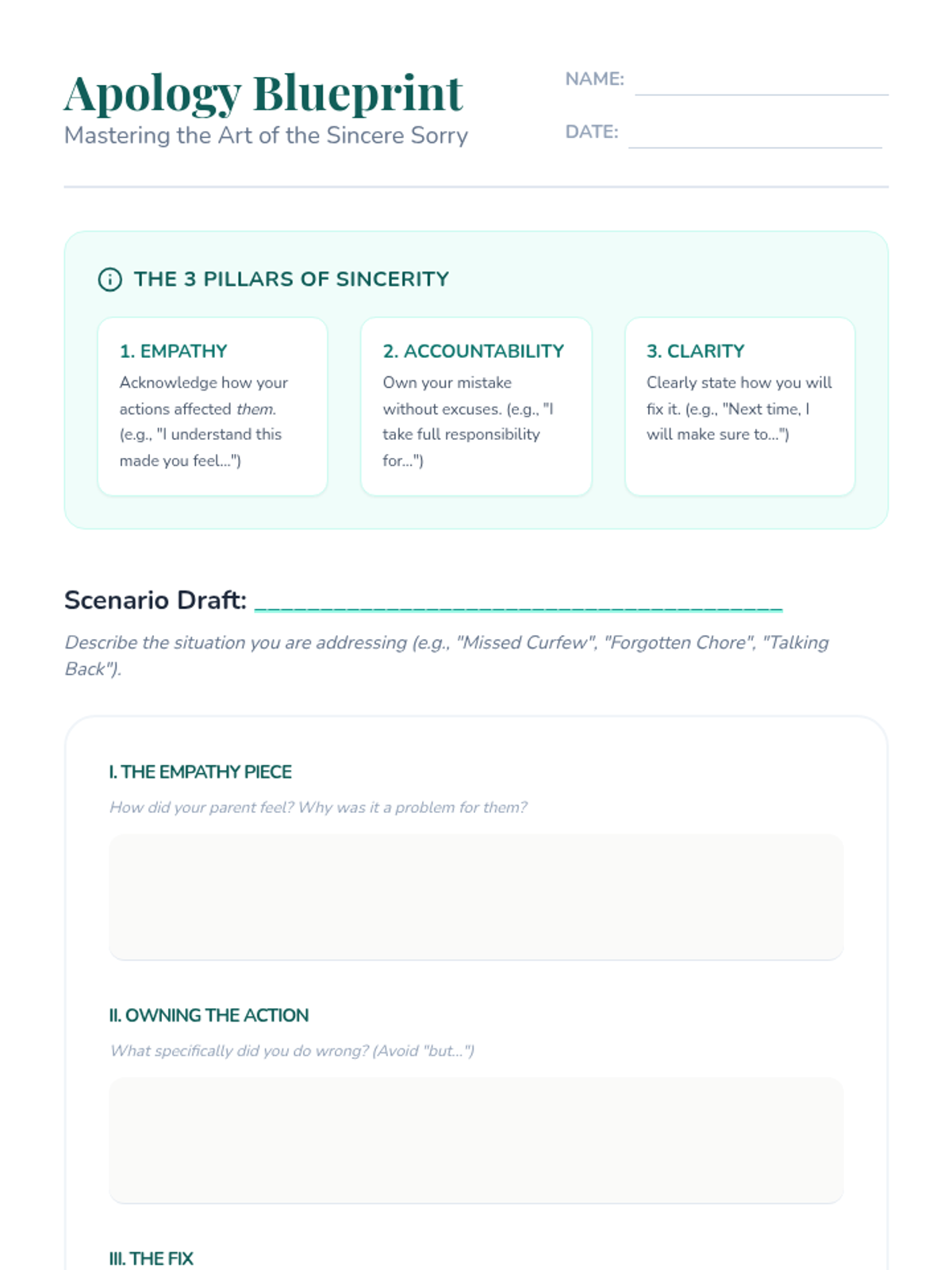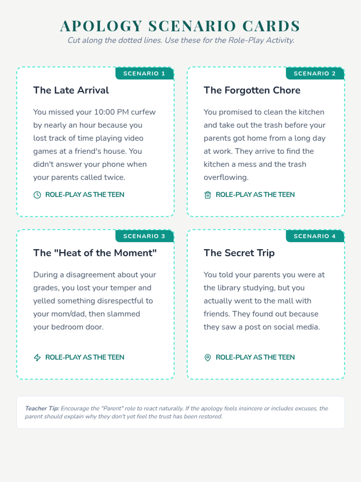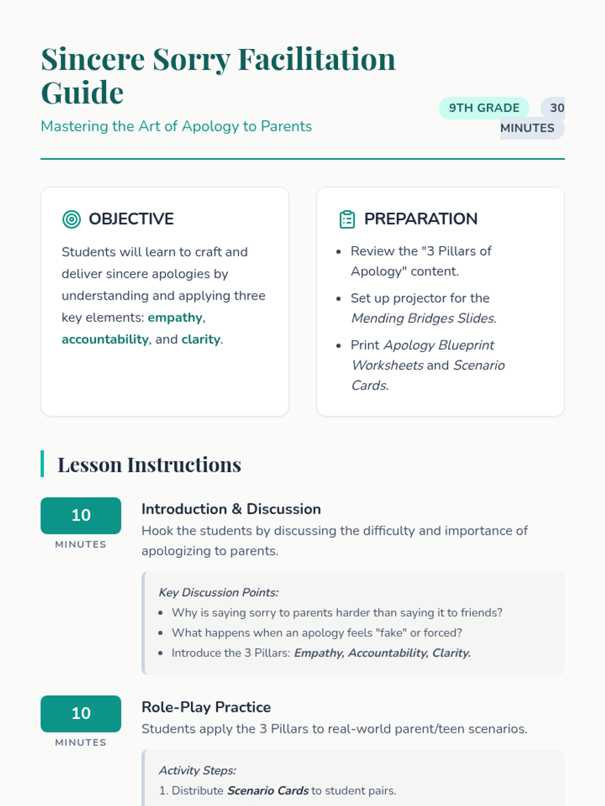 A 30-minute lesson for 9th graders on the essential life skill of crafting and delivering sincere apologies to parents, focusing on empathy, accountability, and clarity.