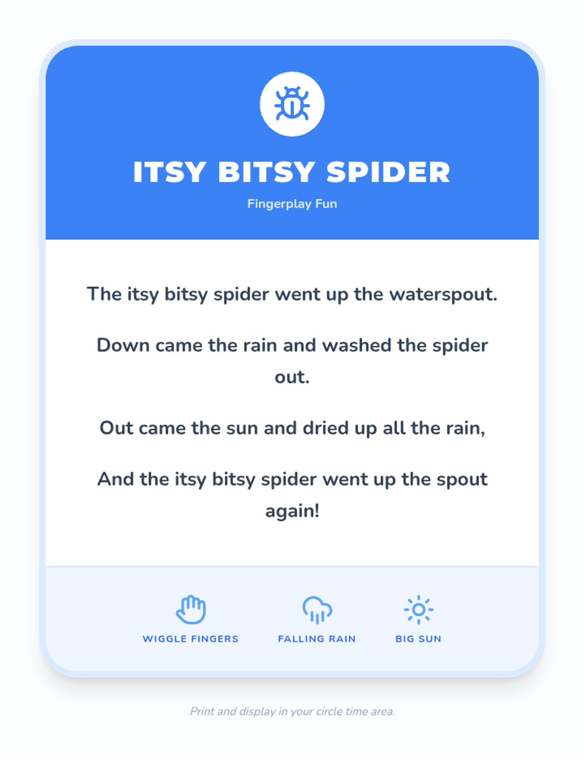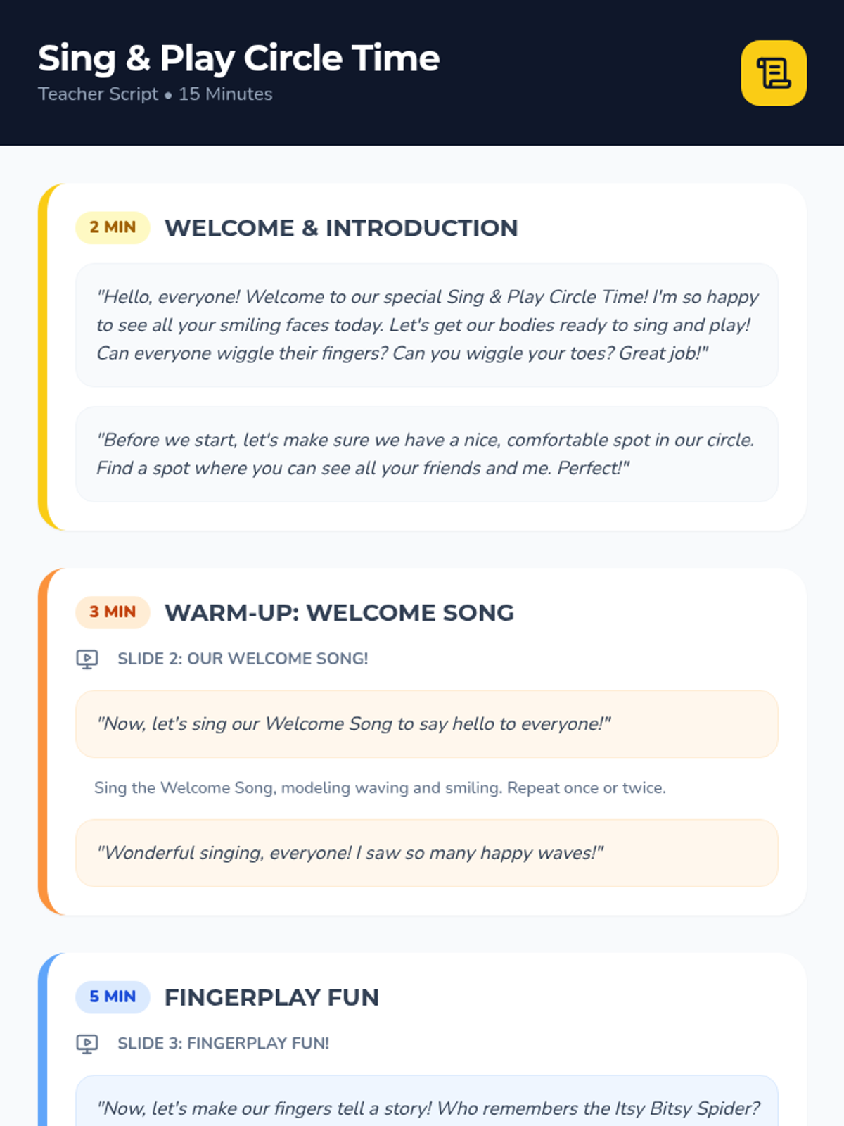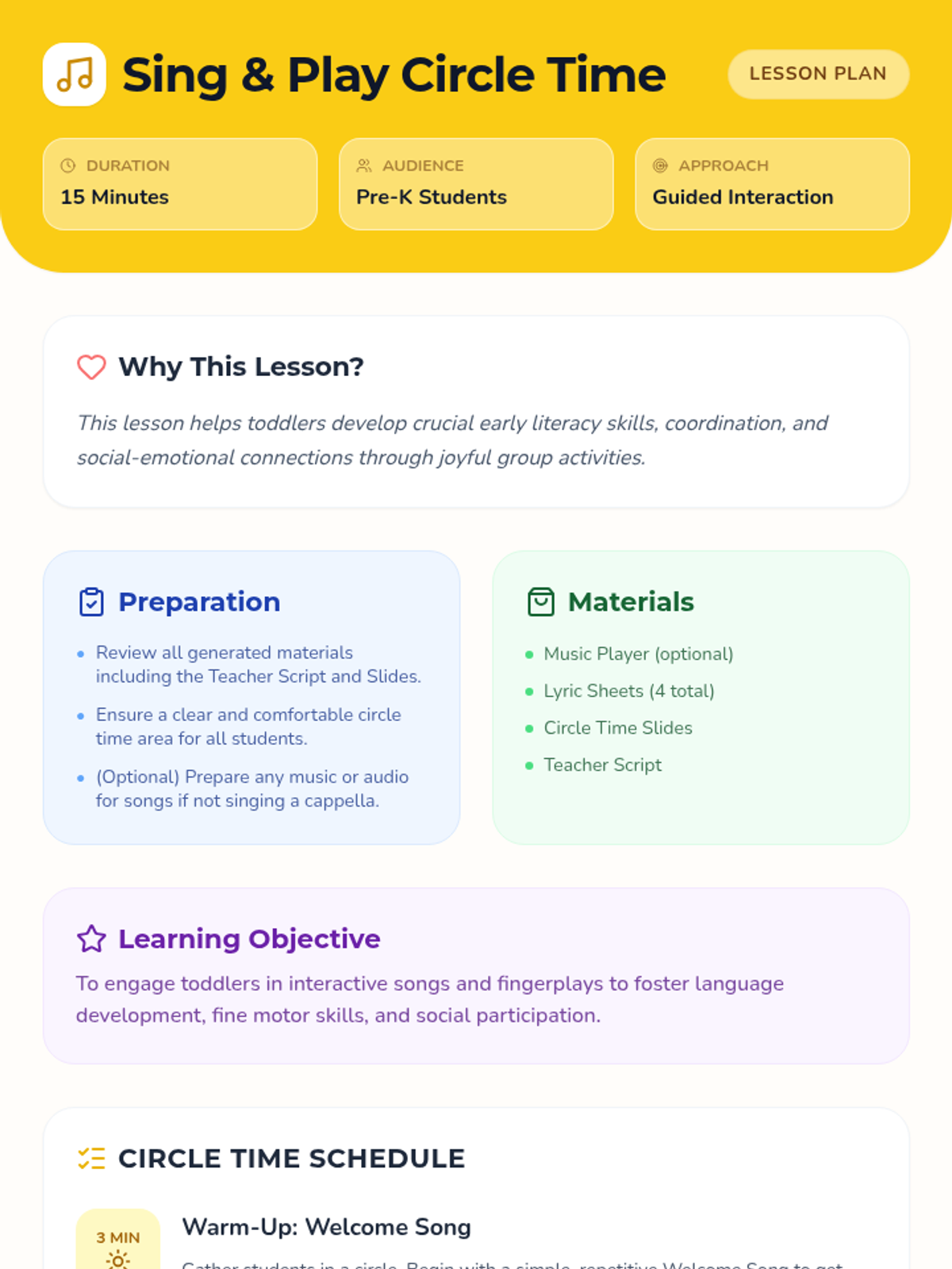 A high-energy, interactive 15-minute circle time for toddlers focusing on early literacy, motor skills, and social connection through songs and fingerplays.