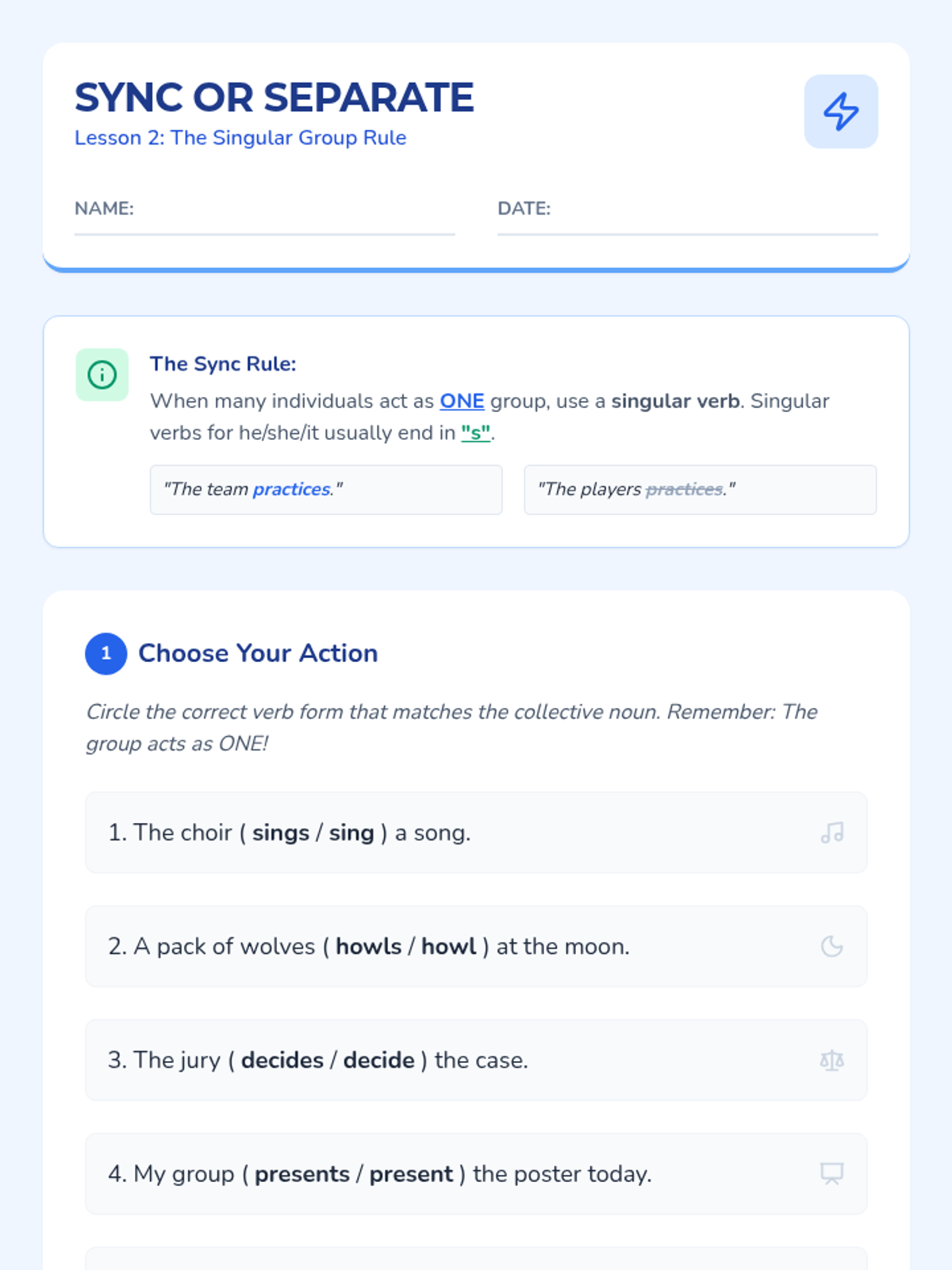 Students participate in a physical simulation to understand that when a group acts together, it takes a singular verb. They practice conjugating verbs for collective nouns.