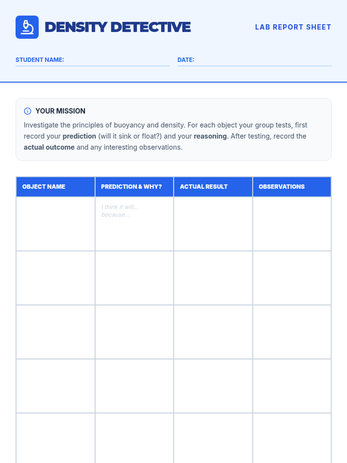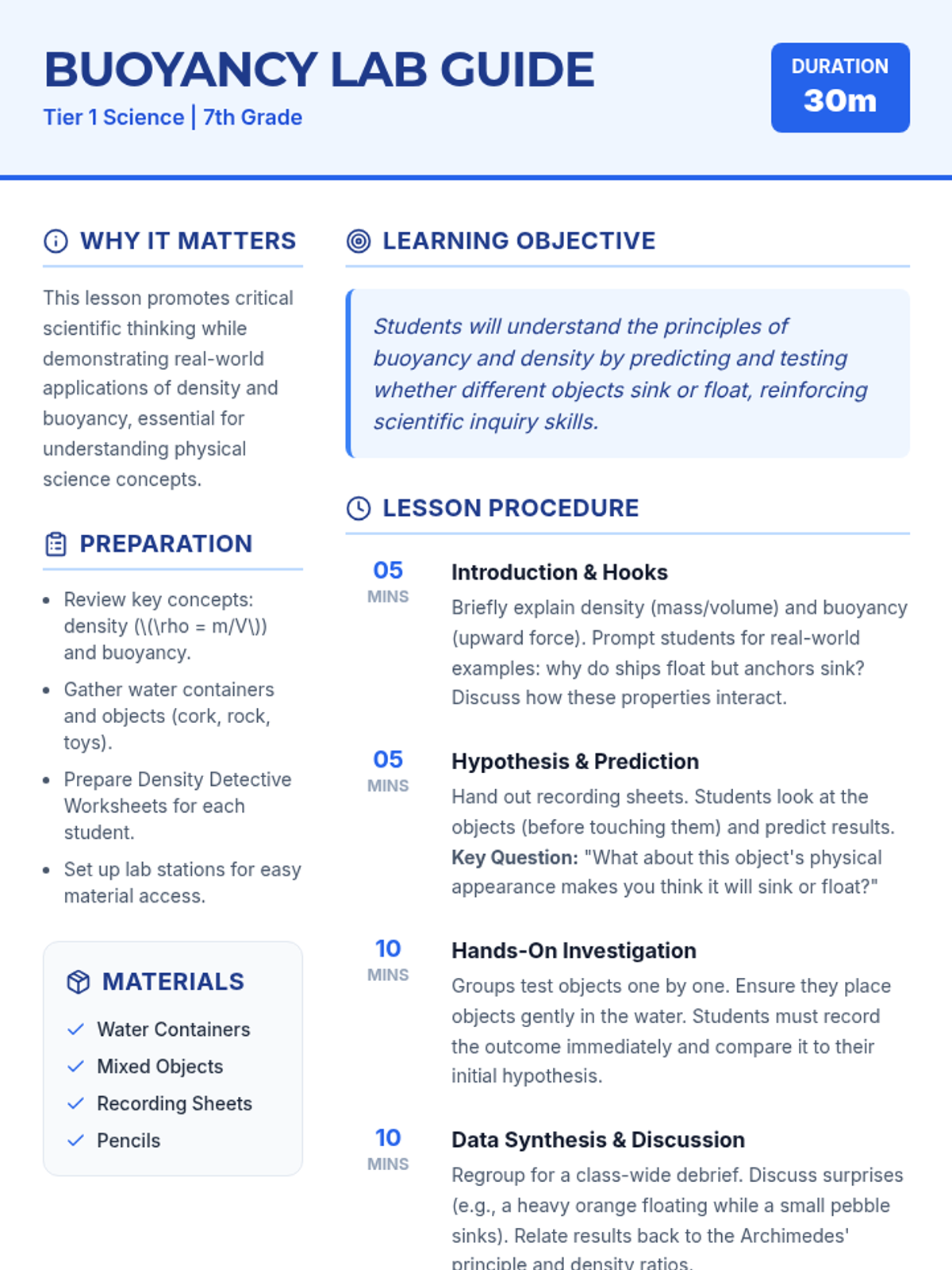 A hands-on exploration of buoyancy and density where 7th-grade students predict and test the floating properties of various objects through scientific inquiry.