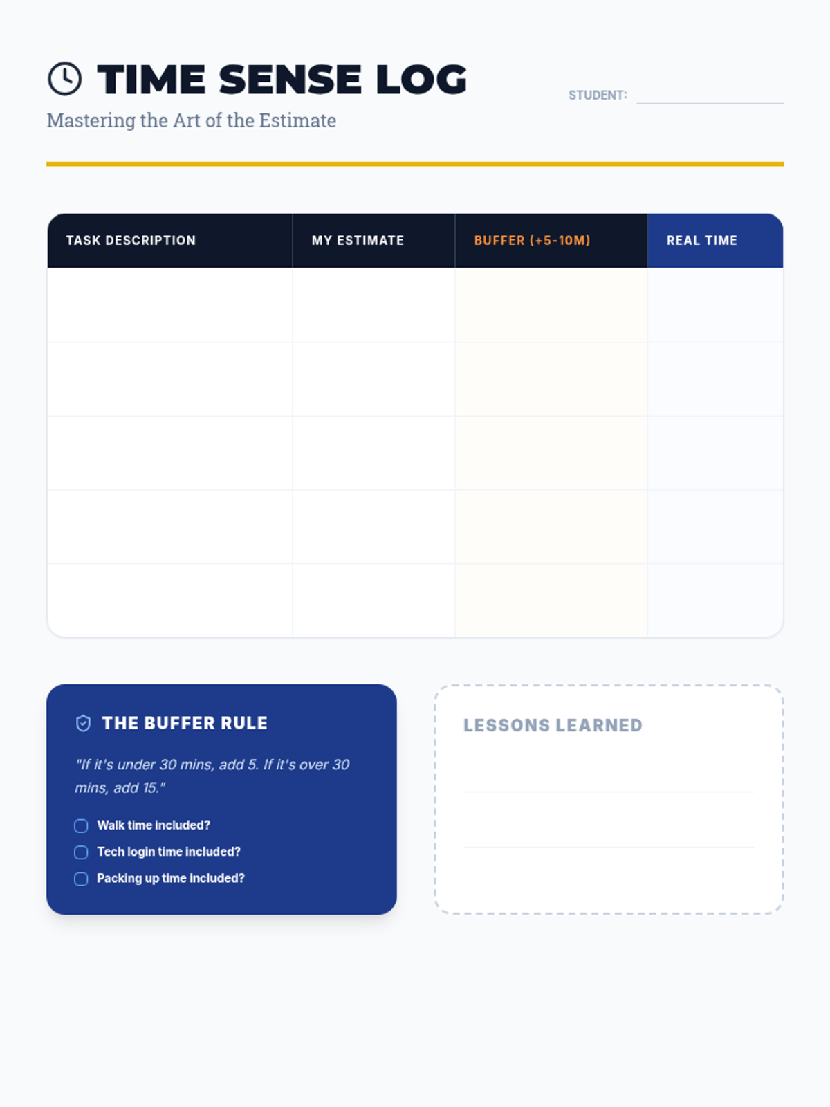 Students develop the skill of 'time sensing' by estimating task duration and accounting for transitions and distractions.