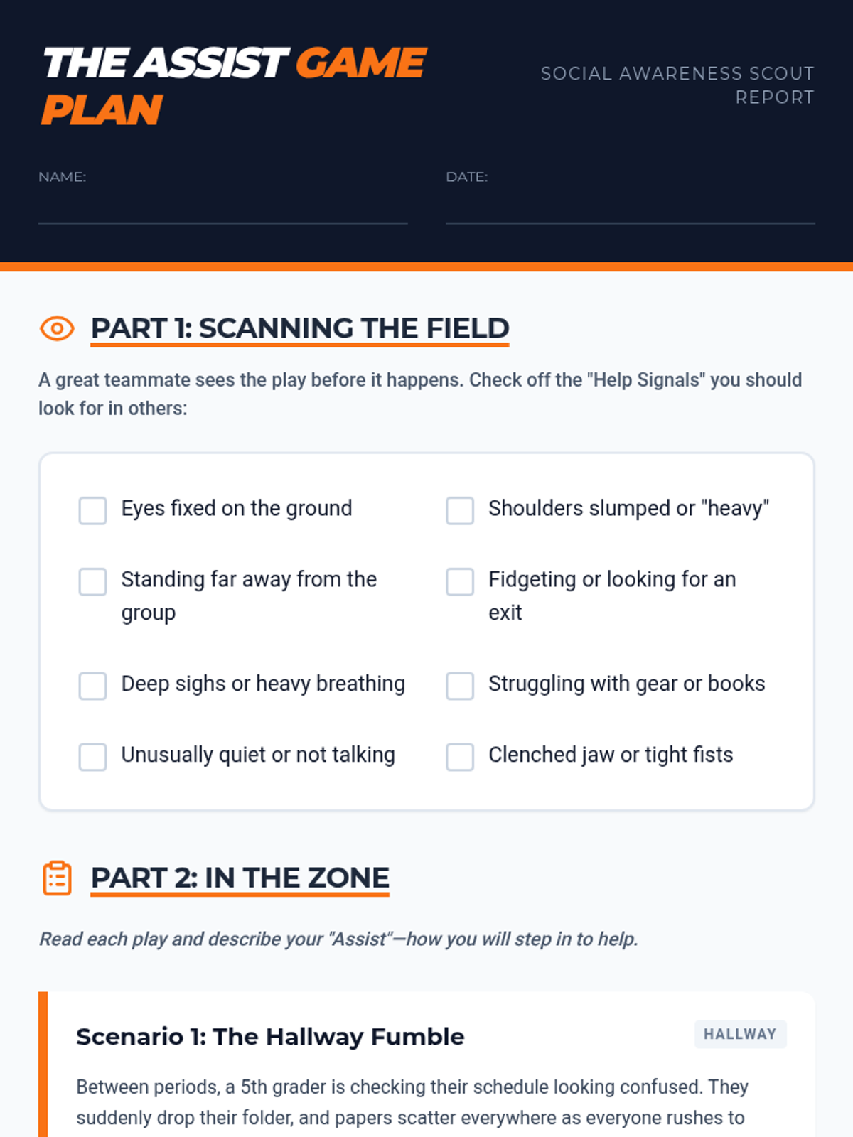 A lesson designed for 6th-grade boys to develop social awareness by identifying non-verbal "help signals" and practicing prosocial responses in school and sports settings.