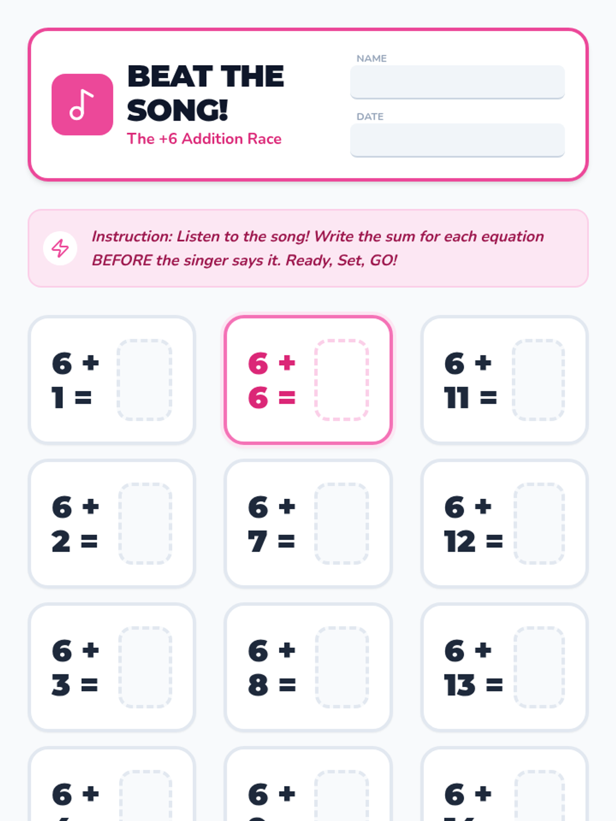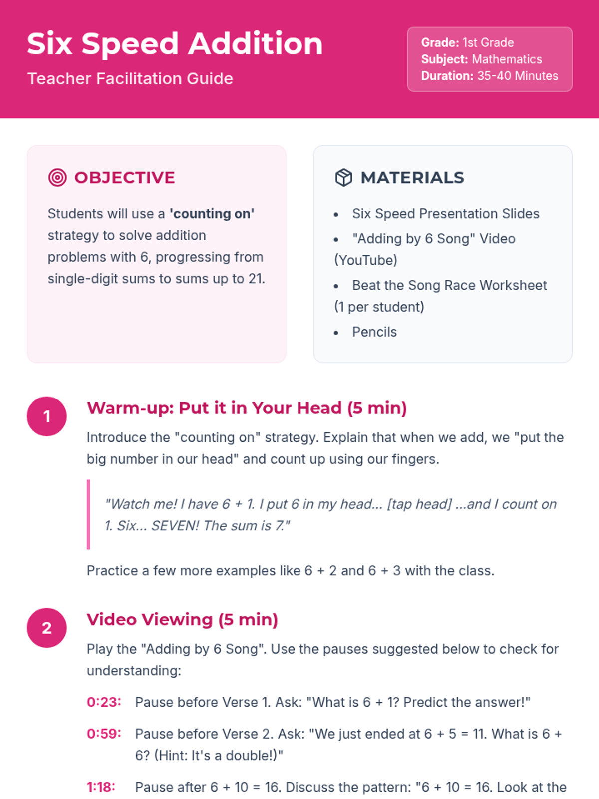 A fast-paced 1st Grade lesson where students use a 'counting on' strategy to master adding 6, featuring a rhythmic challenge to solve equations before they are sung in a music video.