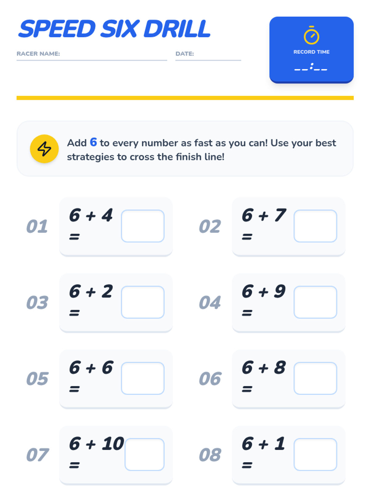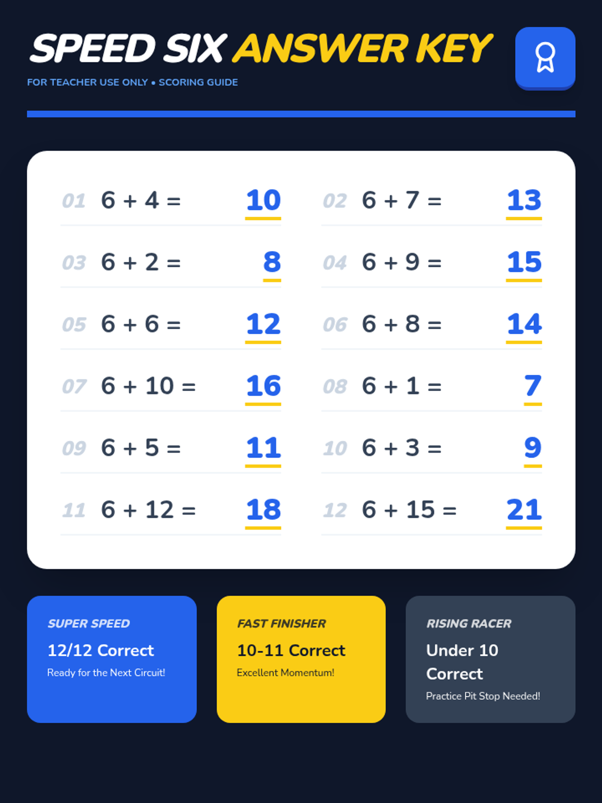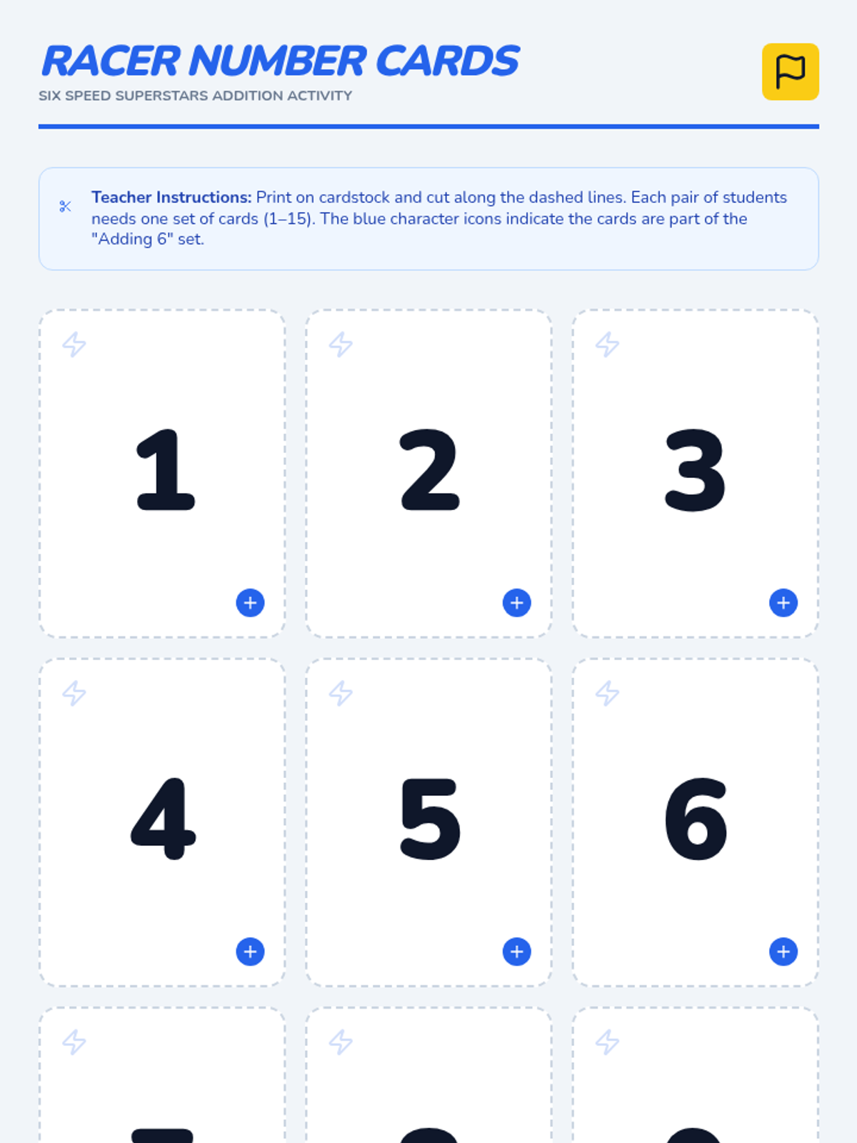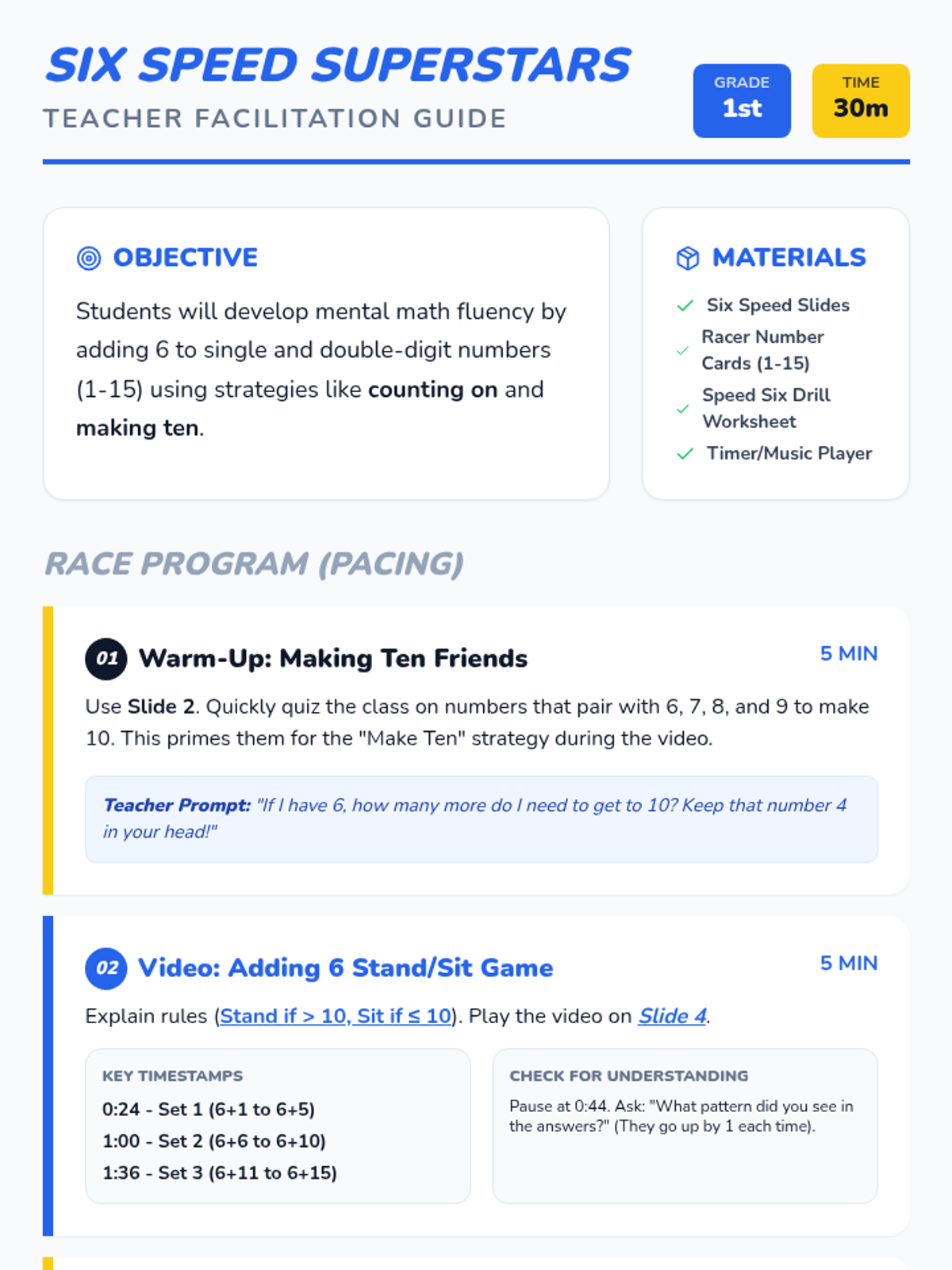 A high-energy 1st grade math lesson focused on adding 6 using mental math strategies like counting on and making ten, featuring a music video and a flashcard race activity.