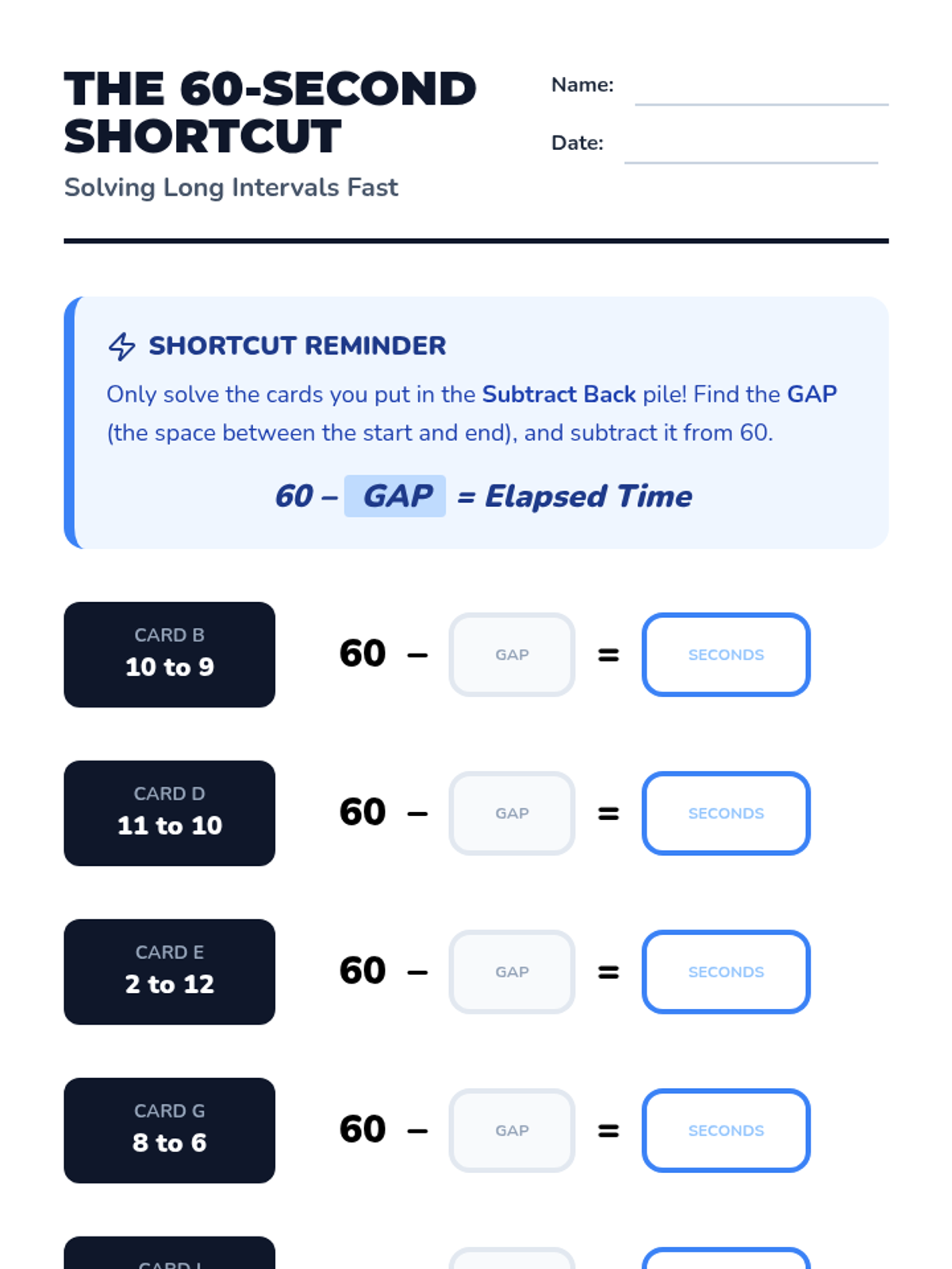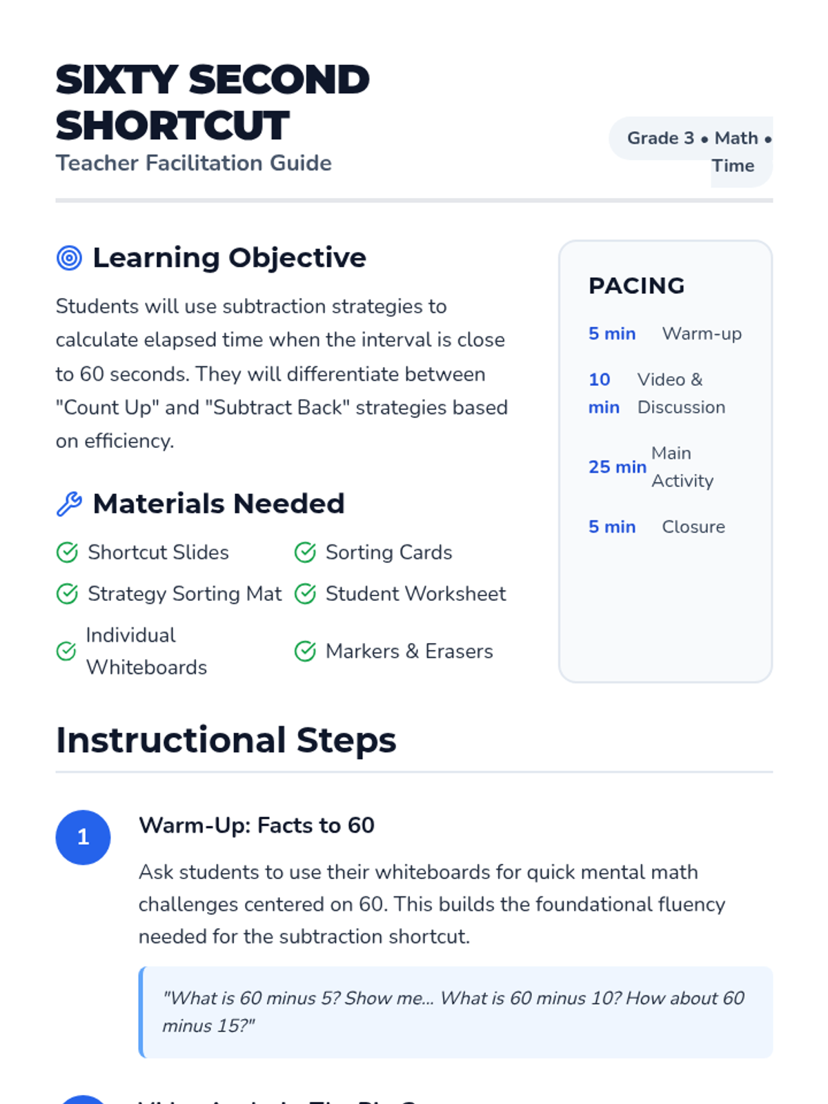 A 3rd-grade math lesson focused on using subtraction as a shortcut for calculating elapsed time in seconds when the interval is close to a full minute. Students will learn to identify when counting up is efficient versus when subtracting from 60 is faster.