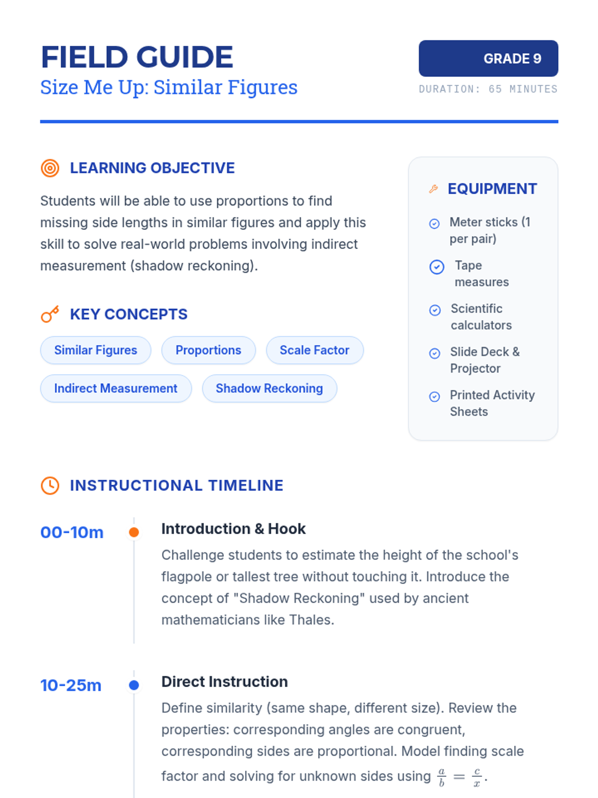 A 9th-grade geometry lesson where students master similar figures and proportions to solve real-world height problems through shadow reckoning and indirect measurement.