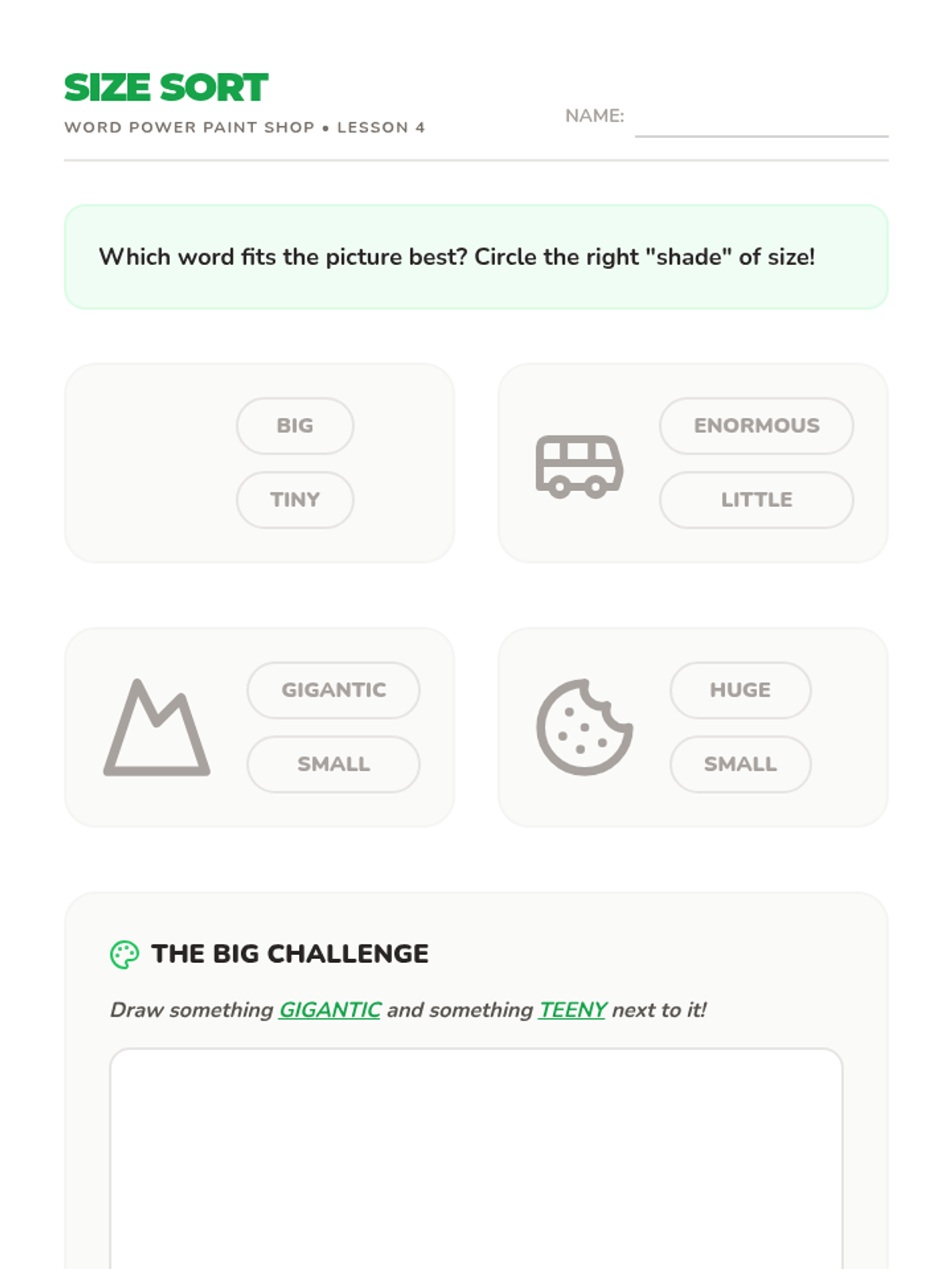 Students match size-related adjectives to objects and animals, practicing the use of precise vocabulary for describing physical attributes.
